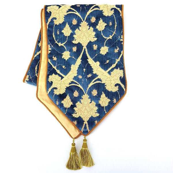 Table Runner with Tassel Trim Blue Silk Brocatelle Luigi Bevilacqua Fabric Fiere Pattern