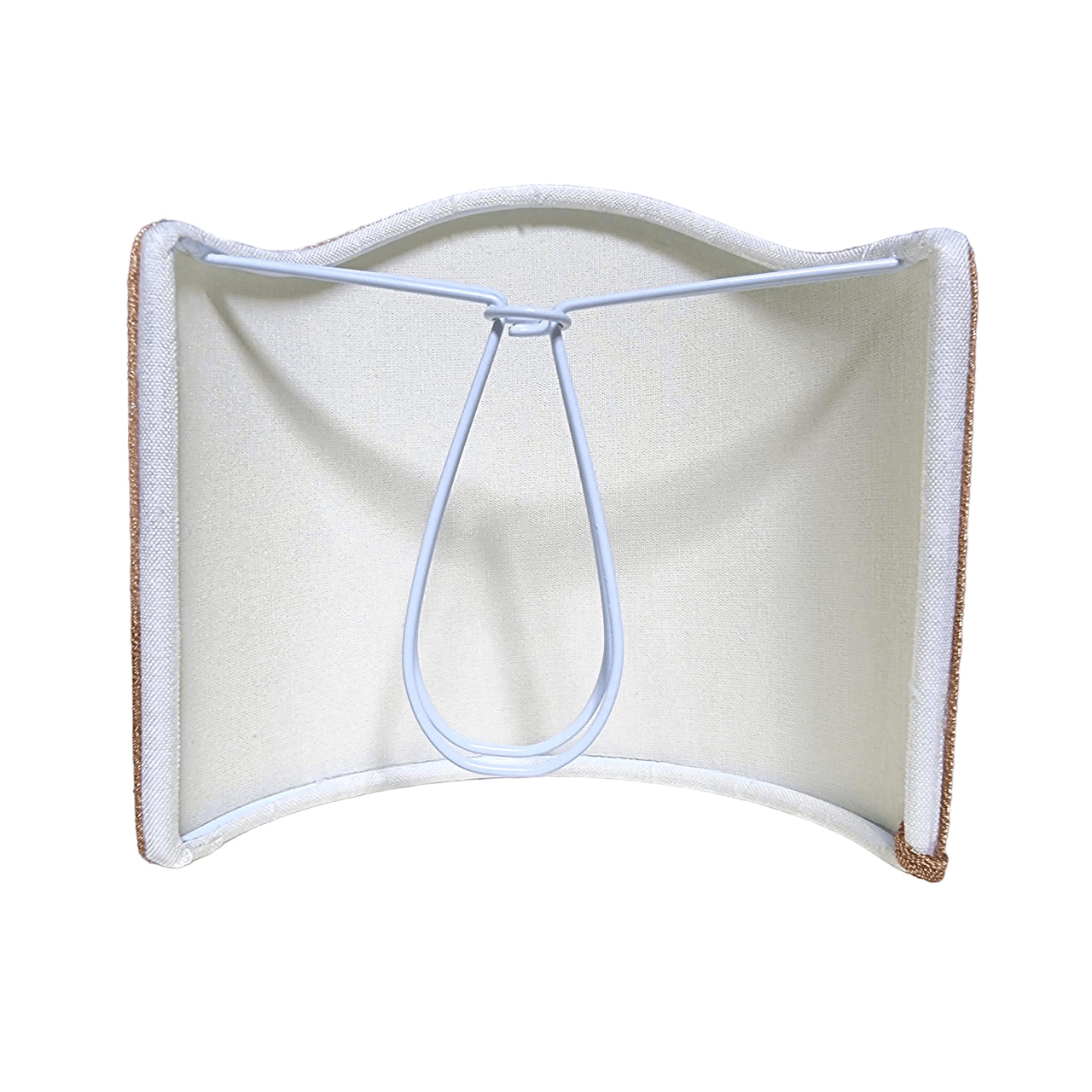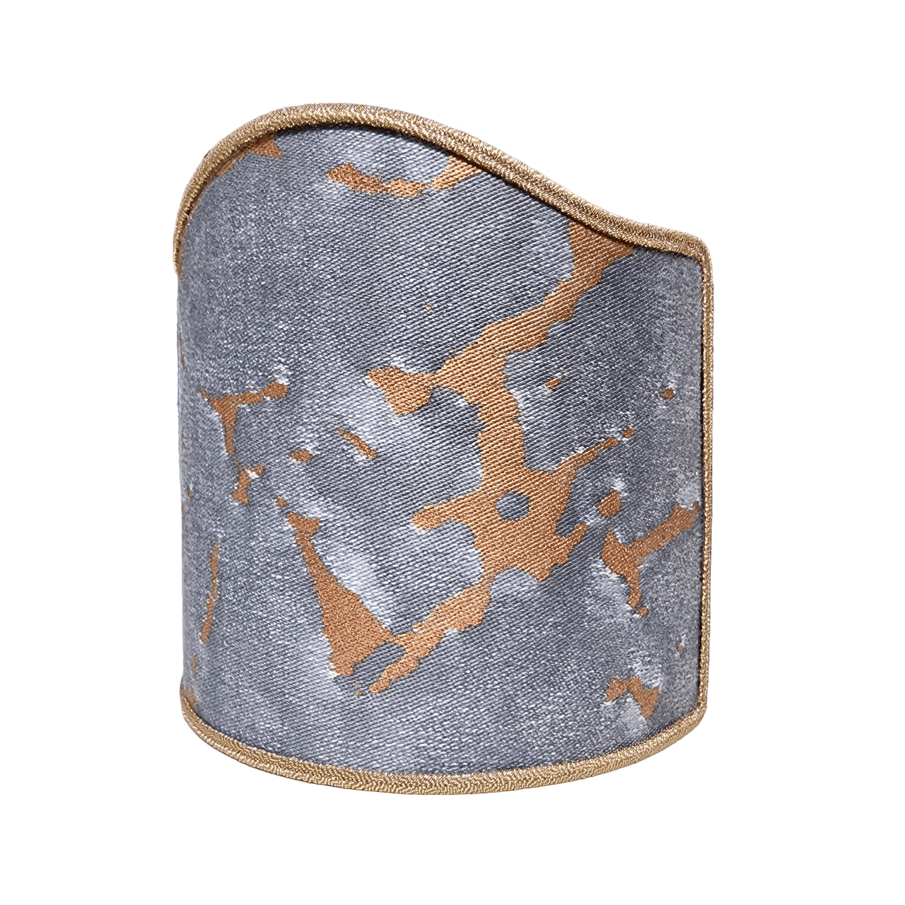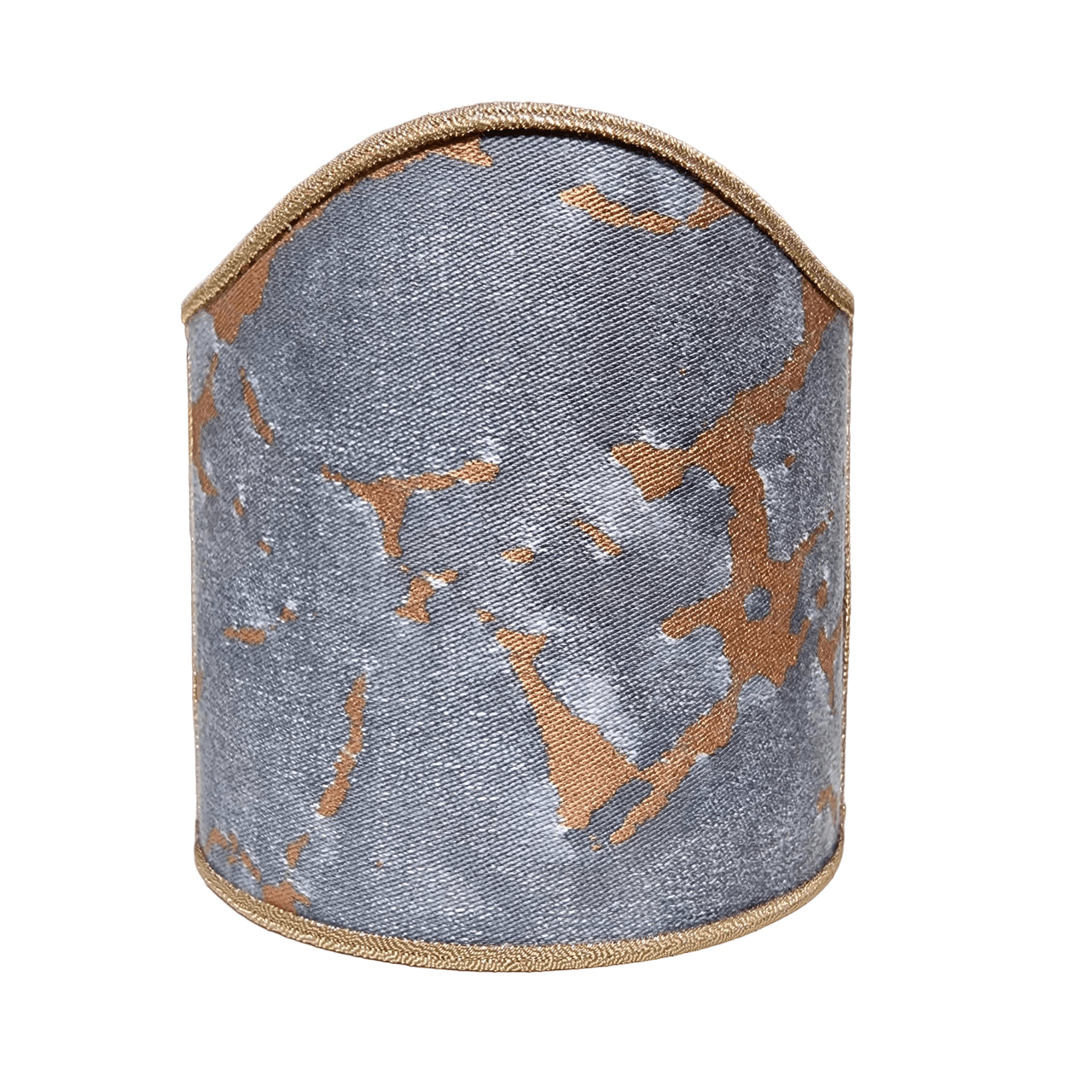Abat jour demi lune à pince fait main avec tissu Fortuny Marmo couleur noir, gris, et cuivre à bordure cuivre