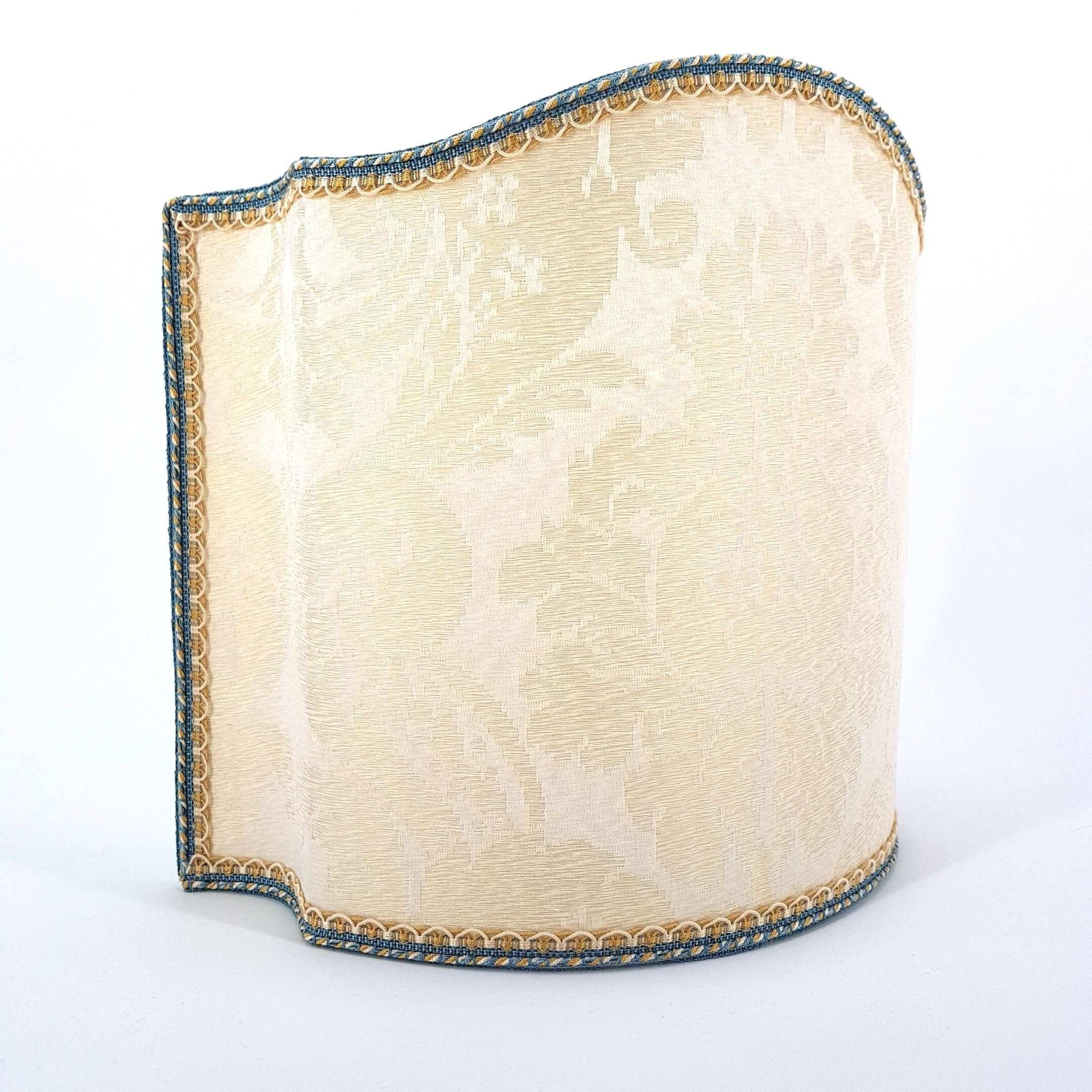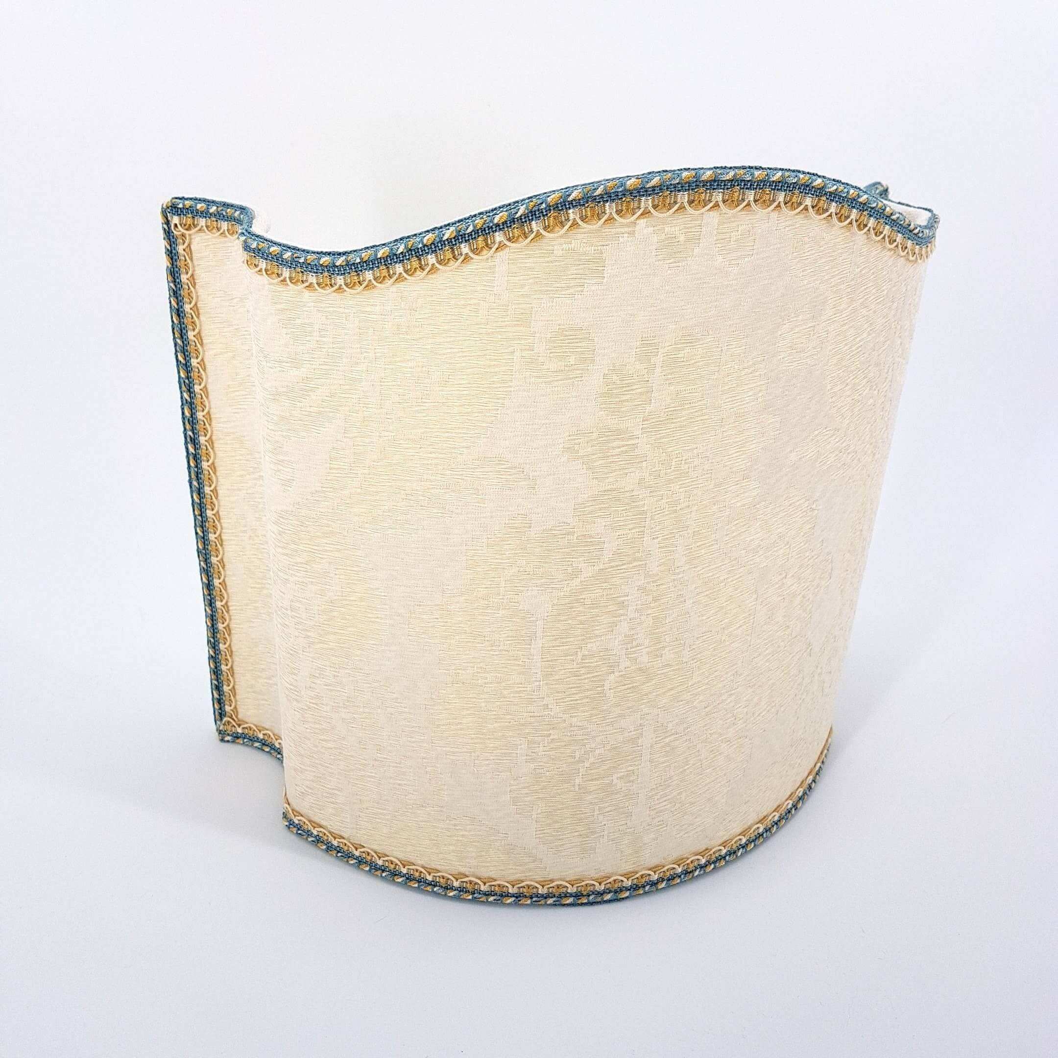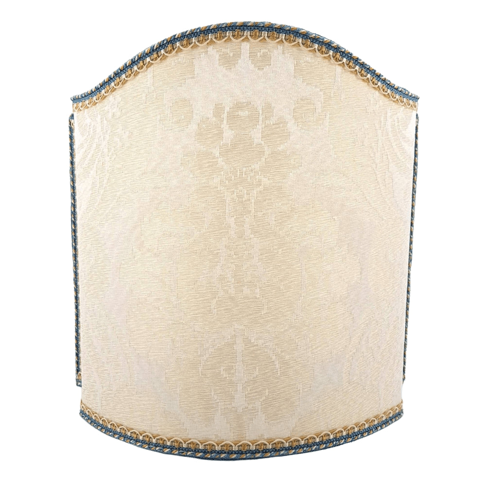 Abat jour fait main avec un tissu damas en soie Rubelli Ruzante couleur beige à bordure couleur bleu