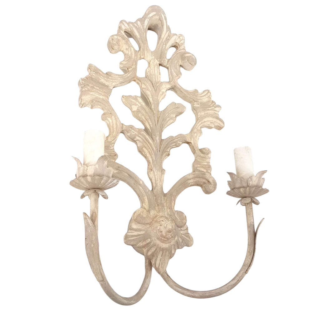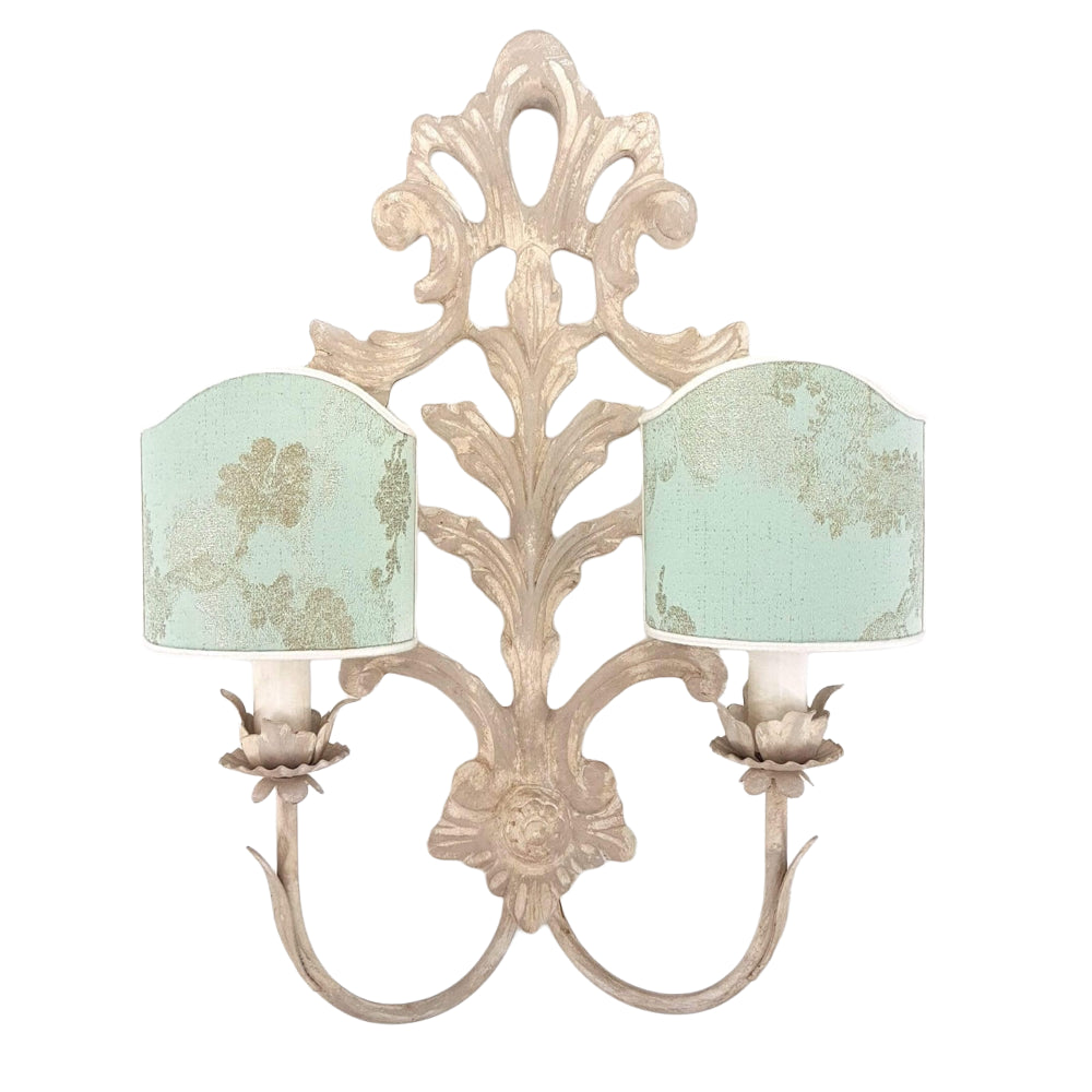 Applique Murale en Bois Sculpté et Patiné Blanc Écru avec Abat Jour Fait Main en Tissu Lampas Rubelli Queen Anne Aquamarine