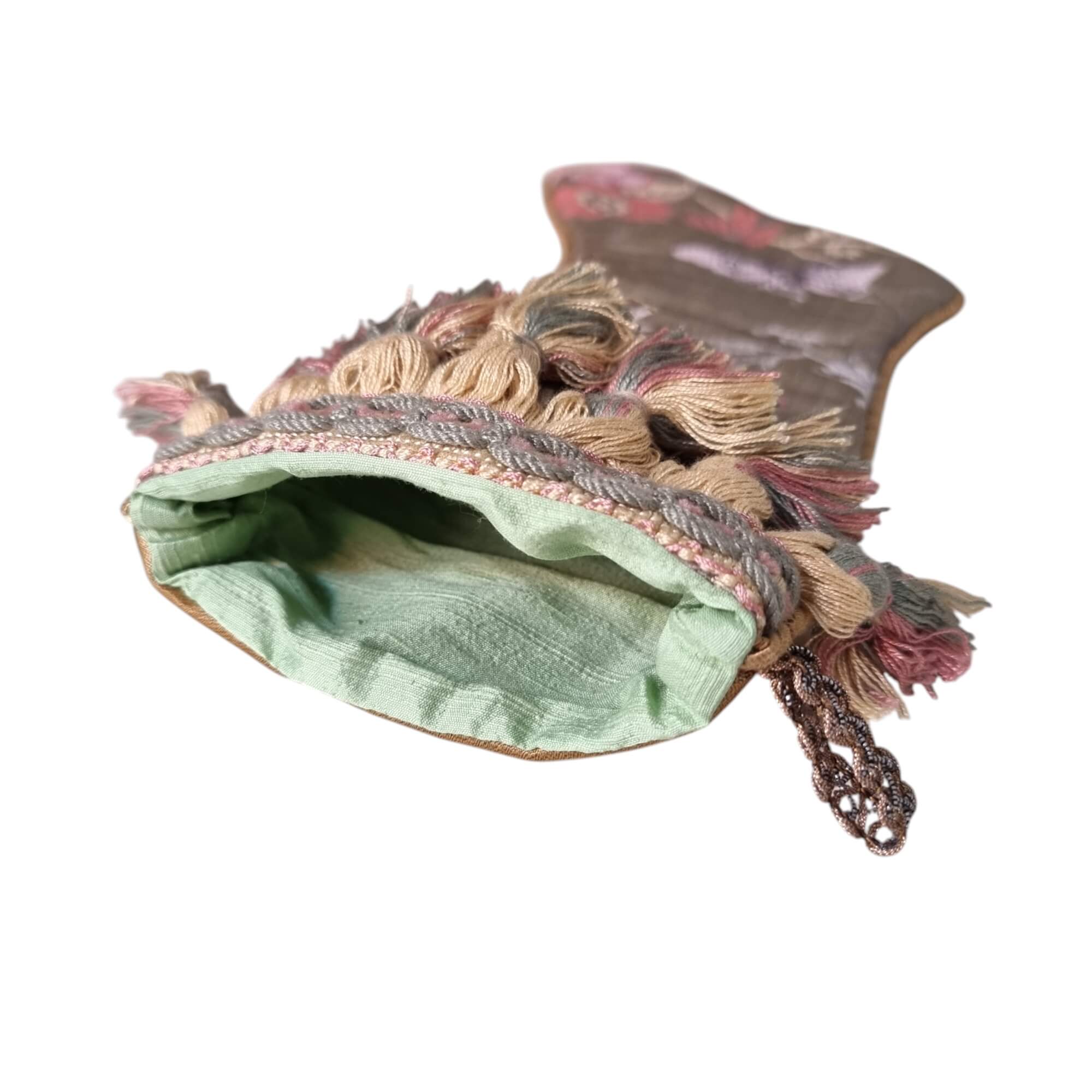 Chaussette de Noël en tissu lampas de soie Luigi Bevilacqua Uccelli couleur vert jade avec frange à mèches multicolore, face arrière en tissu Rubelli couleur or.