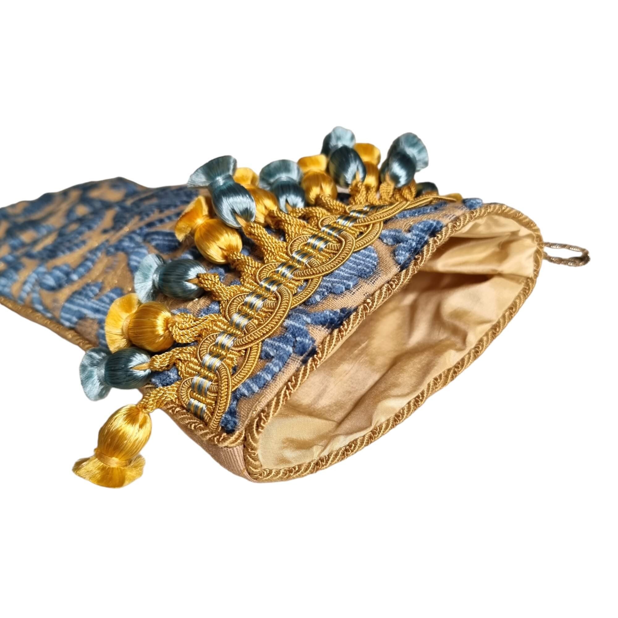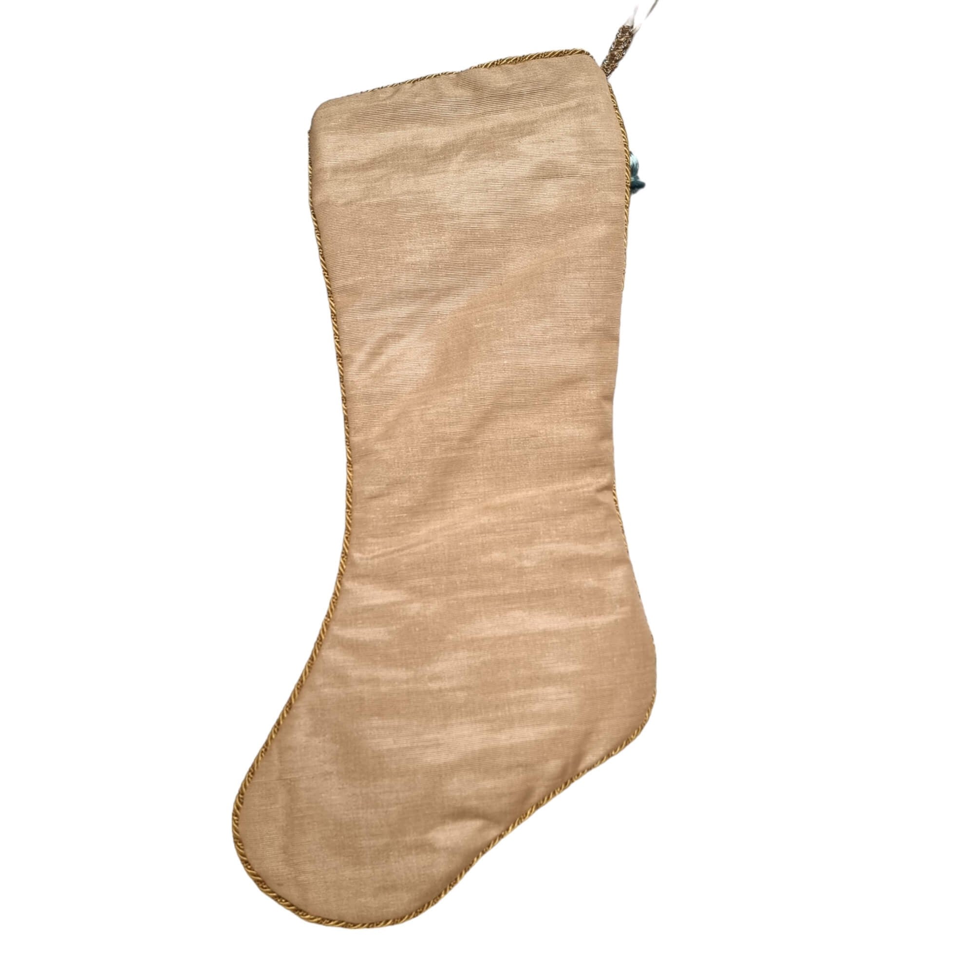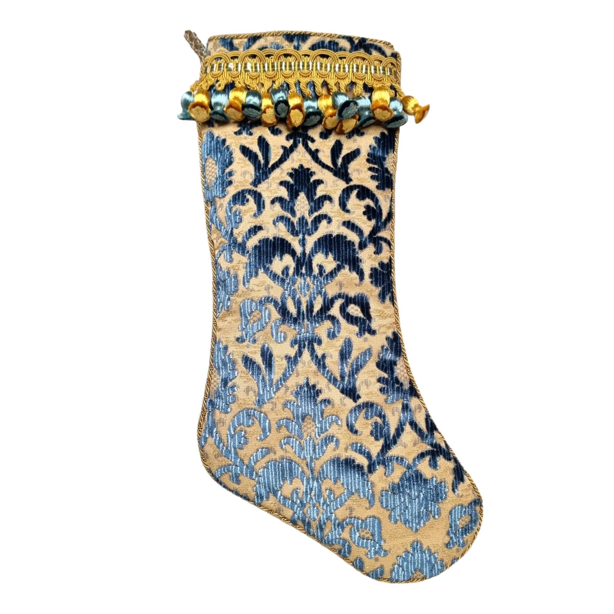 Chaussette de Noël en velour de soie Luigi Bevilacqua Rinascimento couleur bleu indigo avec frange Houlès, face arrière en tissu moiré Rubelli couleur beige.