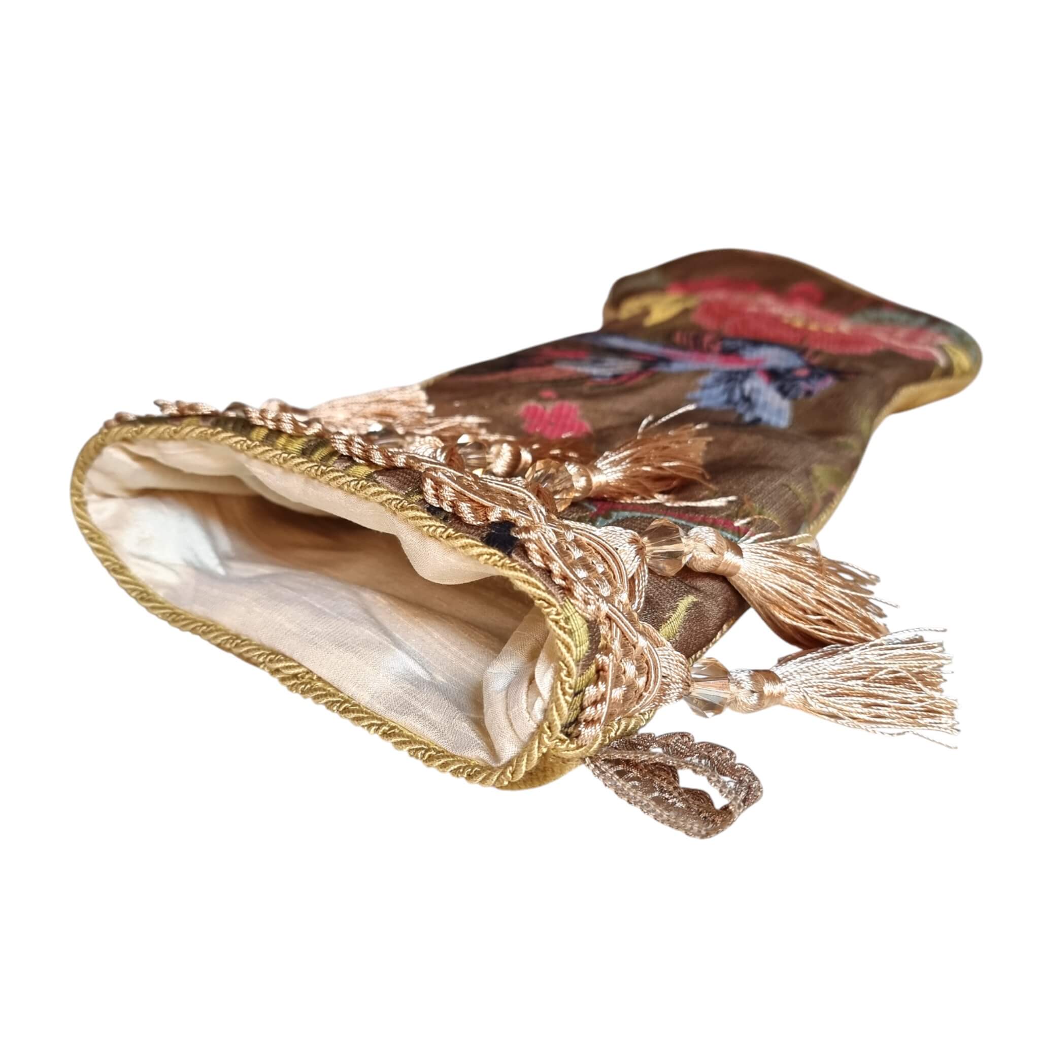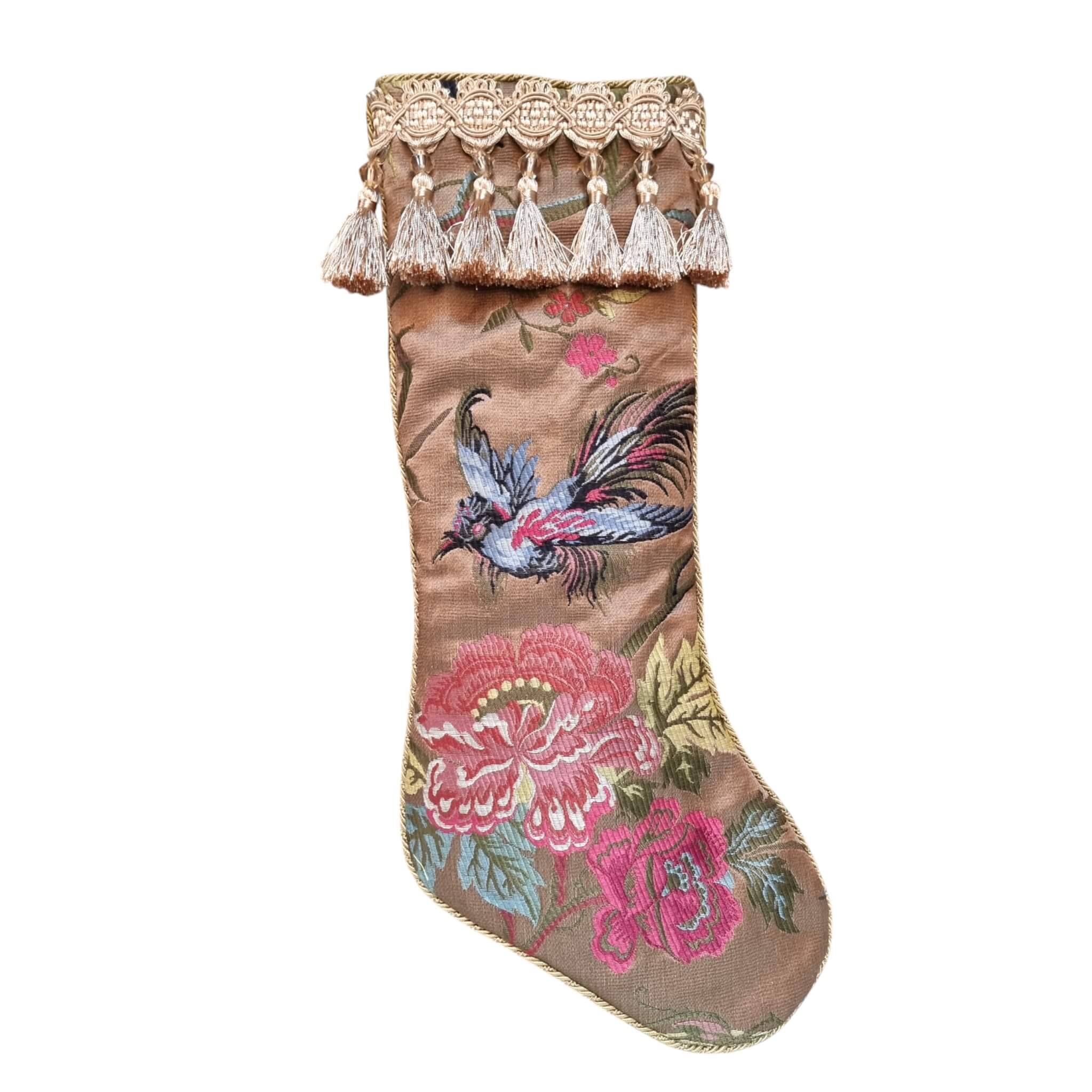 Chaussette de Noël Fait Main avec gland en brocart de soie marron noisette Luigi Bevilacqua Motif Uccelli