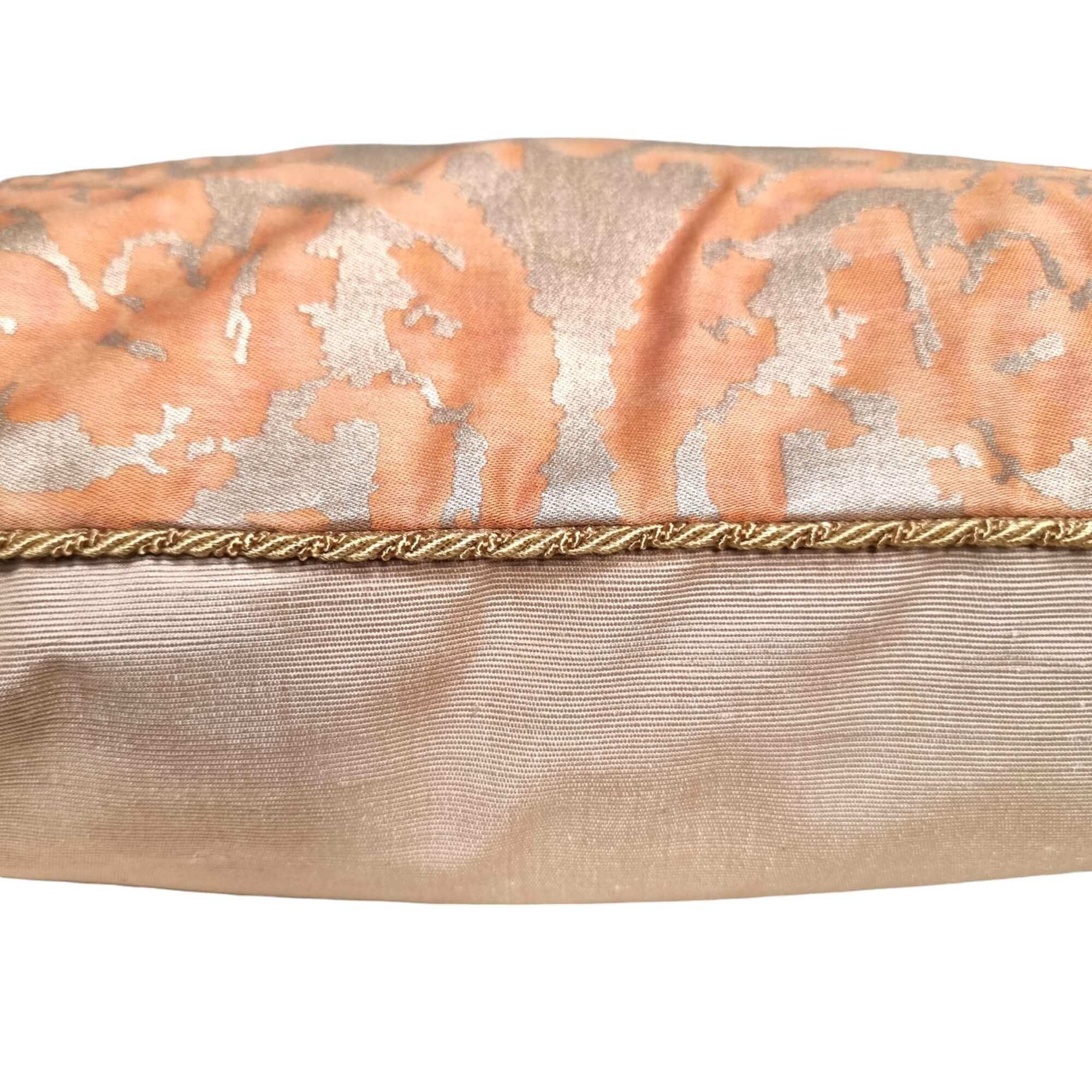 Housse de coussin en tissu Fortuny Farnese couleur orange et or, face arrière en tissu moiré Rubelli