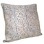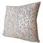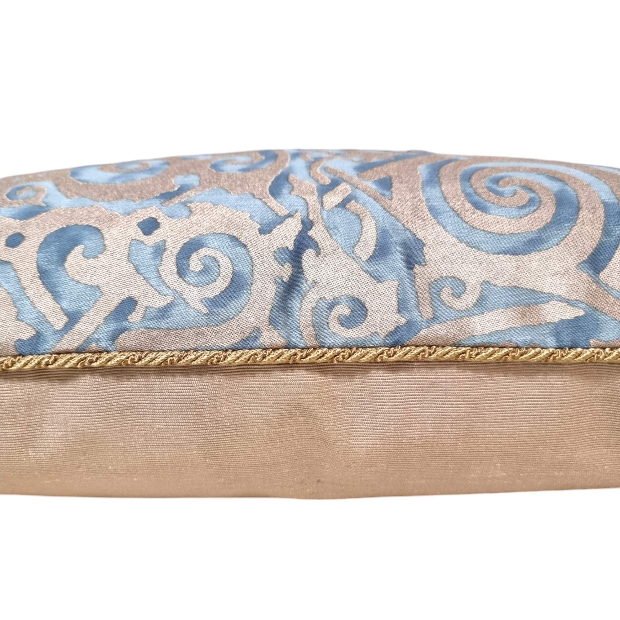 Housse de coussin en tissu Fortuny Maori couleur bleu et or, face arrière en tissu satin Rubelli couleur sable