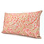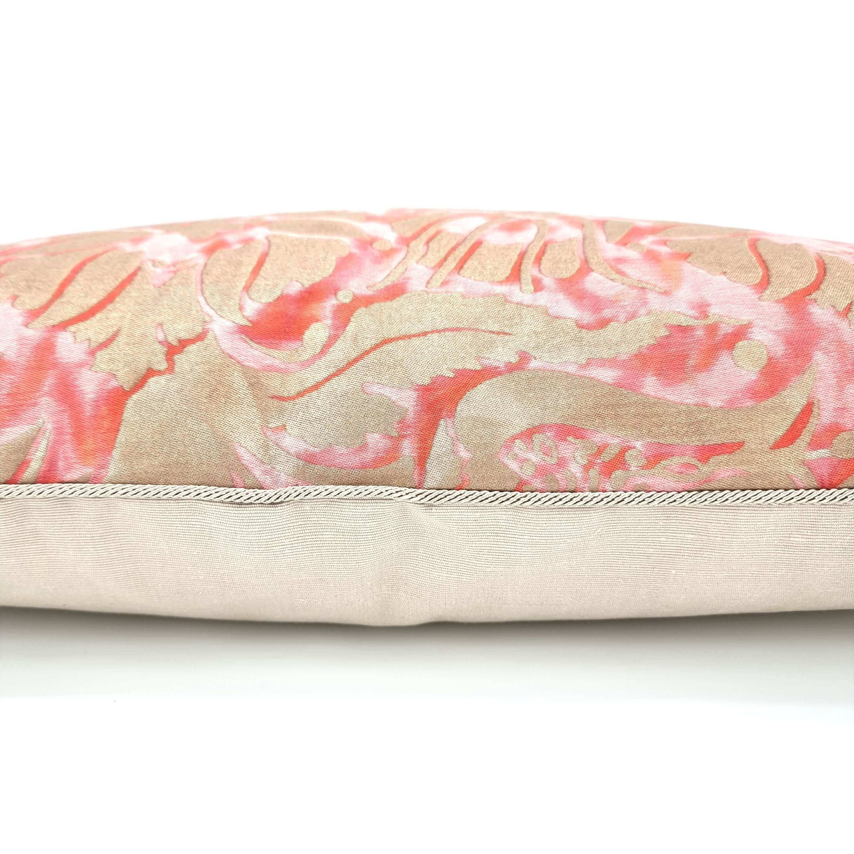 Housse de coussin en tissu Fortuny Melagrana couleur rouge corail et or, face arrière en tissu Rubelli moiré couleur sable