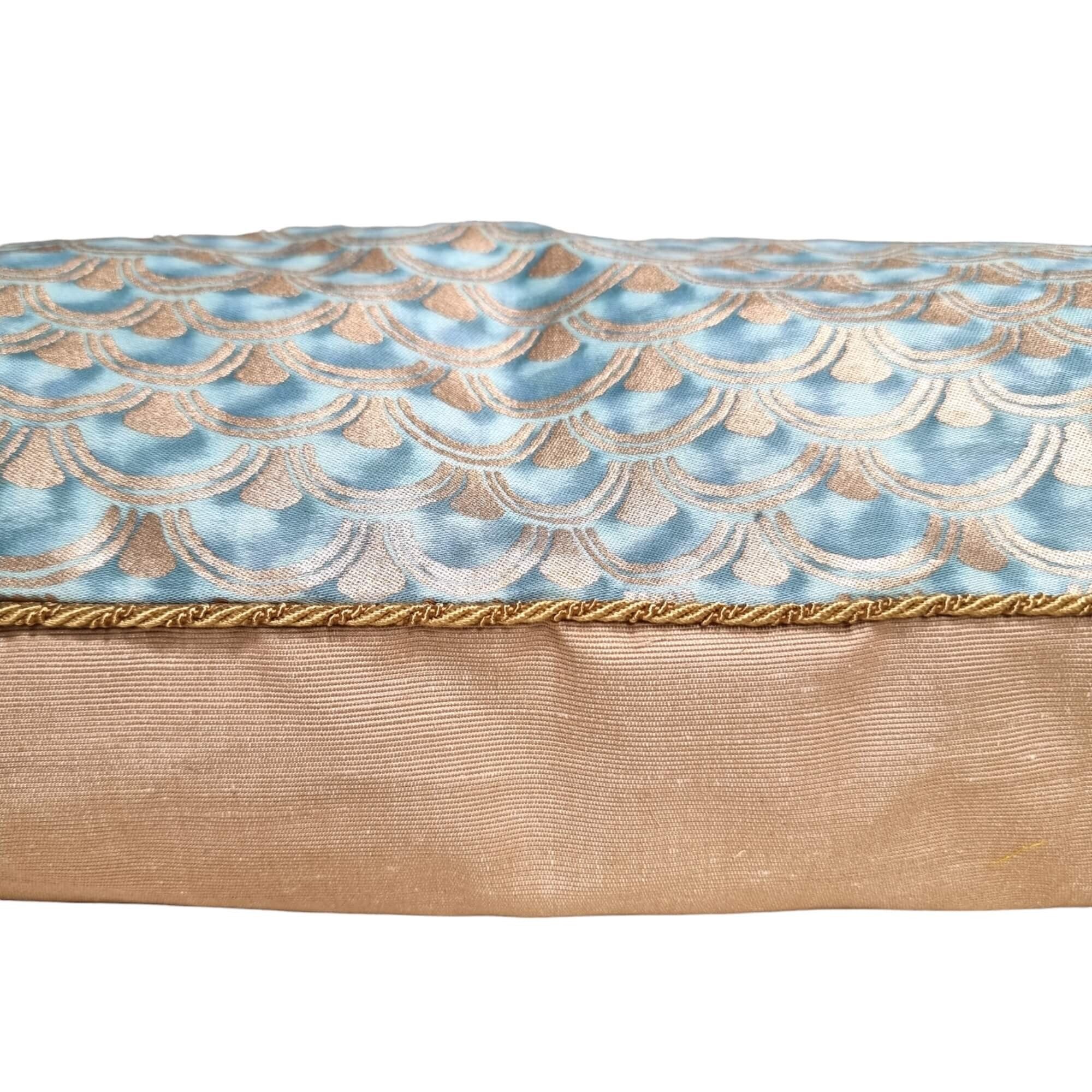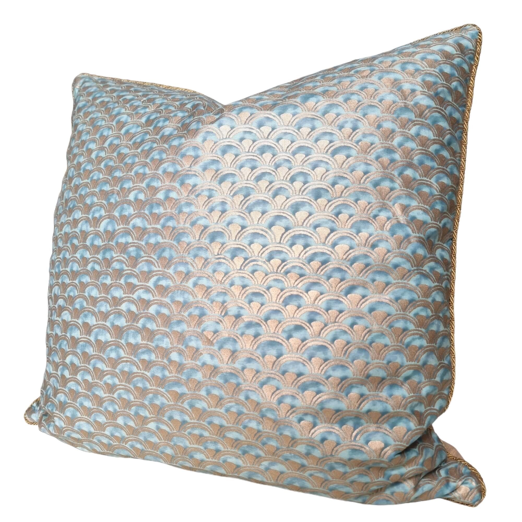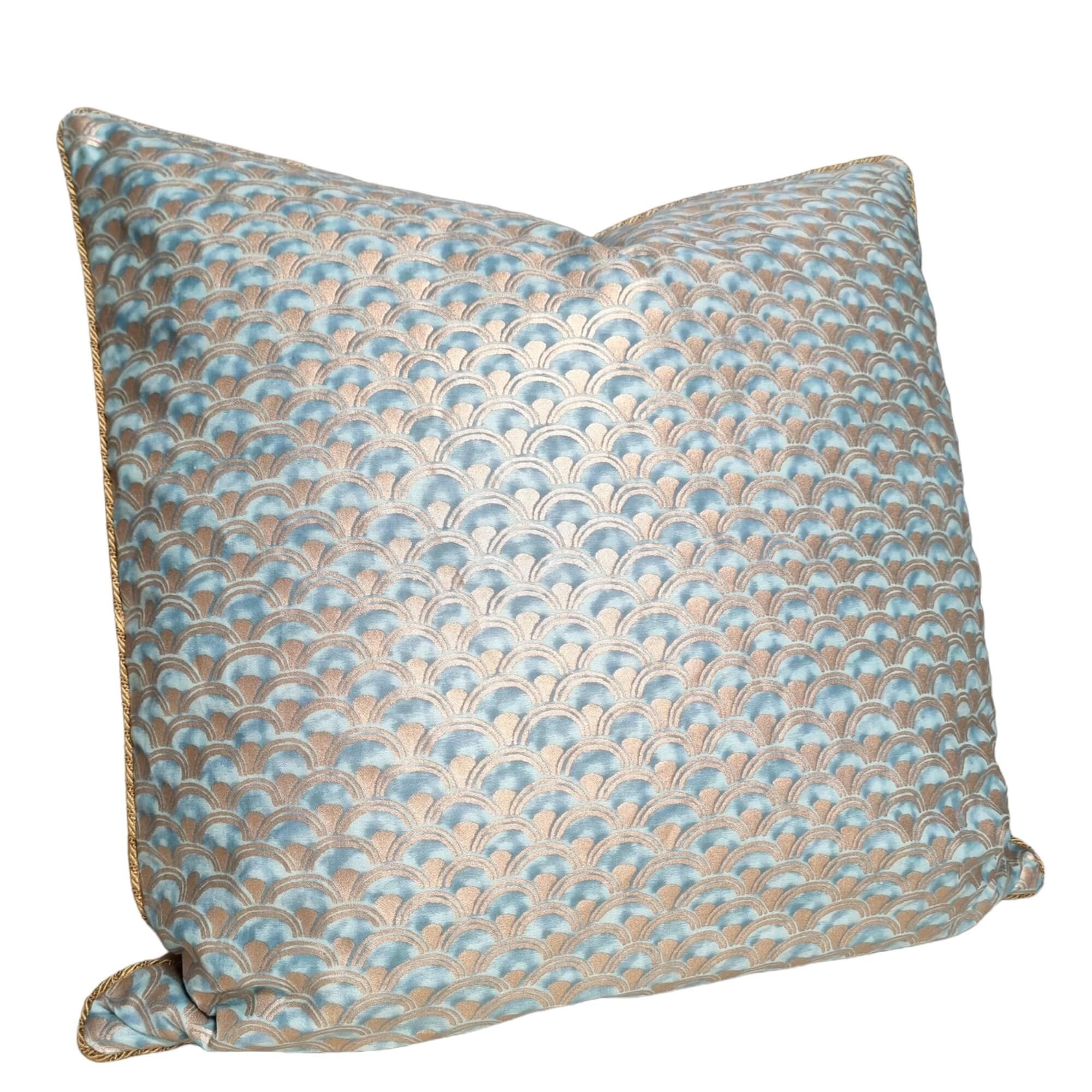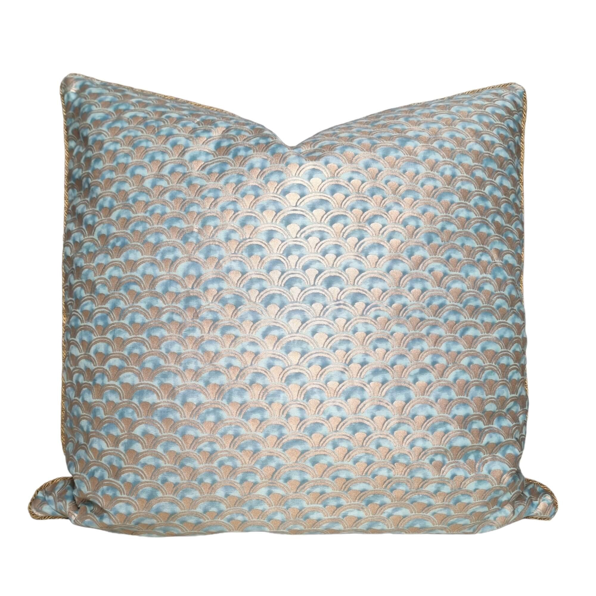 Housse de Coussin Fait Main en Tissu Fortuny Papiro Bleu-Vert et Or