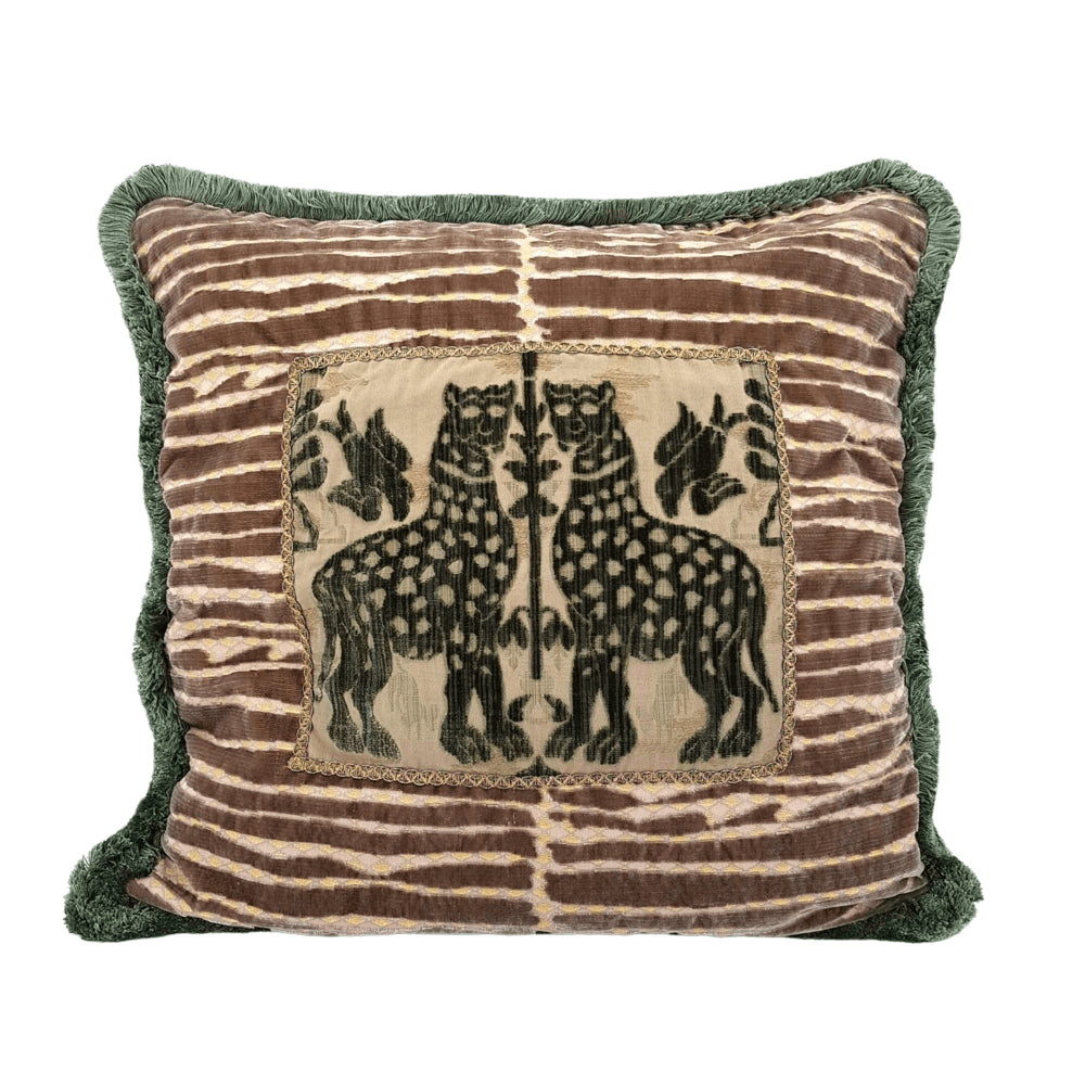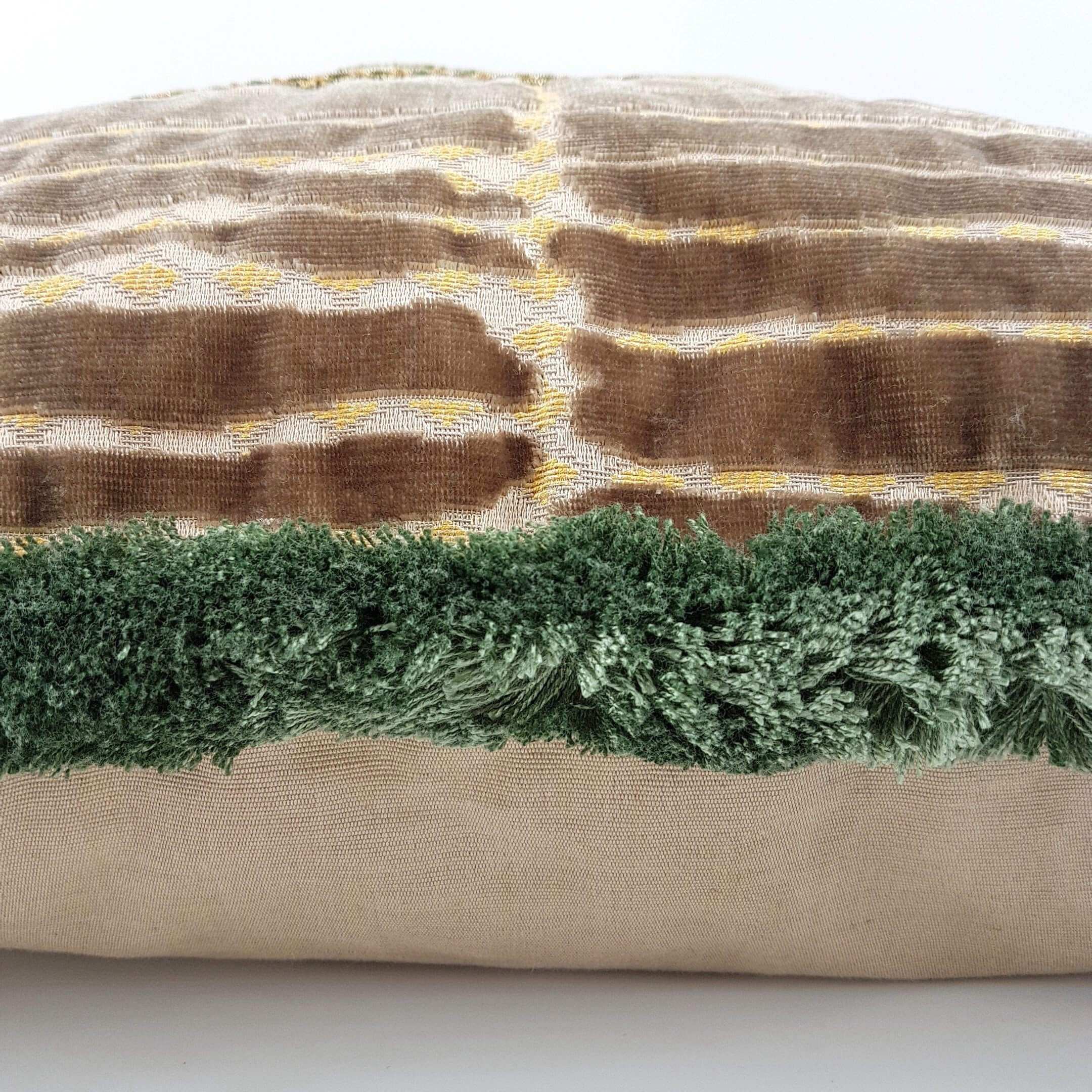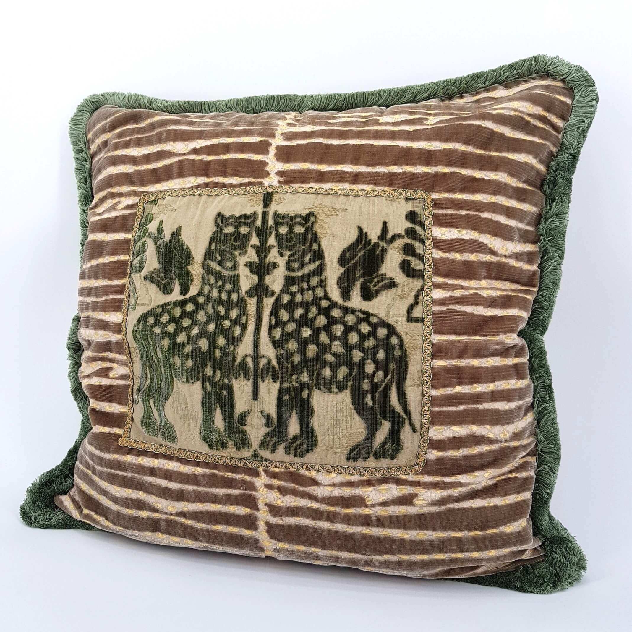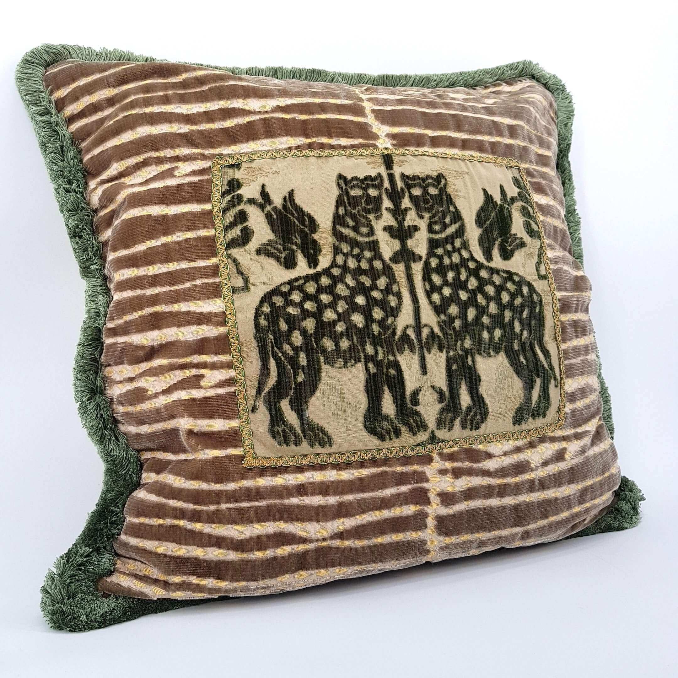 Le coussin a été enrichi avec un panneau en velour de soie Luigi Bevilacqua représentant le motif "Fiere" couleur vert aux bordures gallonées