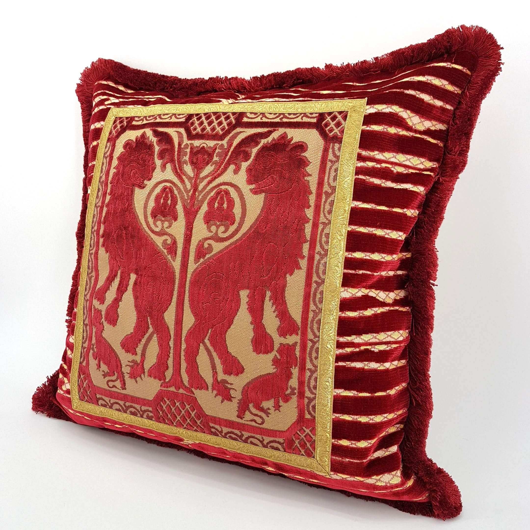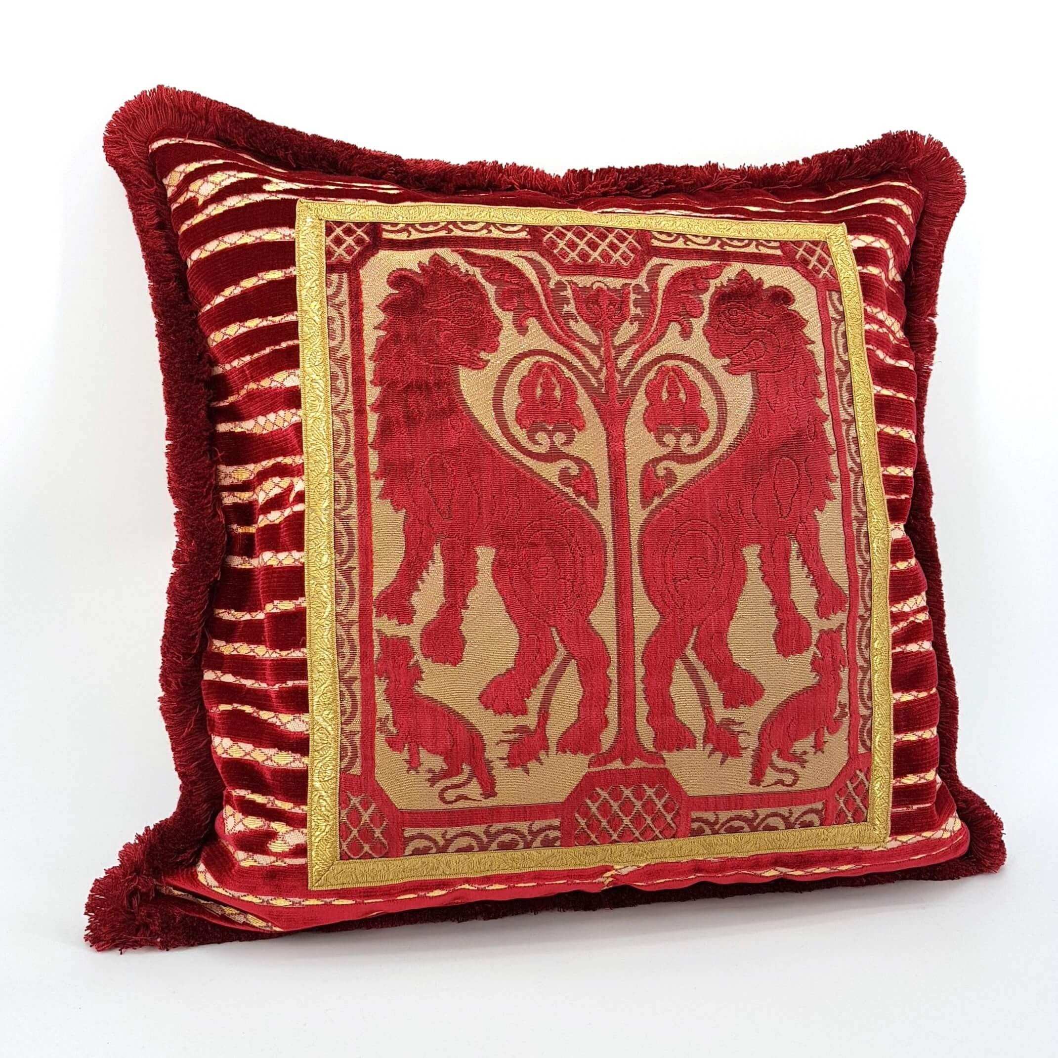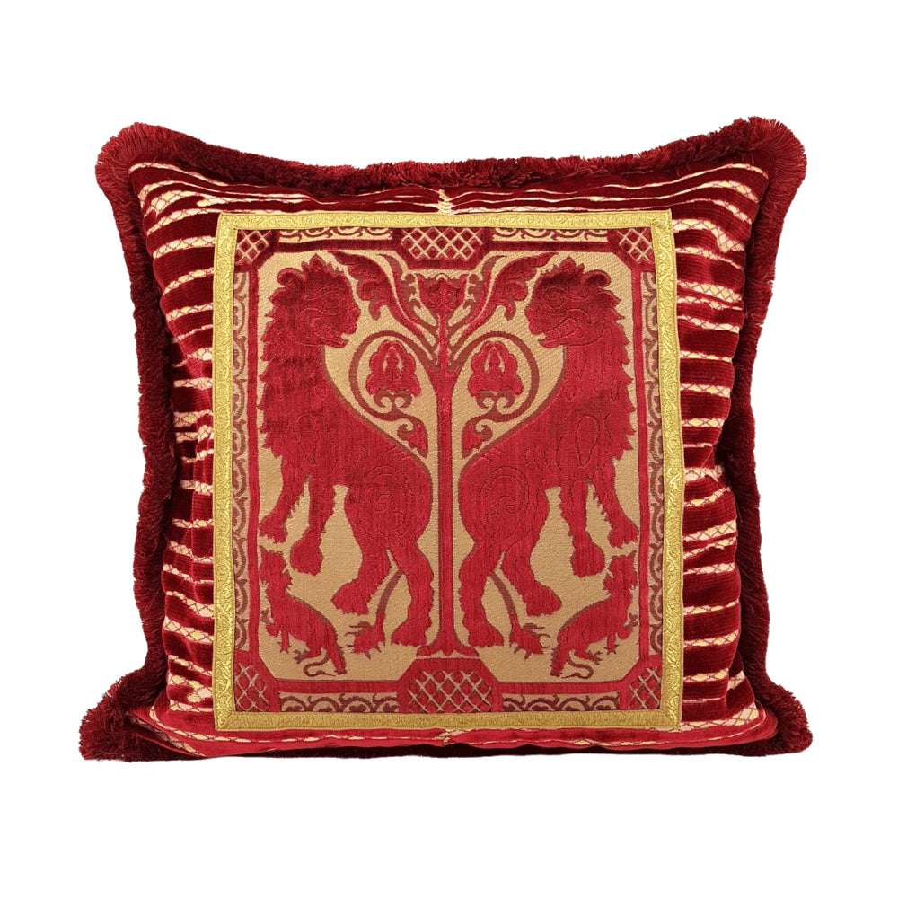 Le coussin a été enrichi avec un panneau en velour de soie Luigi Bevilacqua représentant le motif "Leoni Bizantini" couleur rouge grenade aux bordures gallonées or