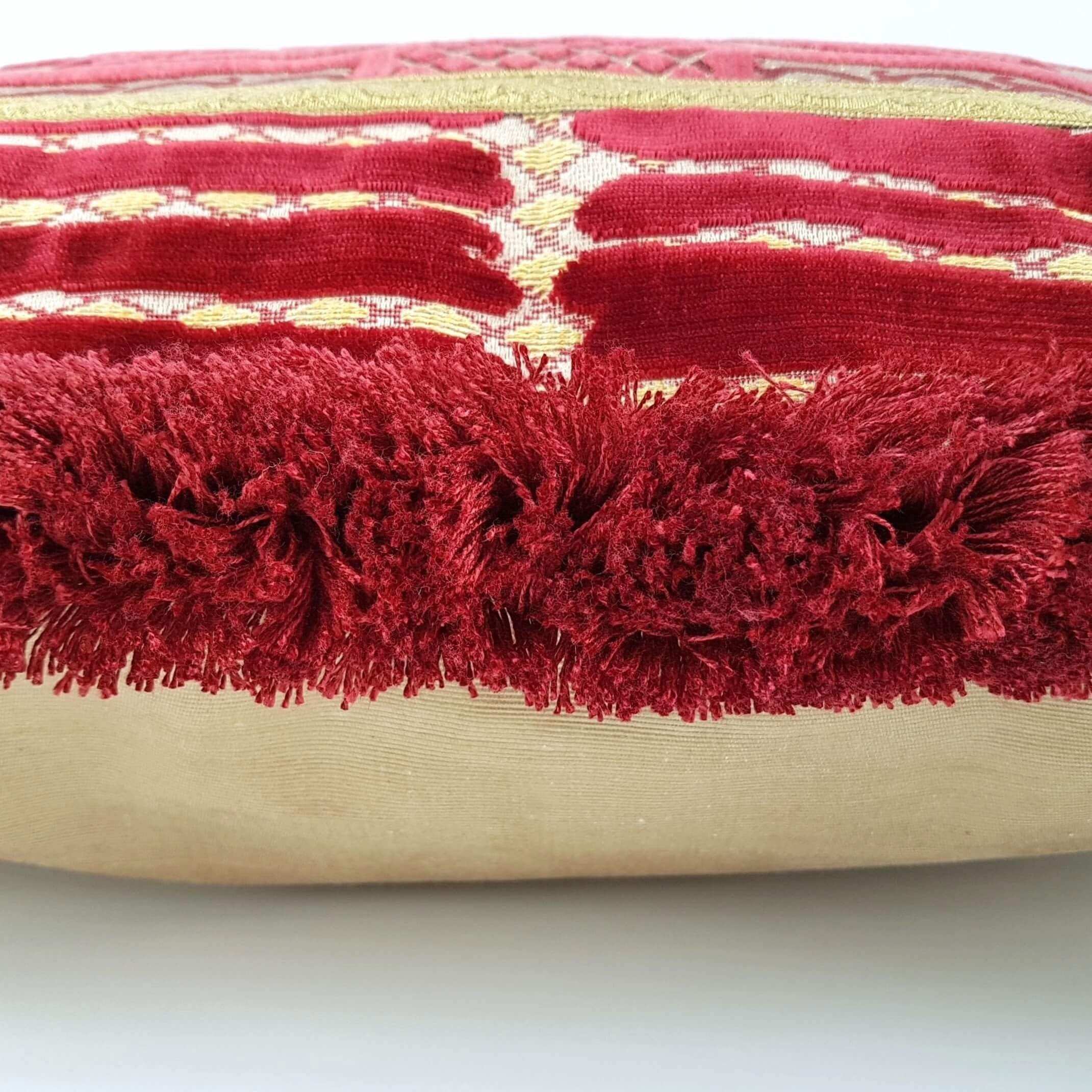 Housse de coussin en velour jacquard Rubelli Modern Art couleur rouge rubis avec frange marabout couleur rouge, face arrière en tissu moiré Rubelli couleur beige.