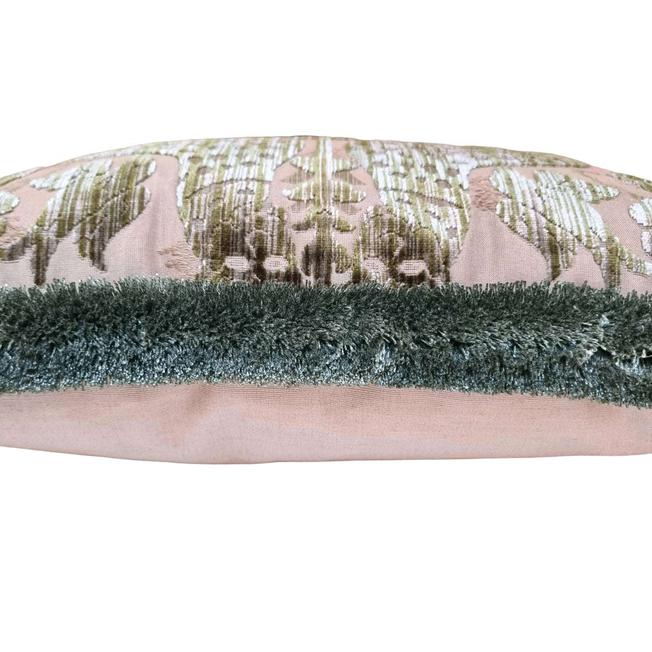 Housse de coussin fait main avec un velour de soie Luigi Bevilacqua Fiere couleur vert olive avec frange marabout vert, face arrière en tissu moiré Rubelli