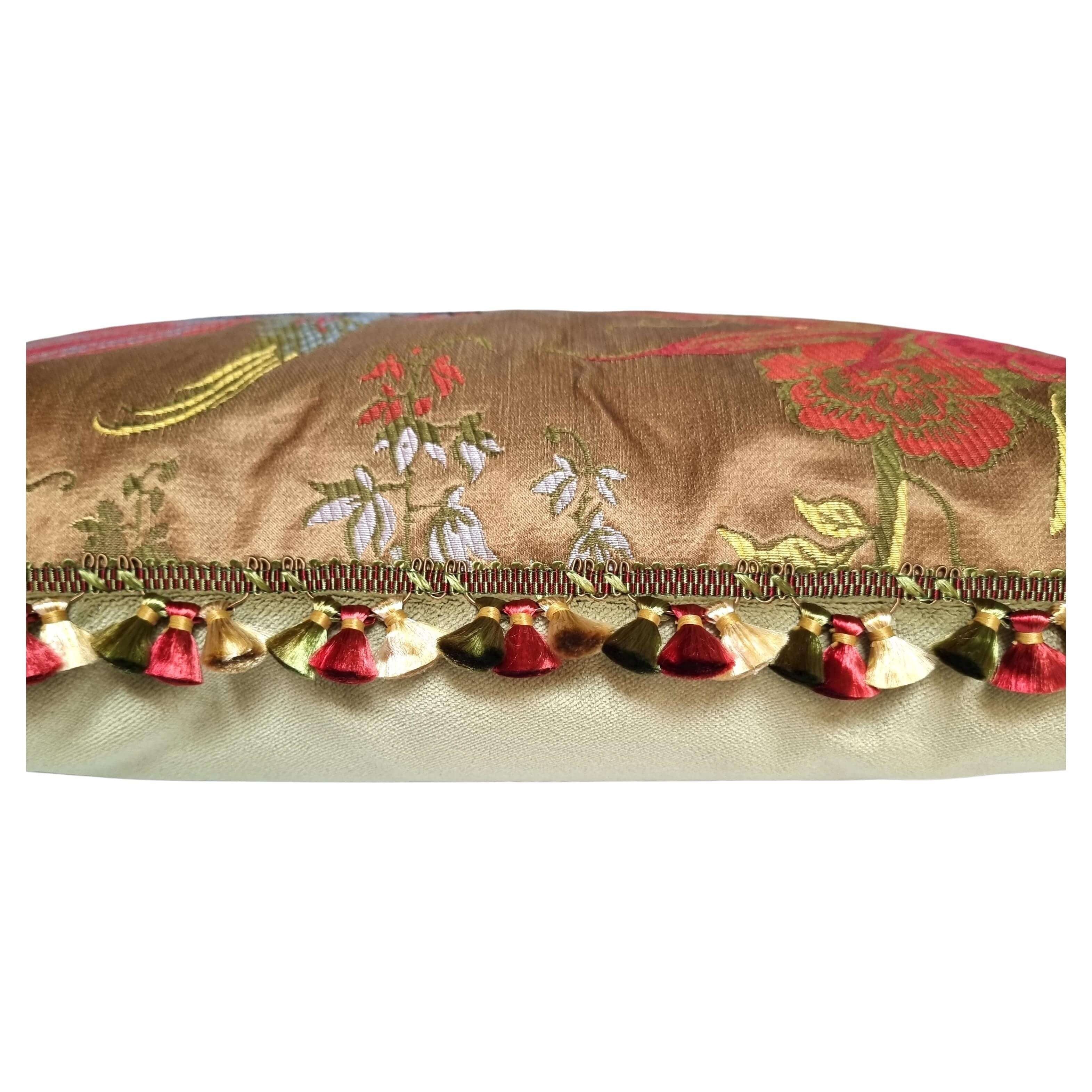 Fodera per cuscino in tessuto lampasso di seta Luigi Bevilacqua Uccelli color marrone nocciola rifinita con frangia Houlès multicolore, retro in velluto Rubelli color verde