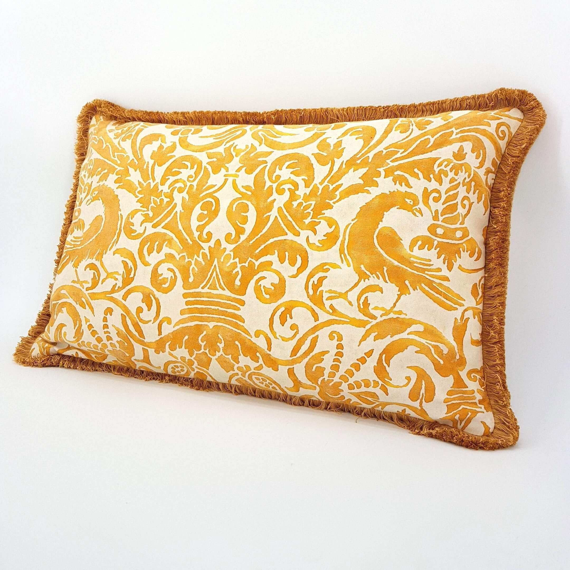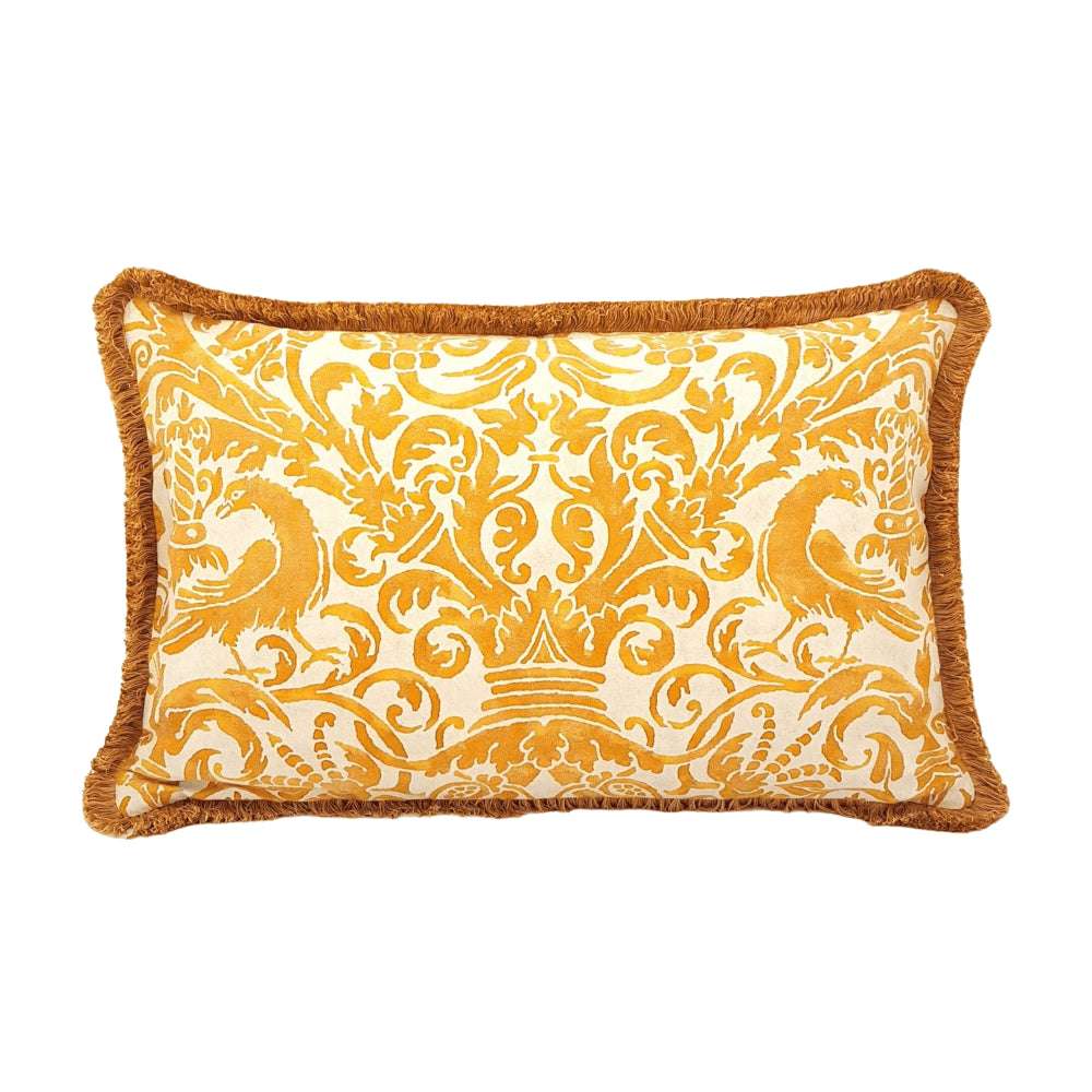 This customizable throw pillow cover is handmade using Fortuny fabric Uccelli pattern in yellow and white color embellished with yellow brush fringe, the back of the pillow is made with ivory moiré Rubelli fabric