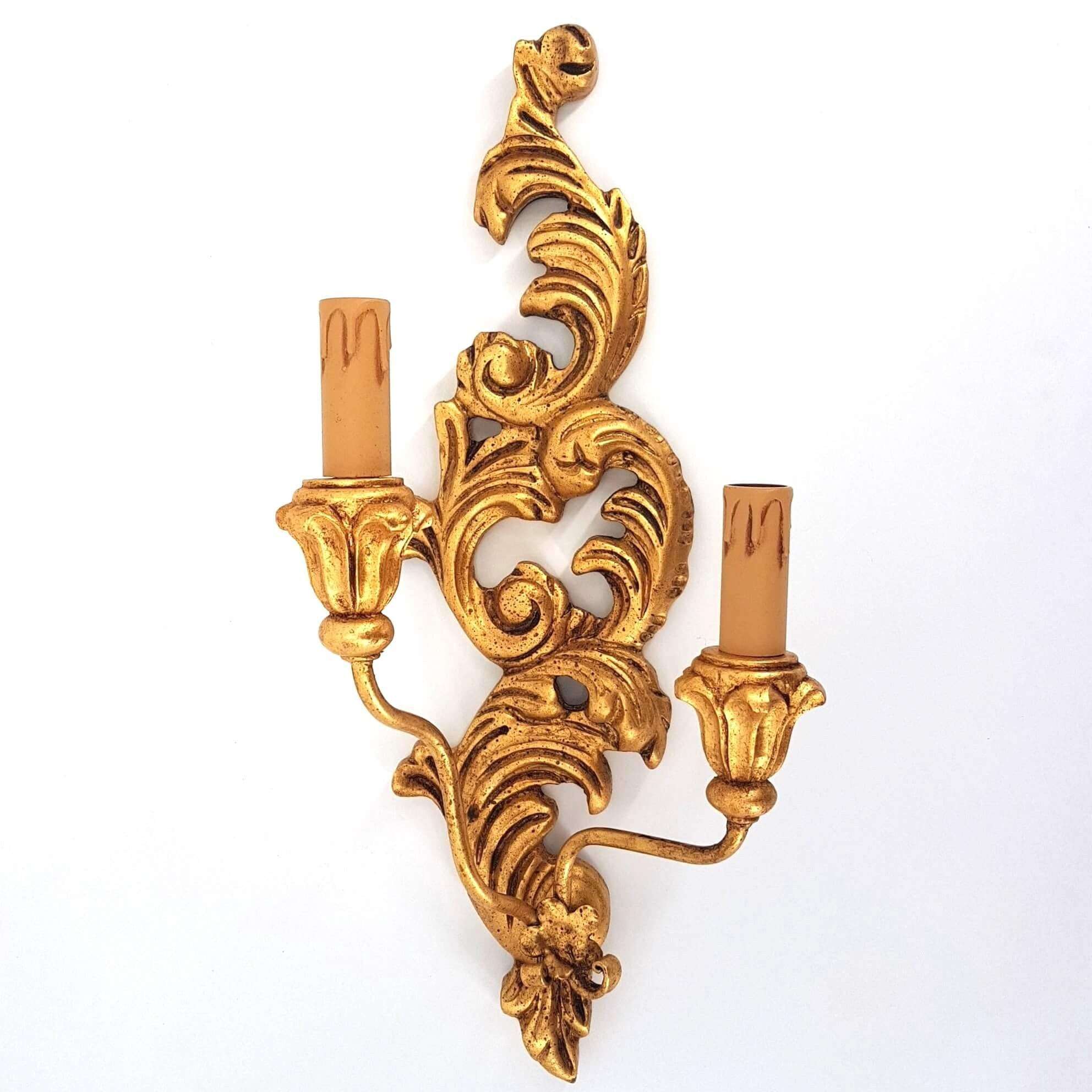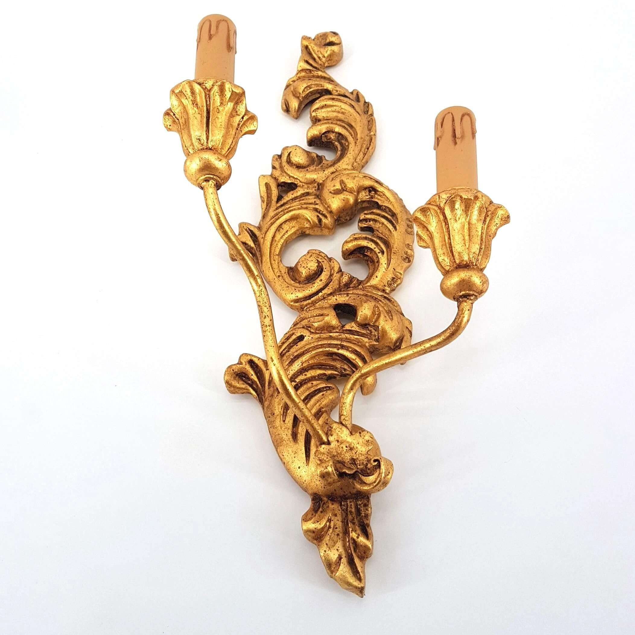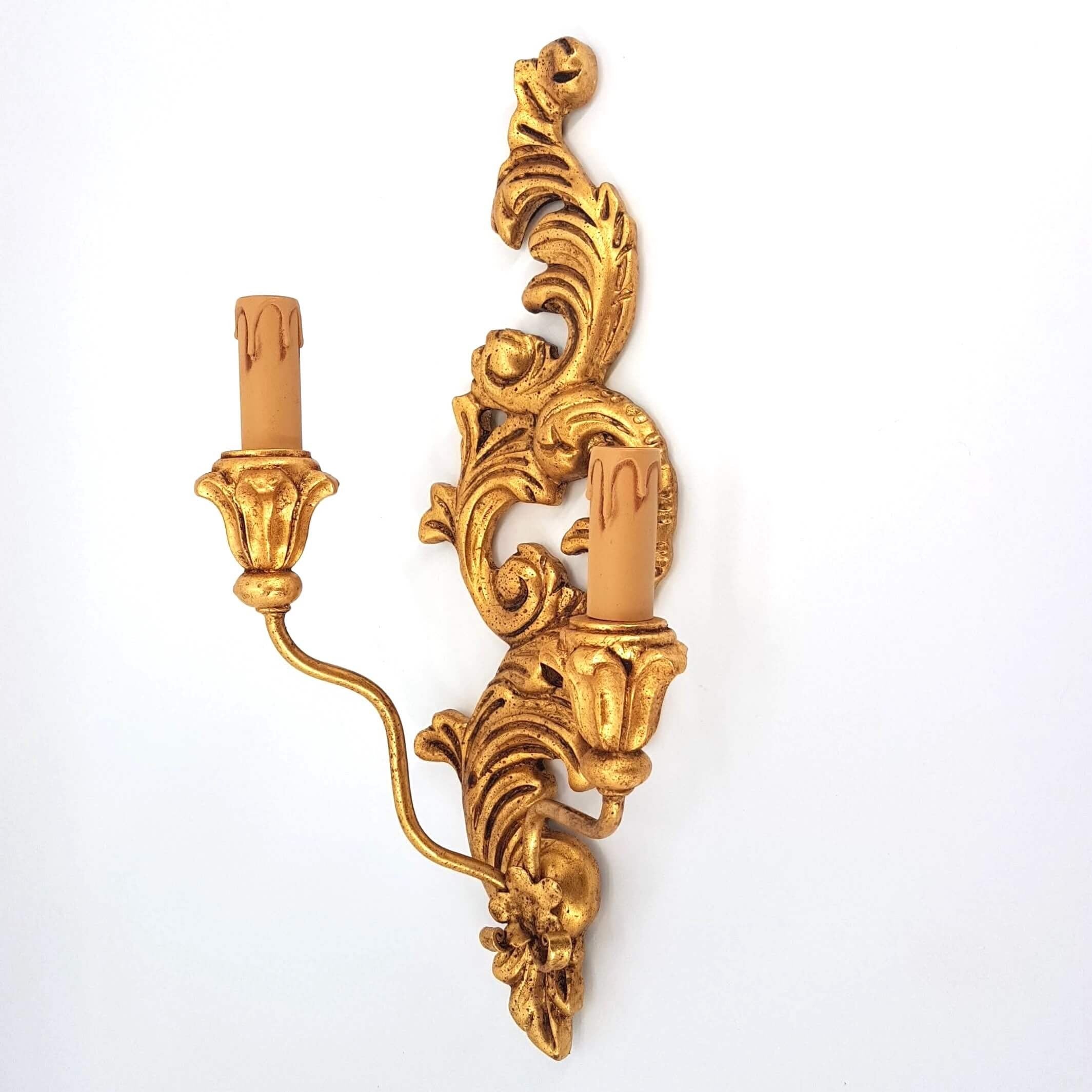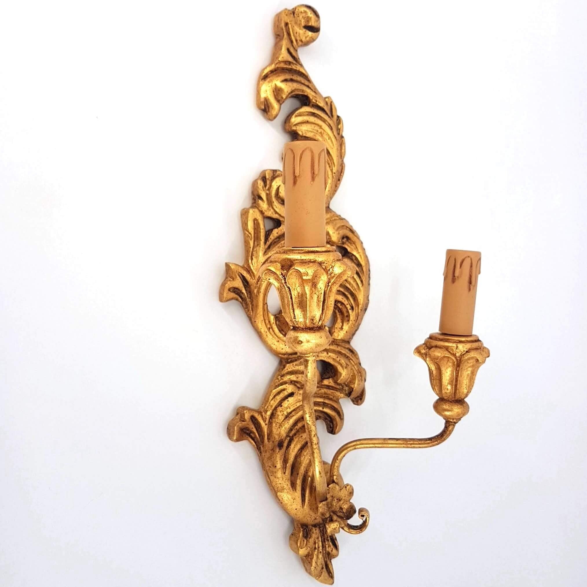 This is an absolutely fabulous gold leaf carved wood 2 arm wall sconce, handcrafted in Tuscany. It's finished with decorative acanthus carvings and curved iron arms with wooden candle sockets.