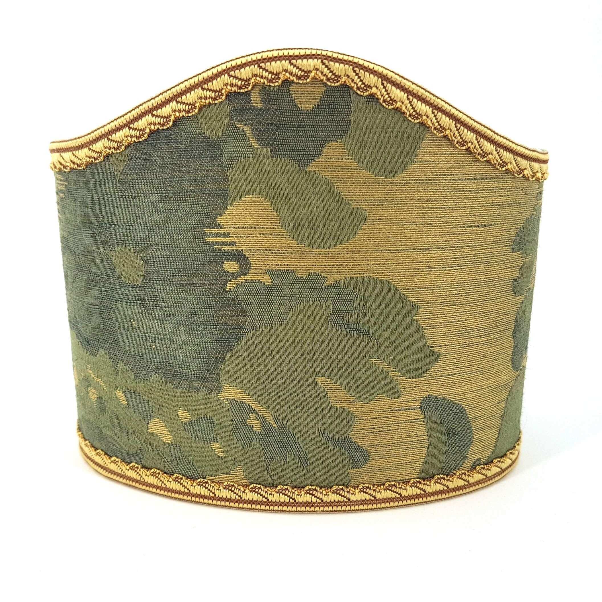 The clip on lampshades are handmade using Luigi Bevilacqua silk brocatelle fabric Giardino pattern, 18th century design, in antique green color finished with green gold trim, with a fitting that clips over the light bulb