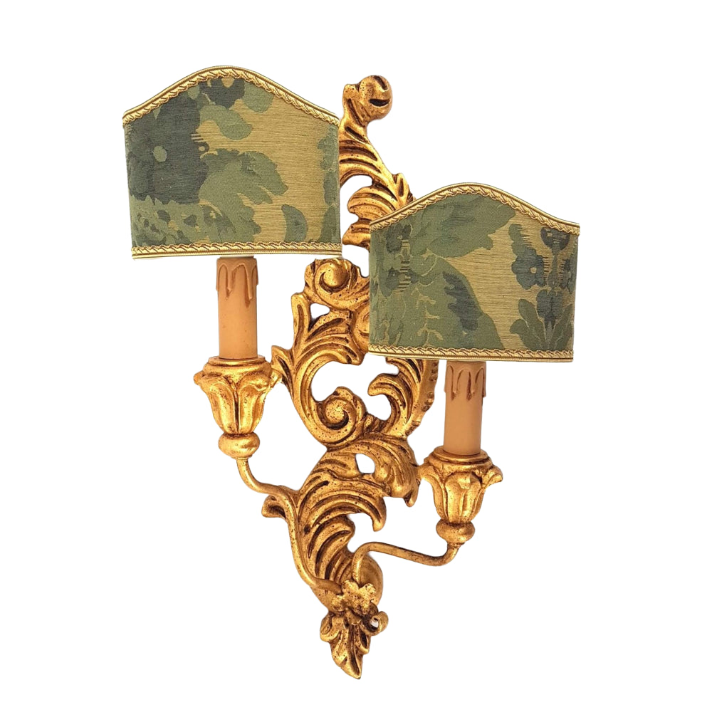 Carved Gilt Wood Wall Sconce with Bevilacqua Fabric Lampshades Antique Green Giardino Pattern