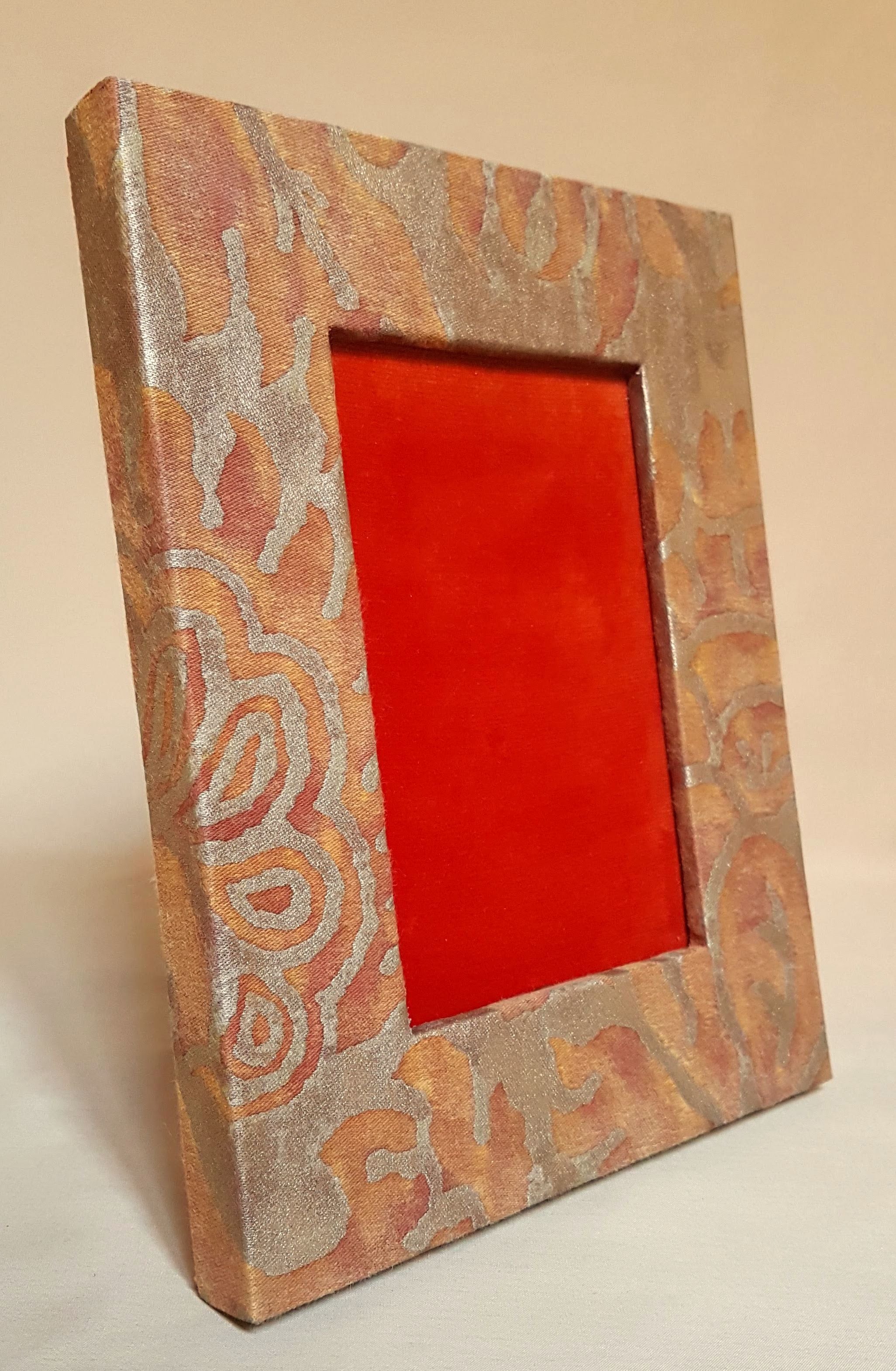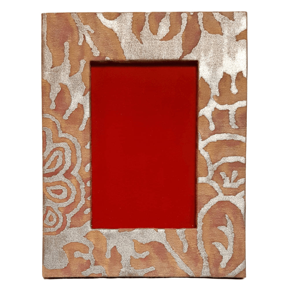 Fortuny Fabric Covered Tabletop Picture Photo Frame Burnt Apricot & Silvery Gold Barberini Pattern