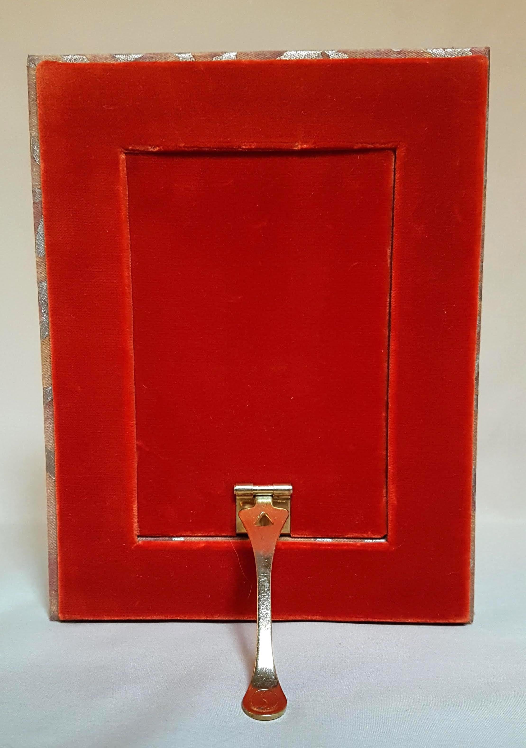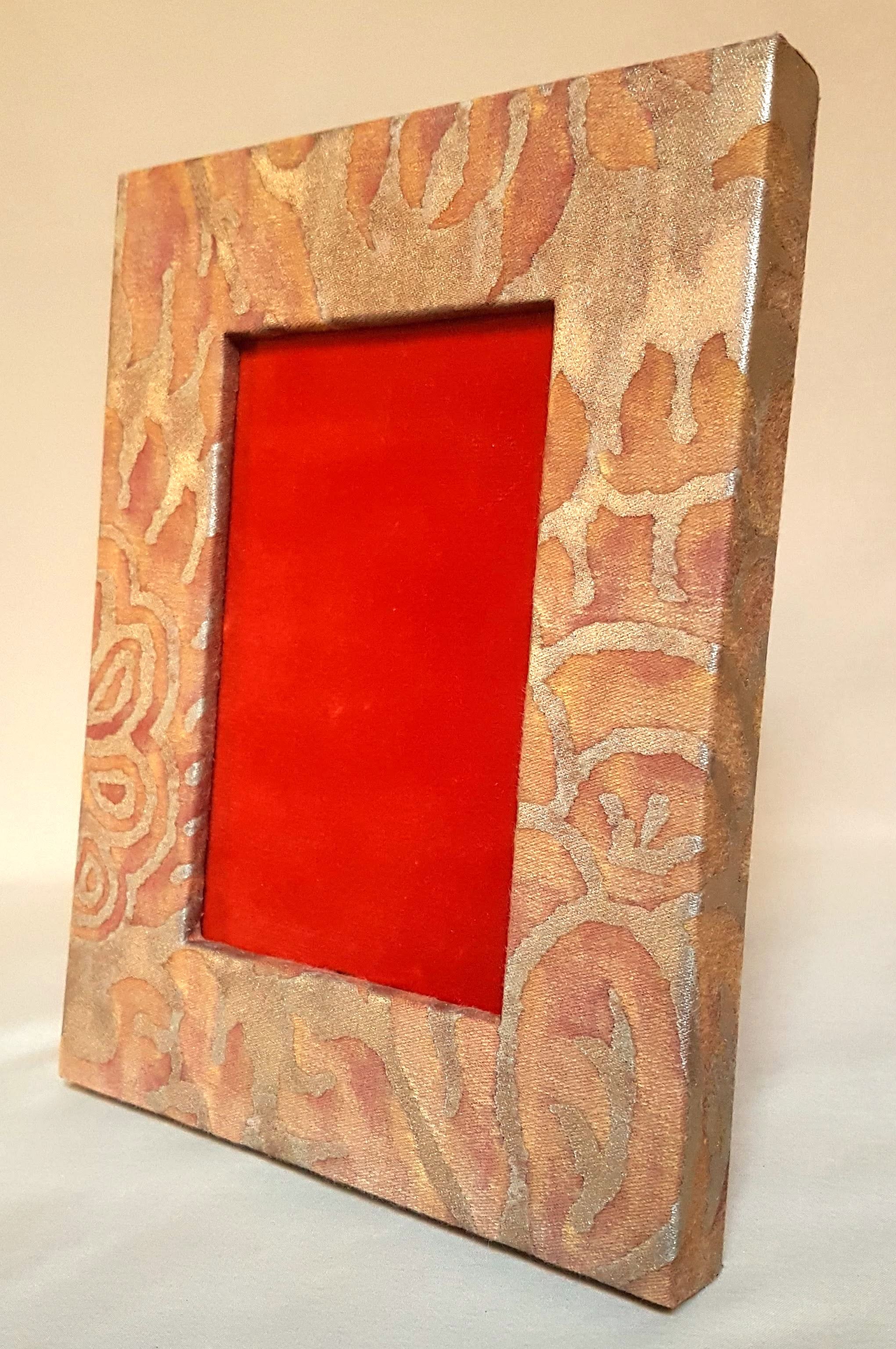 This is a beautiful customizable wooden photo frame that is covered using Fortuny fabric - Barberini pattern - burnt apricot & silvery gold color, back is covered with Rubelli velvet orange color