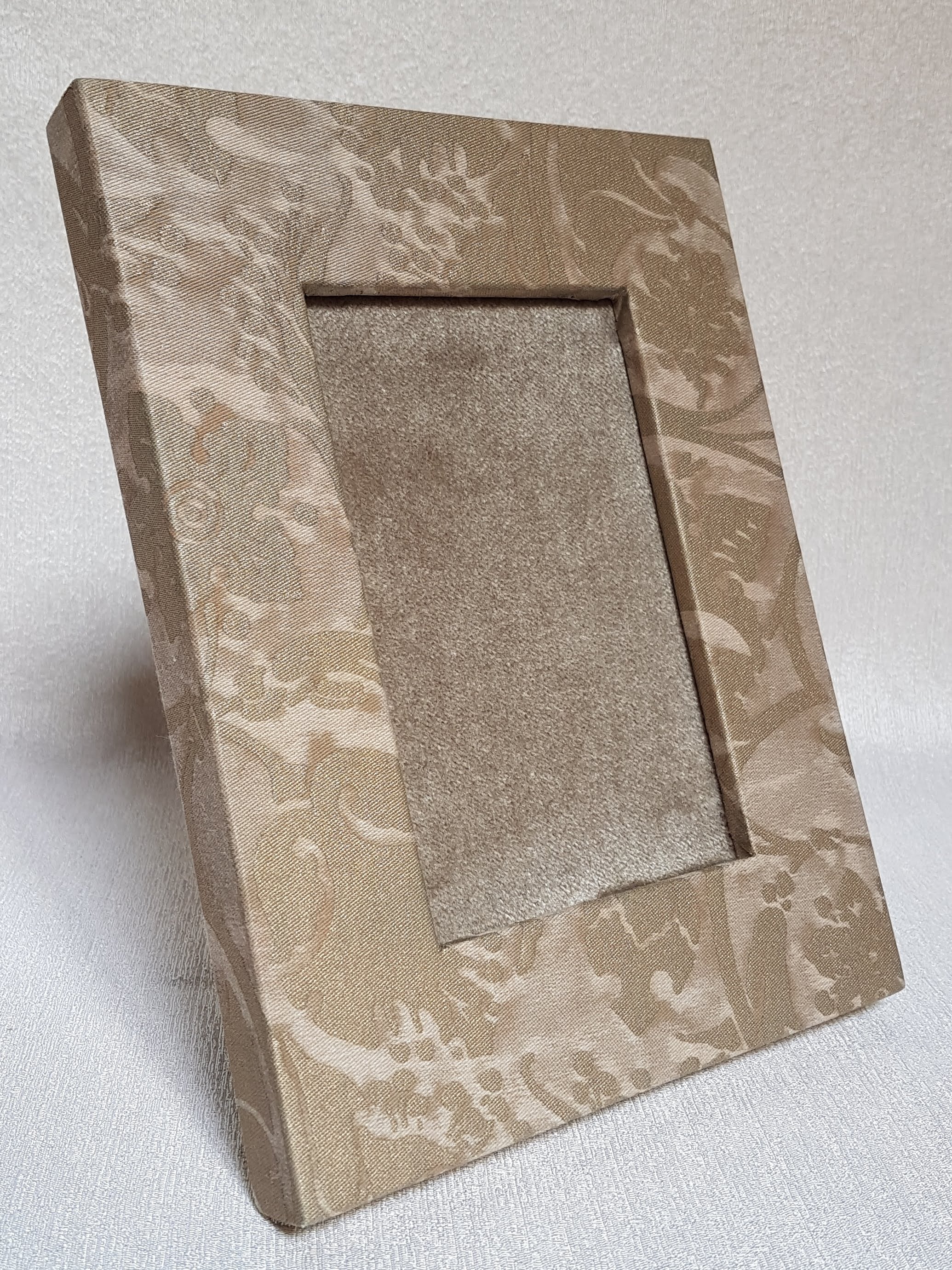 This is a beautiful customizable wooden photo frame that is covered using Fortuny fabric - Persepolis pattern - mushroom & silvery gold color, back is covered with Fortuny velvet