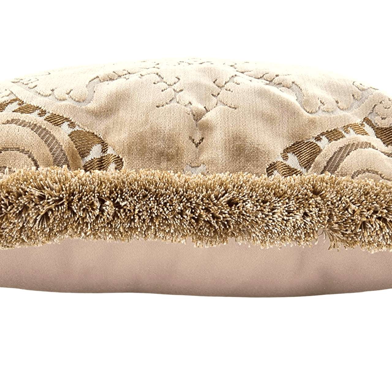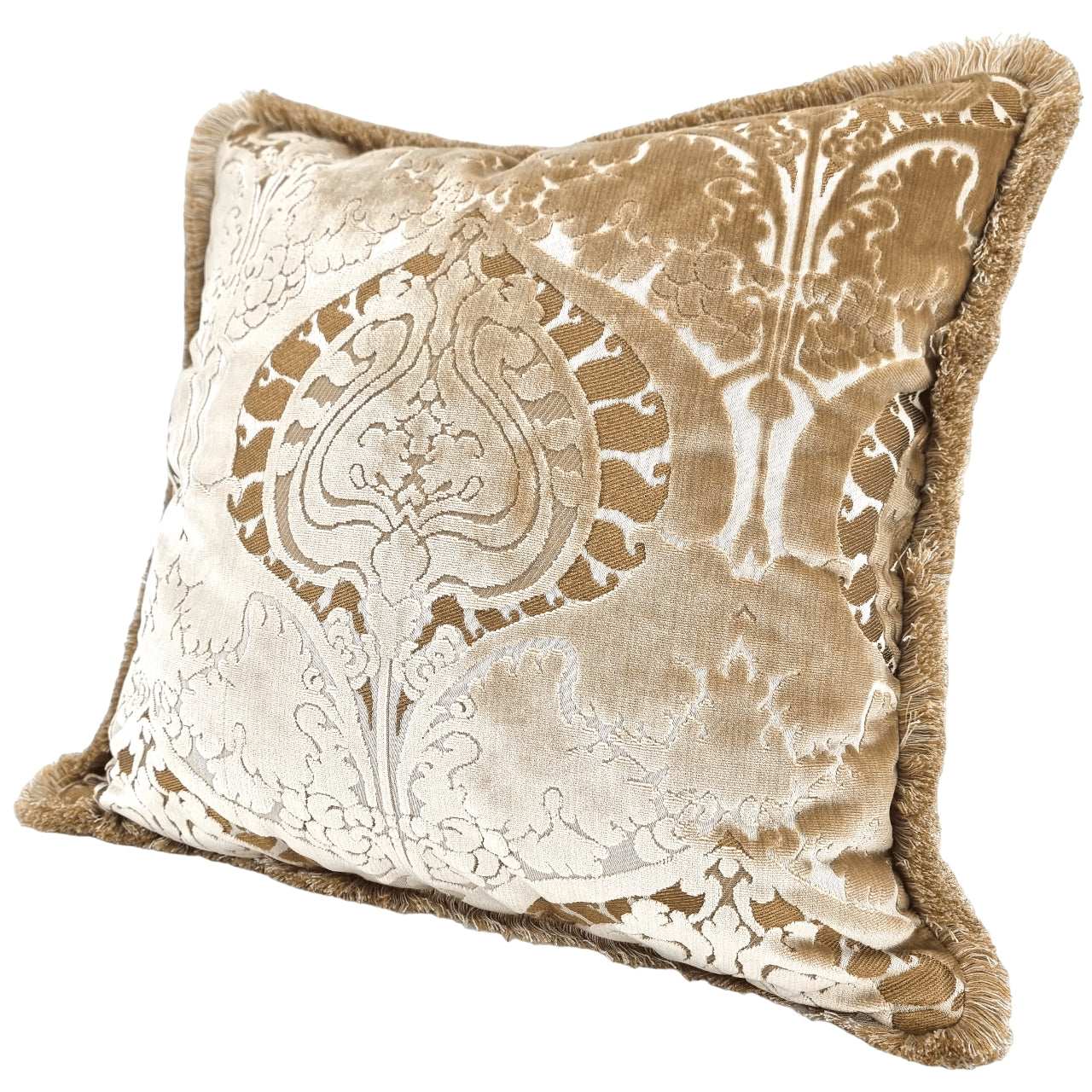 This customizable decorative pillow case is handmade using Luigi Bevilacqua silk heddle velvet - Torcello pattern, 16th-century design - in ivory color embellished with brush fringe, the back of the pillow is made with Rubelli fabric beige color