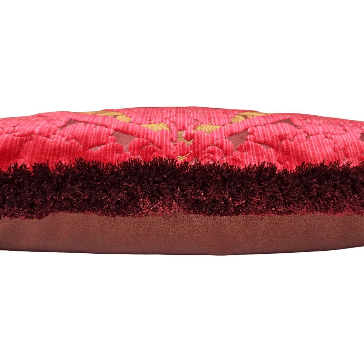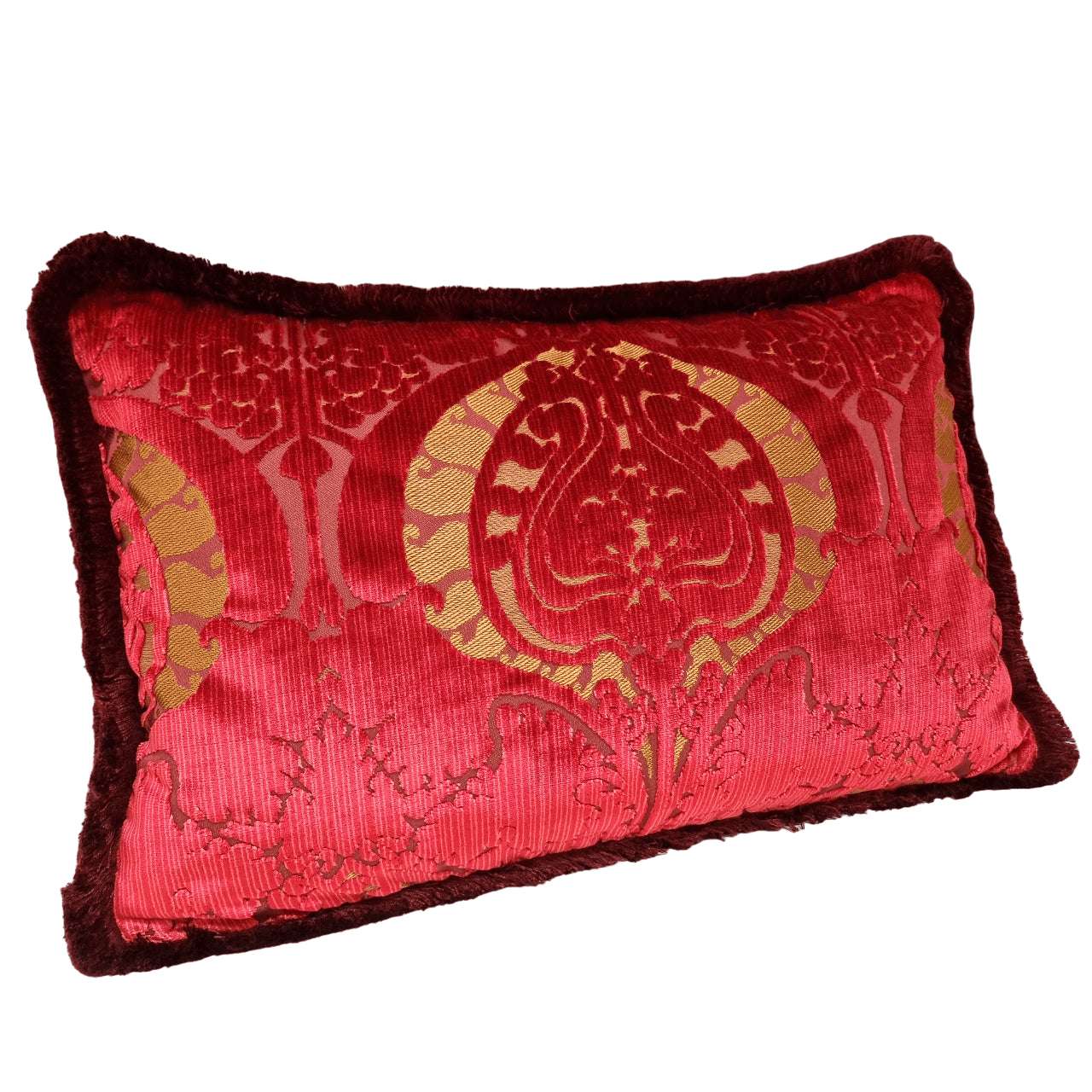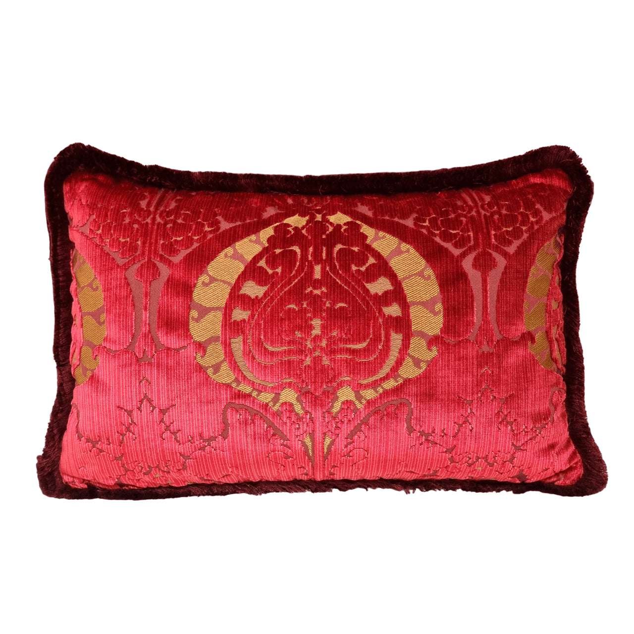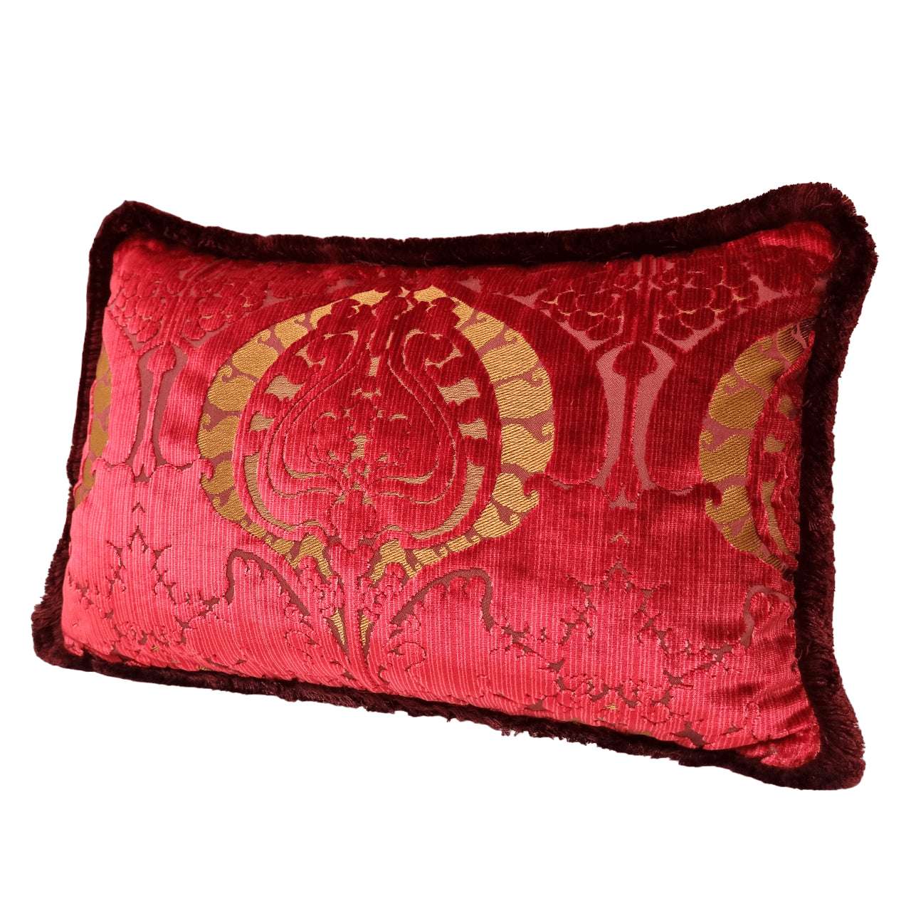 This customizable decorative pillow case is handmade using Luigi Bevilacqua silk heddle velvet - Torcello pattern, 16th-century design - in red color embellished with brush fringe, the back of the pillow is made with Rubelli fabric burgundy color