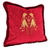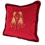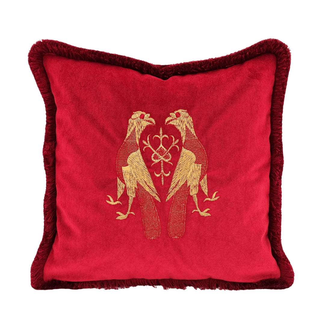 This customizable pillow case is handmade using red velvet embellished with precious embroidered parrots (13th-century design), finished with red brush fringe