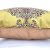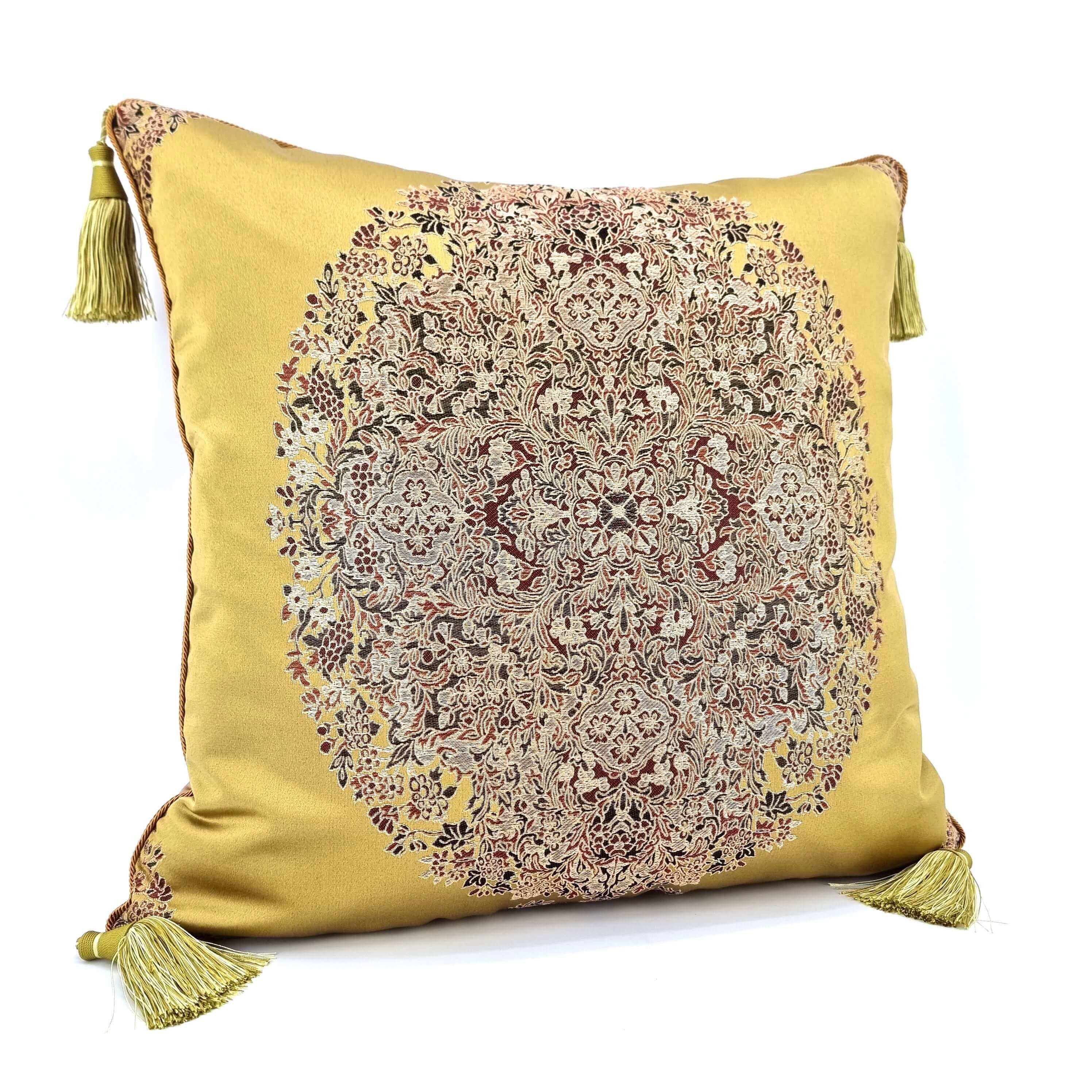 Handmade Decorative Pillow Made With Silk Lampas Rubelli Fabric Seaweed Green Sherazade Pattern With Gold Tassel at Corners