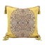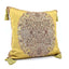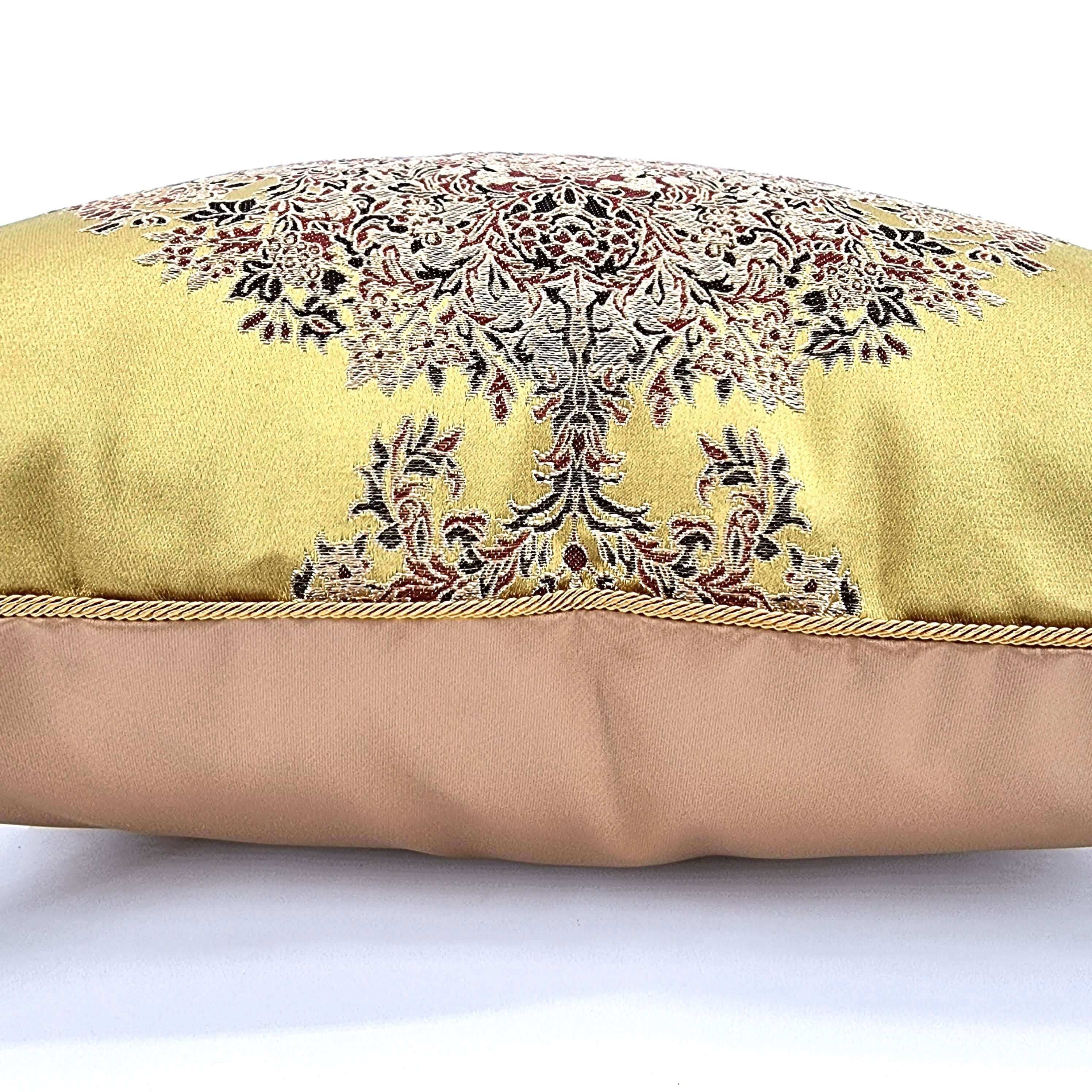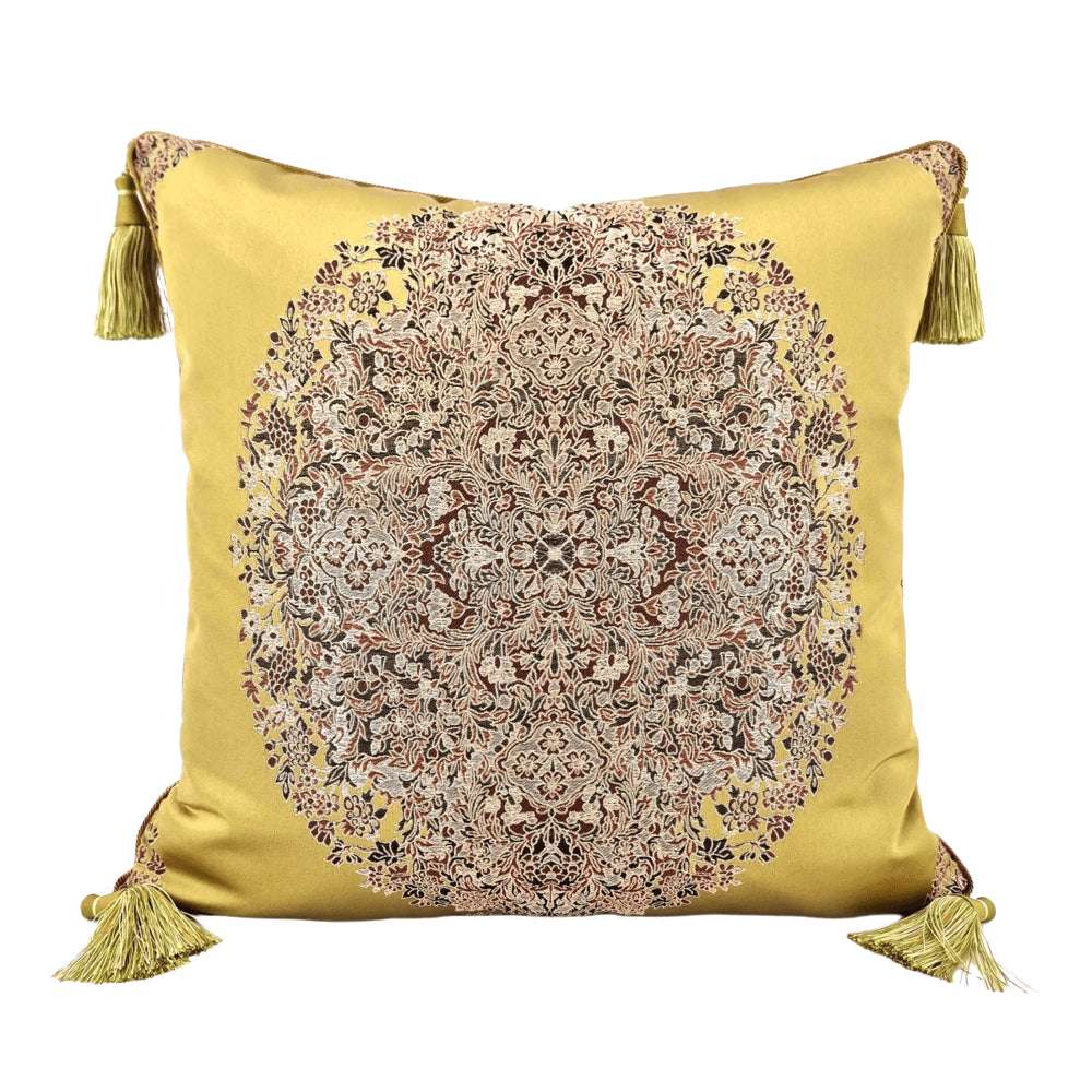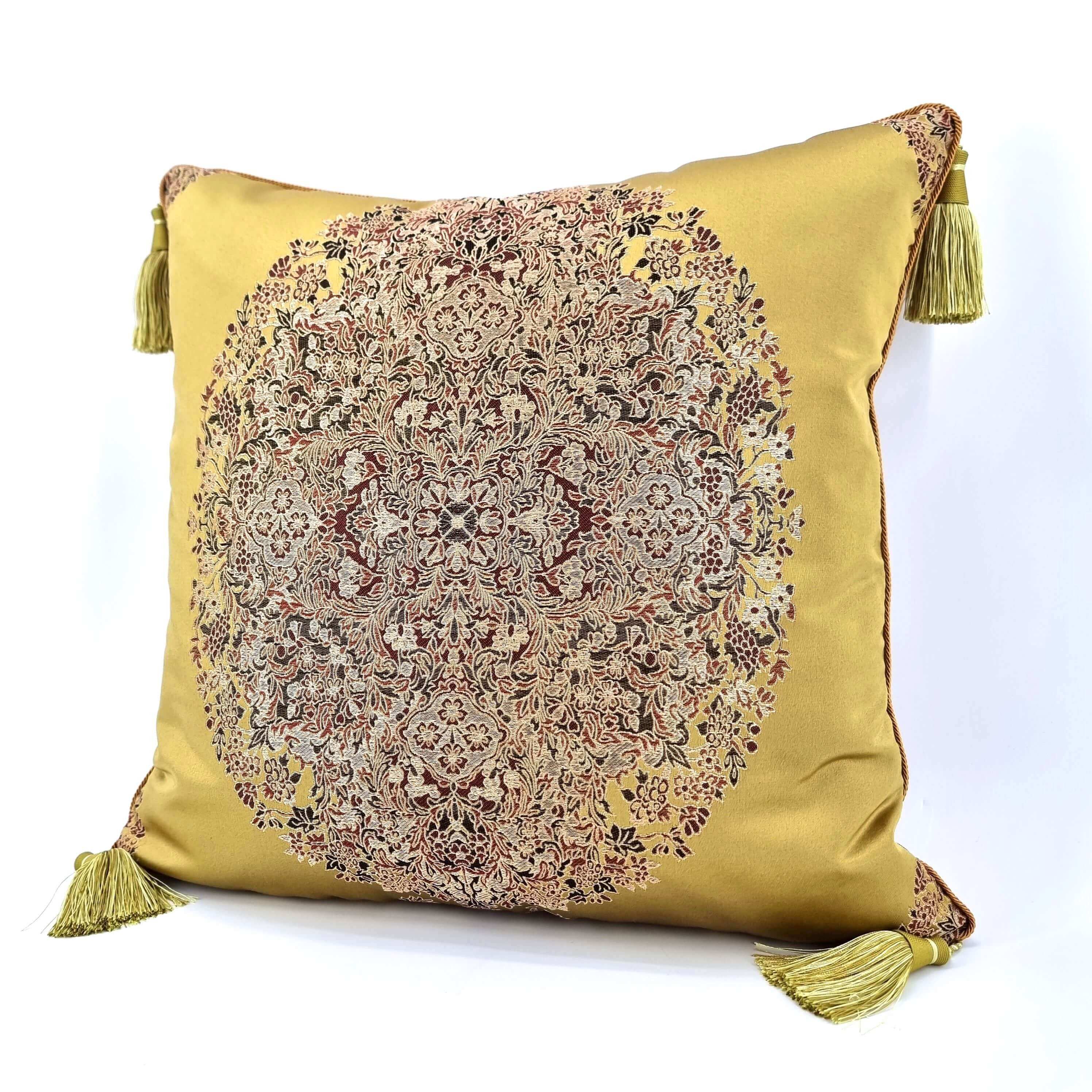 This customizable throw pillow cover is handmade using Rubelli silk lampas fabric, Sherazade pattern, in seaweed green color with gold tassel at the four corners, the back of the pillow is made with beige Rubelli satin
