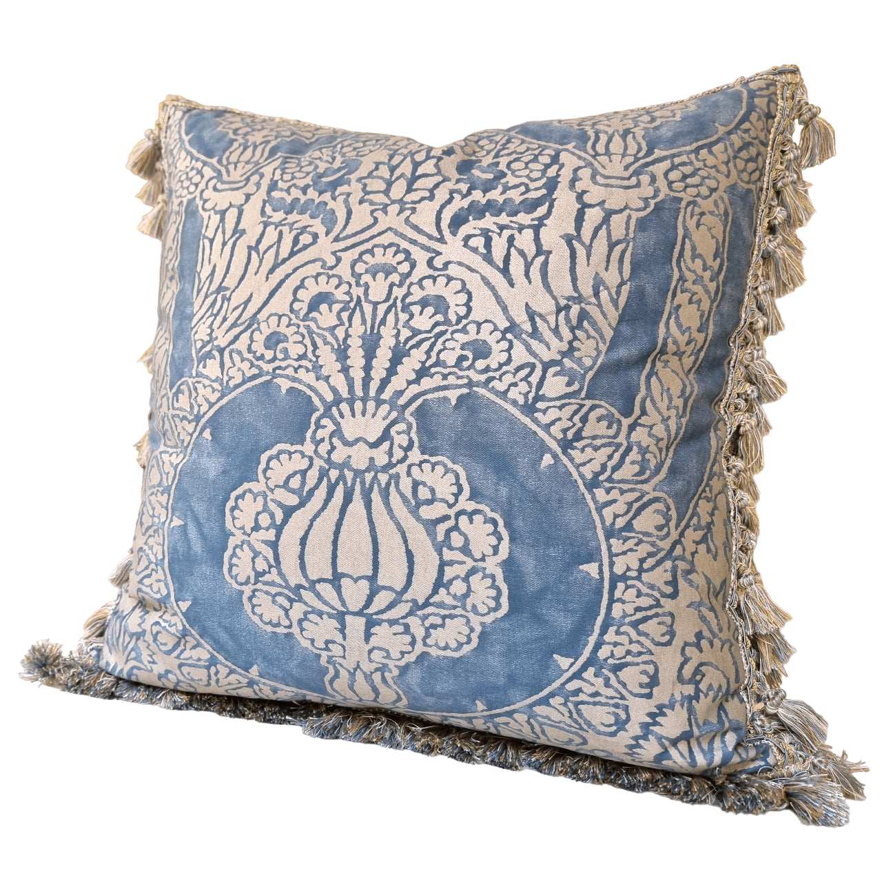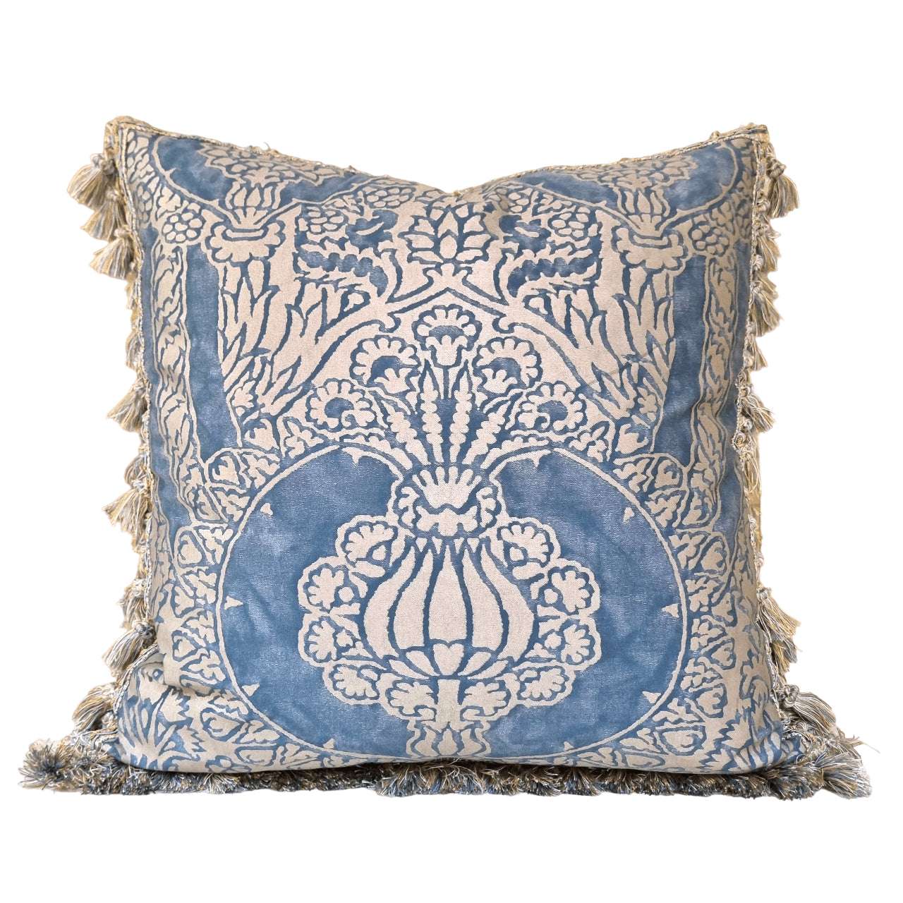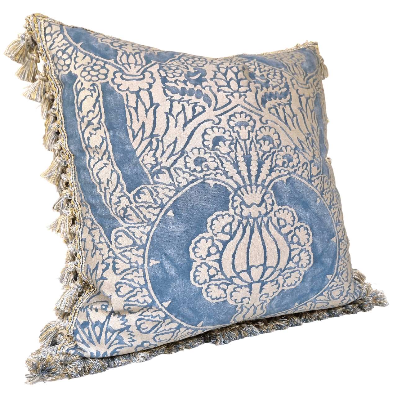 Handmade Decorative Pillow Made With Fortuny Fabric – Blue & Silvery Gold Nicolo Pattern With Tassel Trim