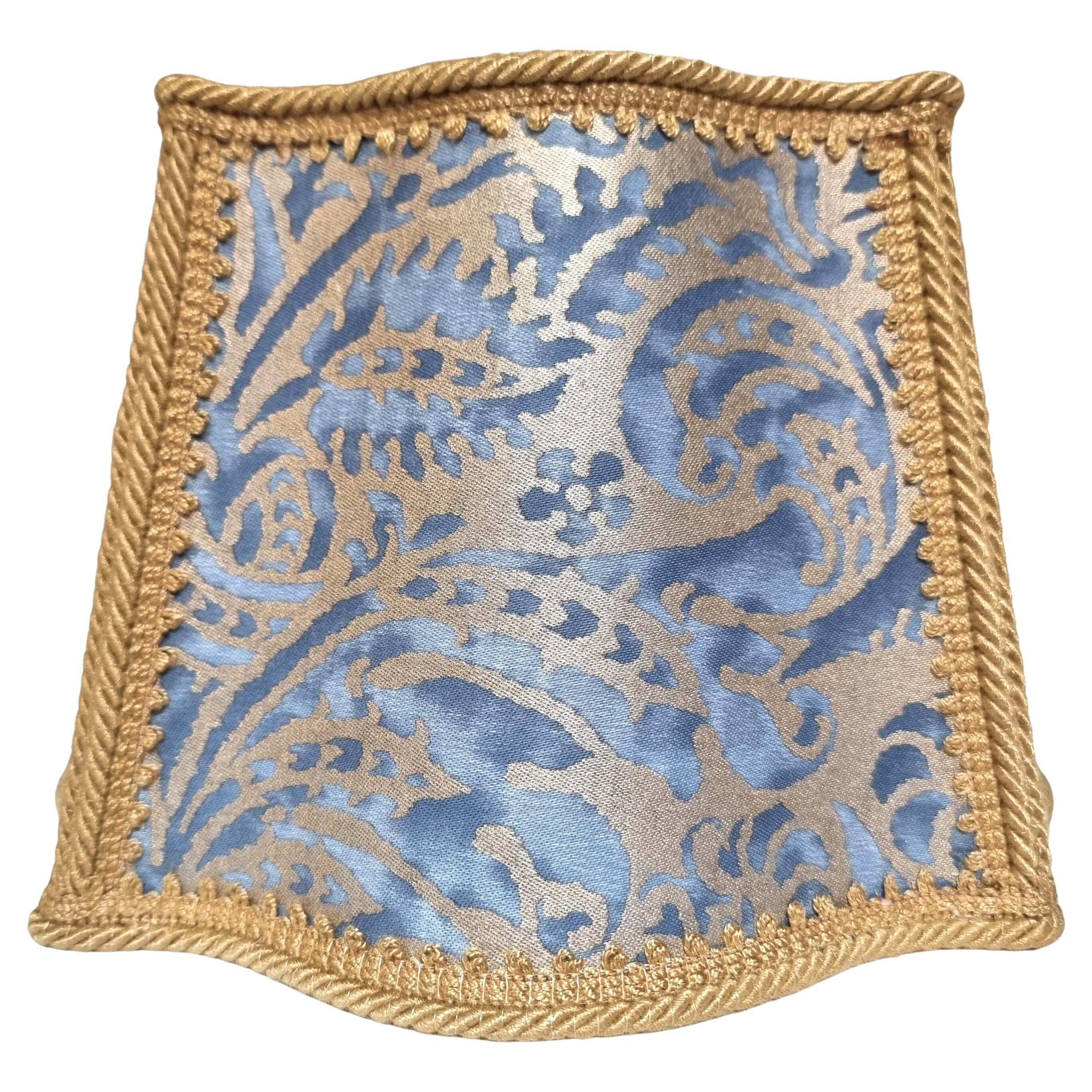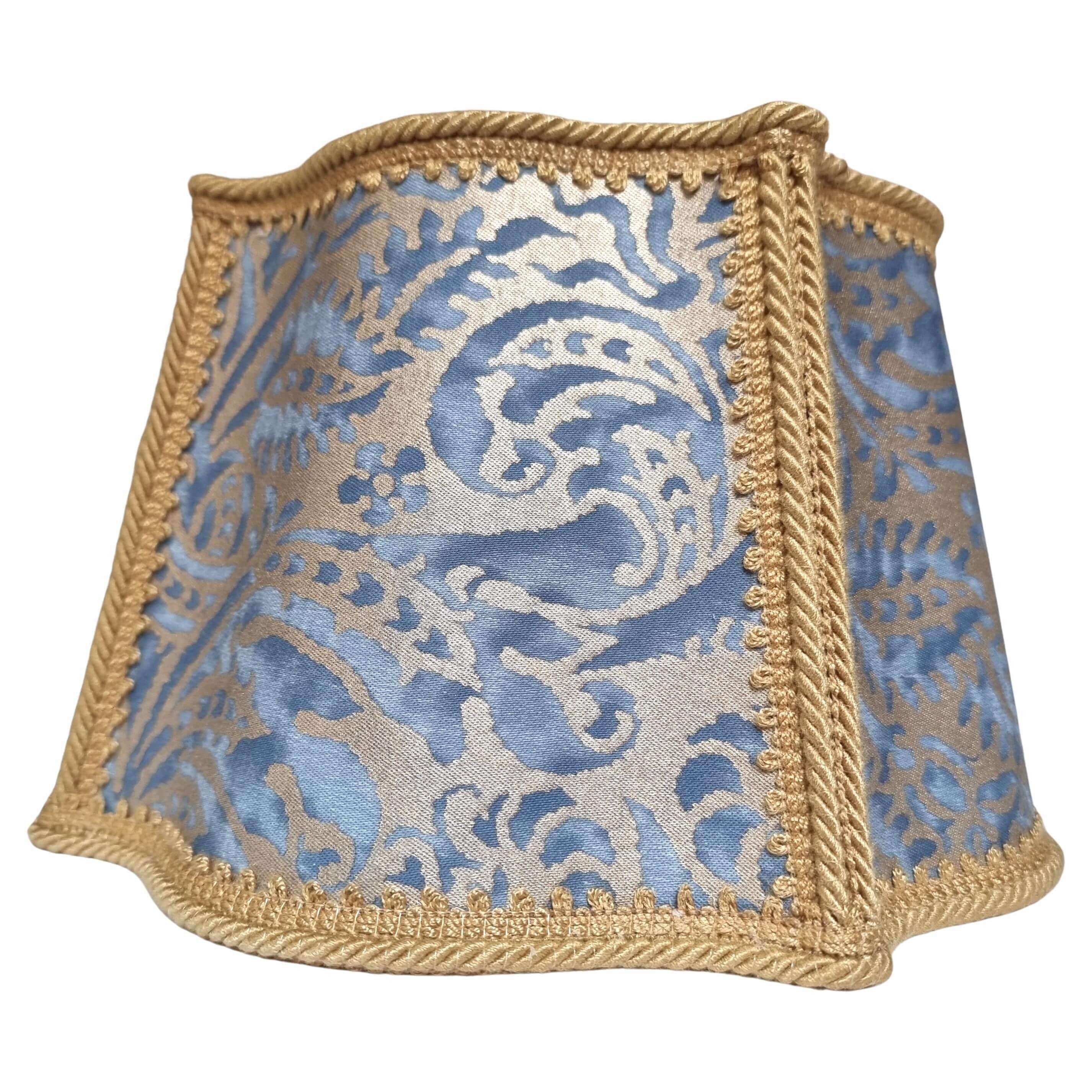 This customizable fancy square lampshade is handmade using Fortuny fabric - Campanelle pattern - in blue & silvery gold color, finished with gold trim.