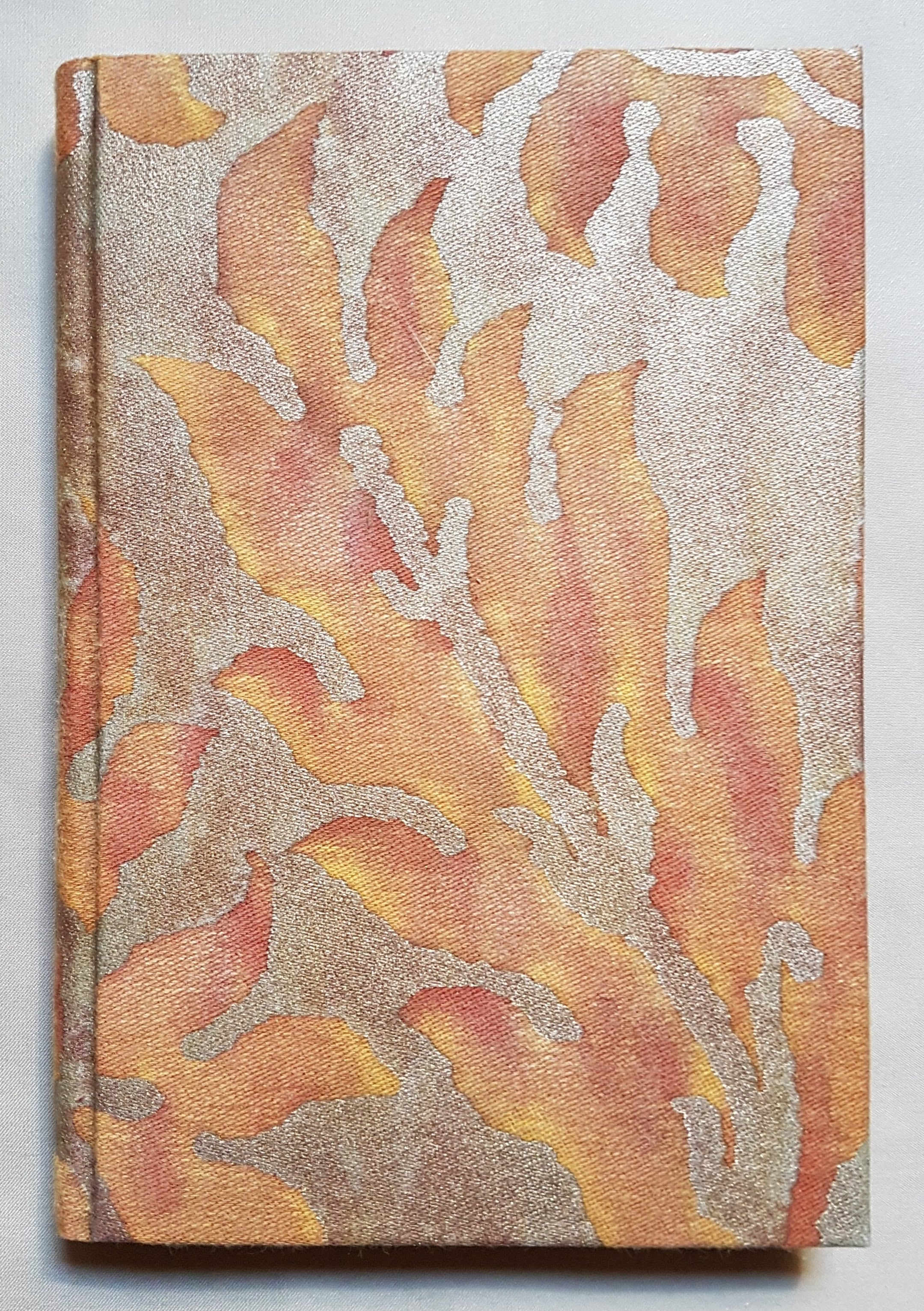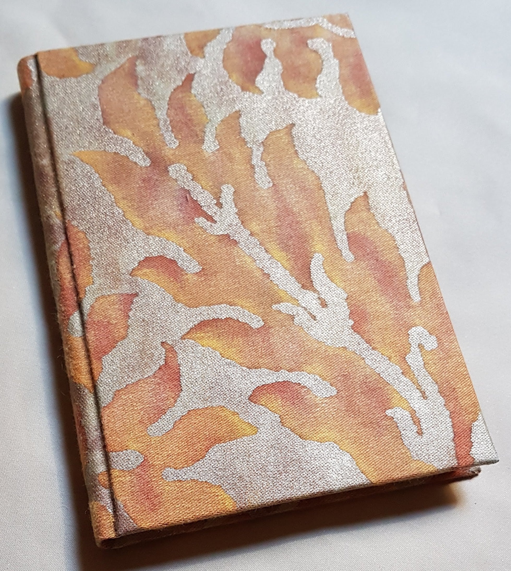 This is a stunning handcrafted hardcover notebook. The cover is made from book board and covered with Fortuny fabric - Barberini pattern - in burnt apricot & silvery gold color