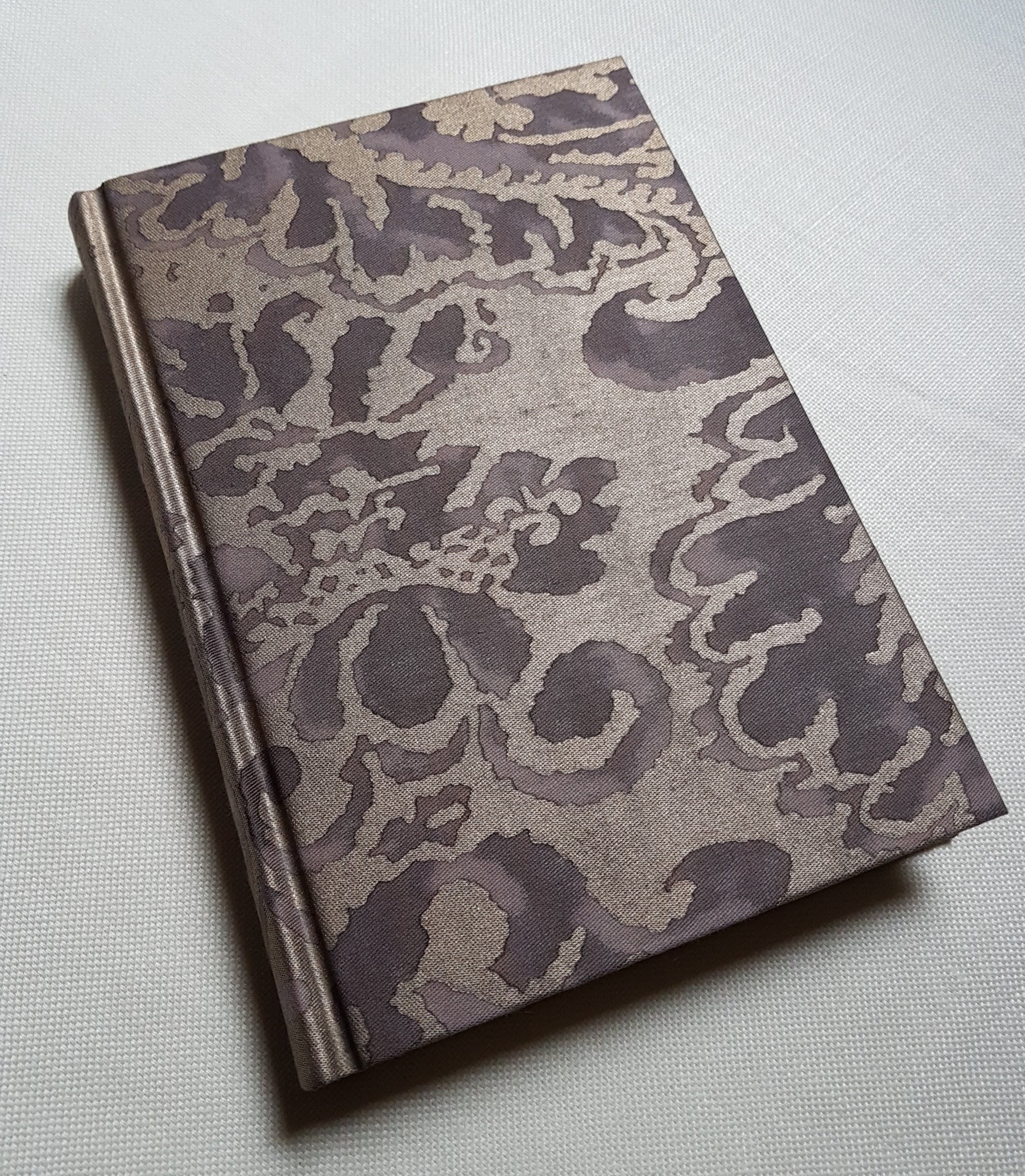 This is a stunning handcrafted hardcover notebook. The cover is made from book board and covered with Fortuny fabric - Corone pattern - in grey & silvery gold color
