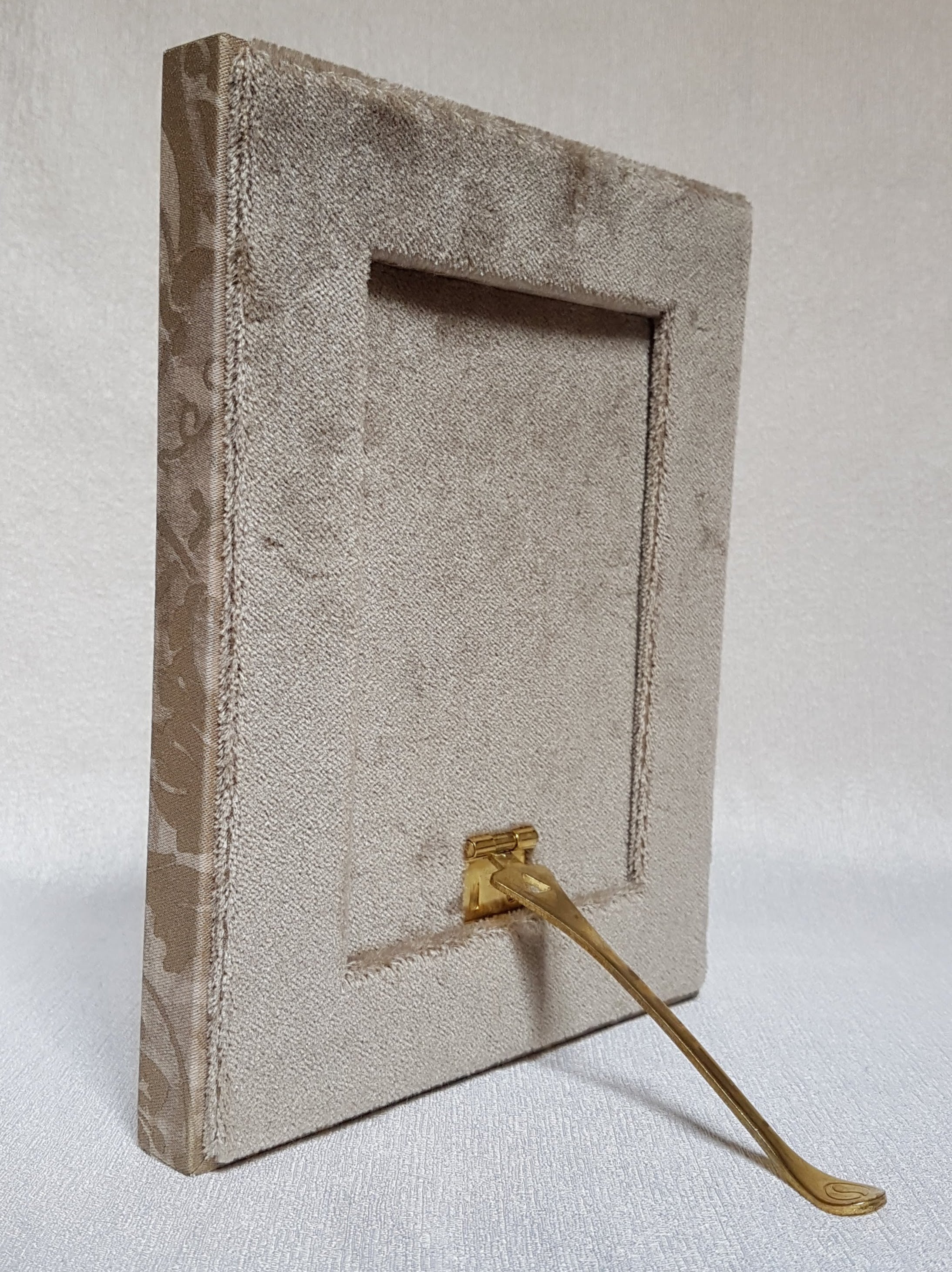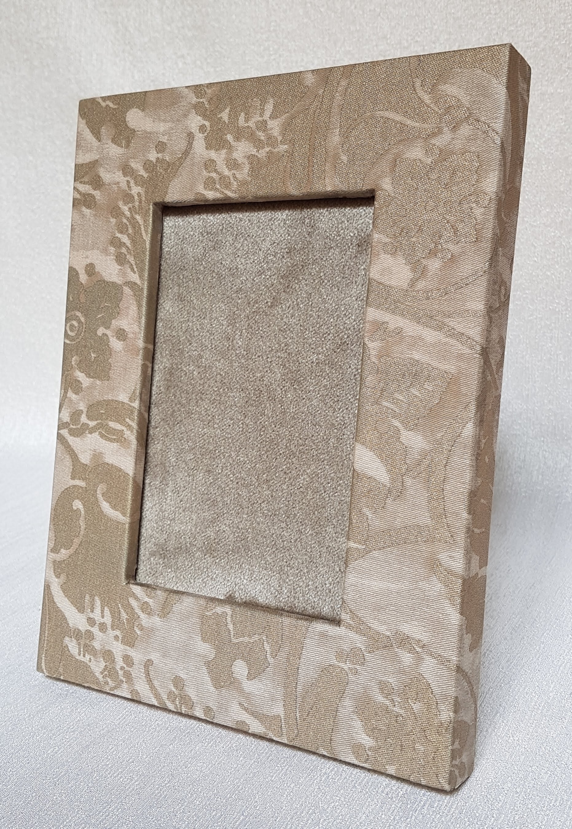 This is a beautiful customizable wooden photo frame that is covered using Fortuny fabric - Persepolis pattern - mushroom & silvery gold color, back is covered with Fortuny velvet