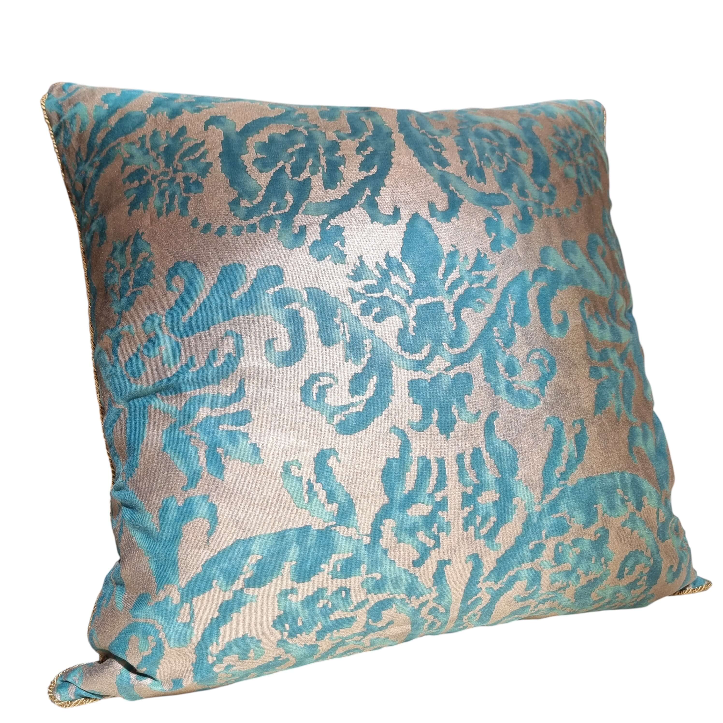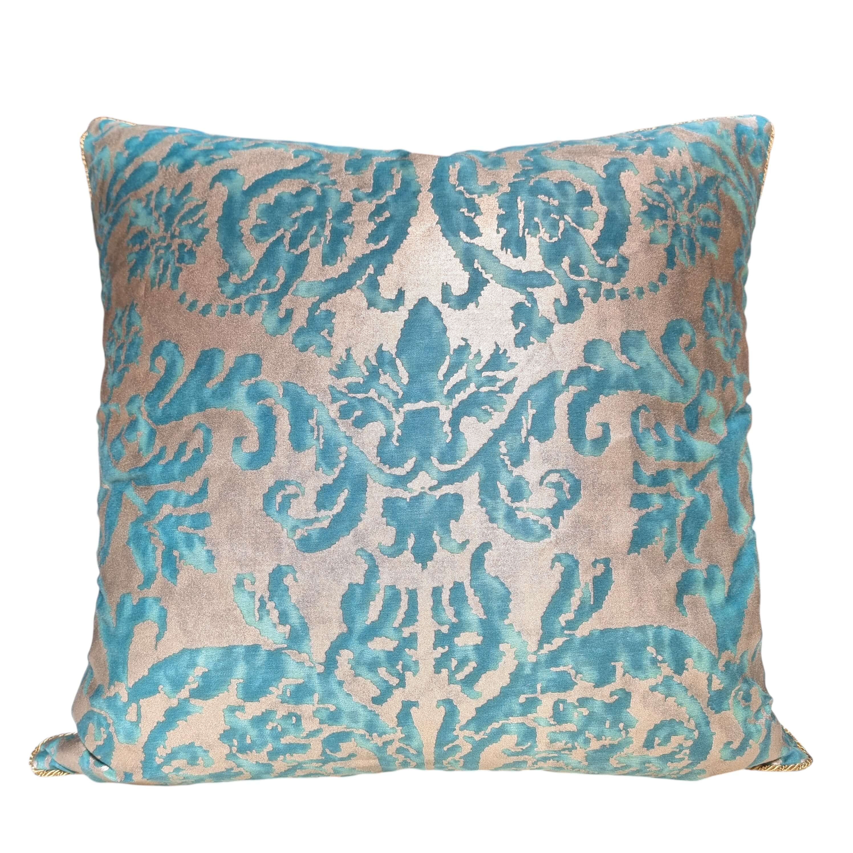 Handmade Decorative Pillow Made With Fortuny Fabric – Blue-Green & Silvery Gold Farnese Pattern