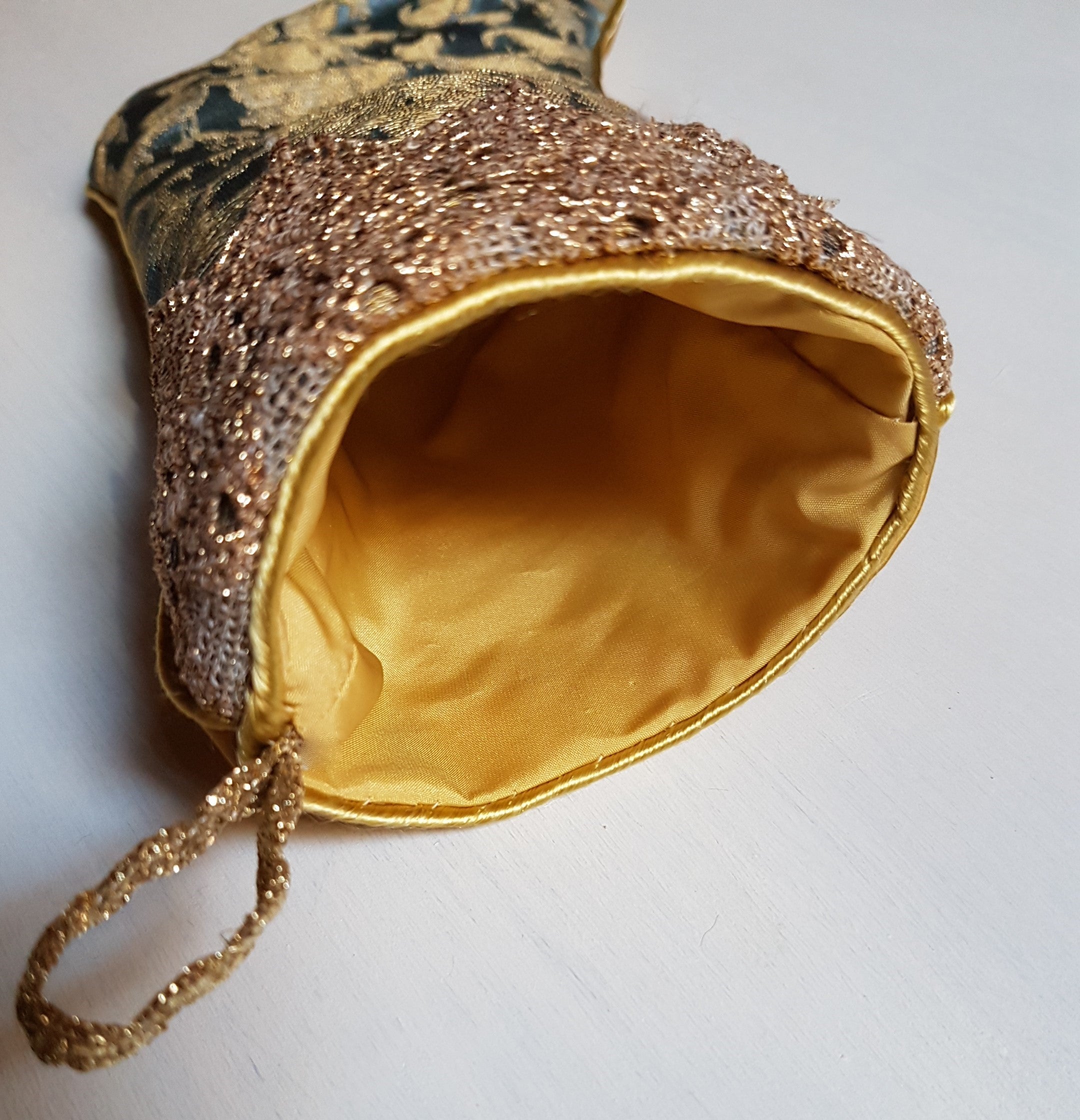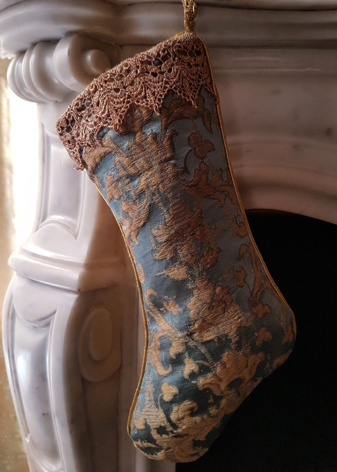 This customizable Christmas stocking is handmade using Rubelli silk jacquard fabric - Les Indes Galantes pattern - in sky blue and gold color, back side and fully lined in gold Rubelli satin with piping edges and gold lace trim on top