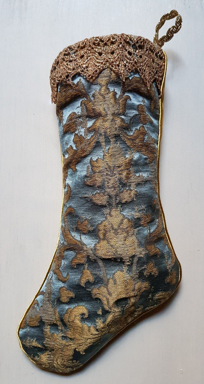 Luxury Christmas Stocking Sky Blue & Gold Silk Jacquard Rubelli Fabric Les Indes Galantes Pattern
