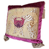 The front and the back of this customizable luxury throw pillow case with tassel at the four corners is handmade using Rubelli strie silk velvet in amethyst color finished with Houlès multicolor twisted lip cord, embellished with front positioned panel in Luigi Bevilacqua antique yellow lampas "Tulipani" motif framed with flat gold trim.