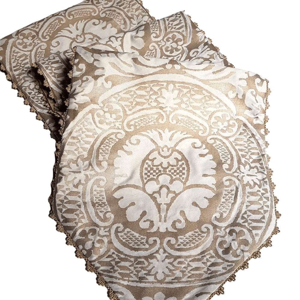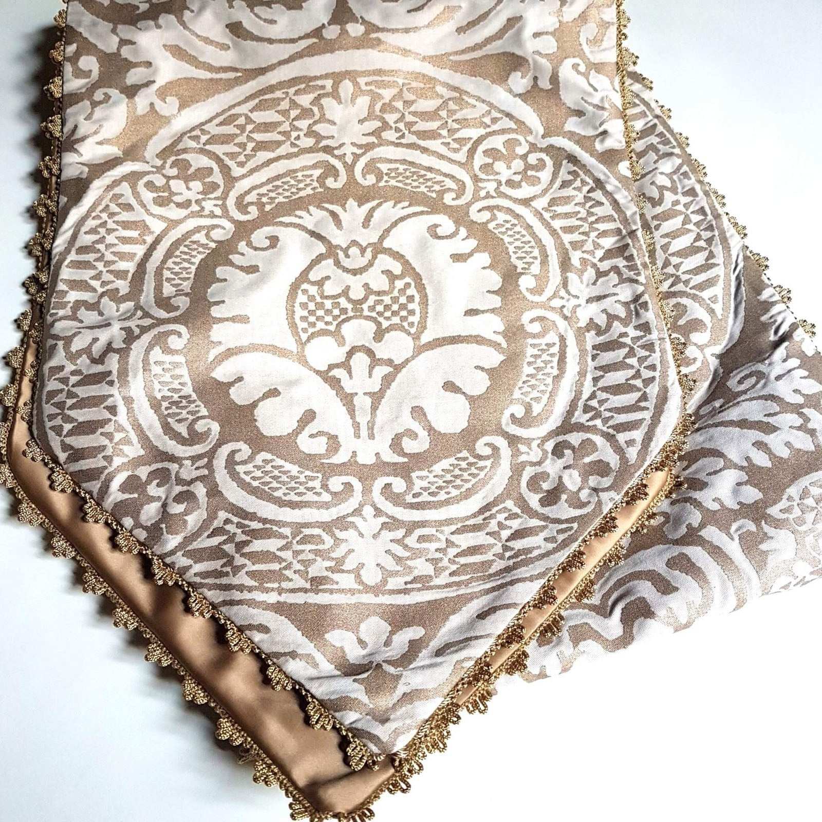 This customizable table runner with pointed ends is handmade using Fortuny fabric - Orsini pattern - in champagne and silvery gold color, decorated with an elegant gold trim all along the edges and fully lined with Rubelli satin.