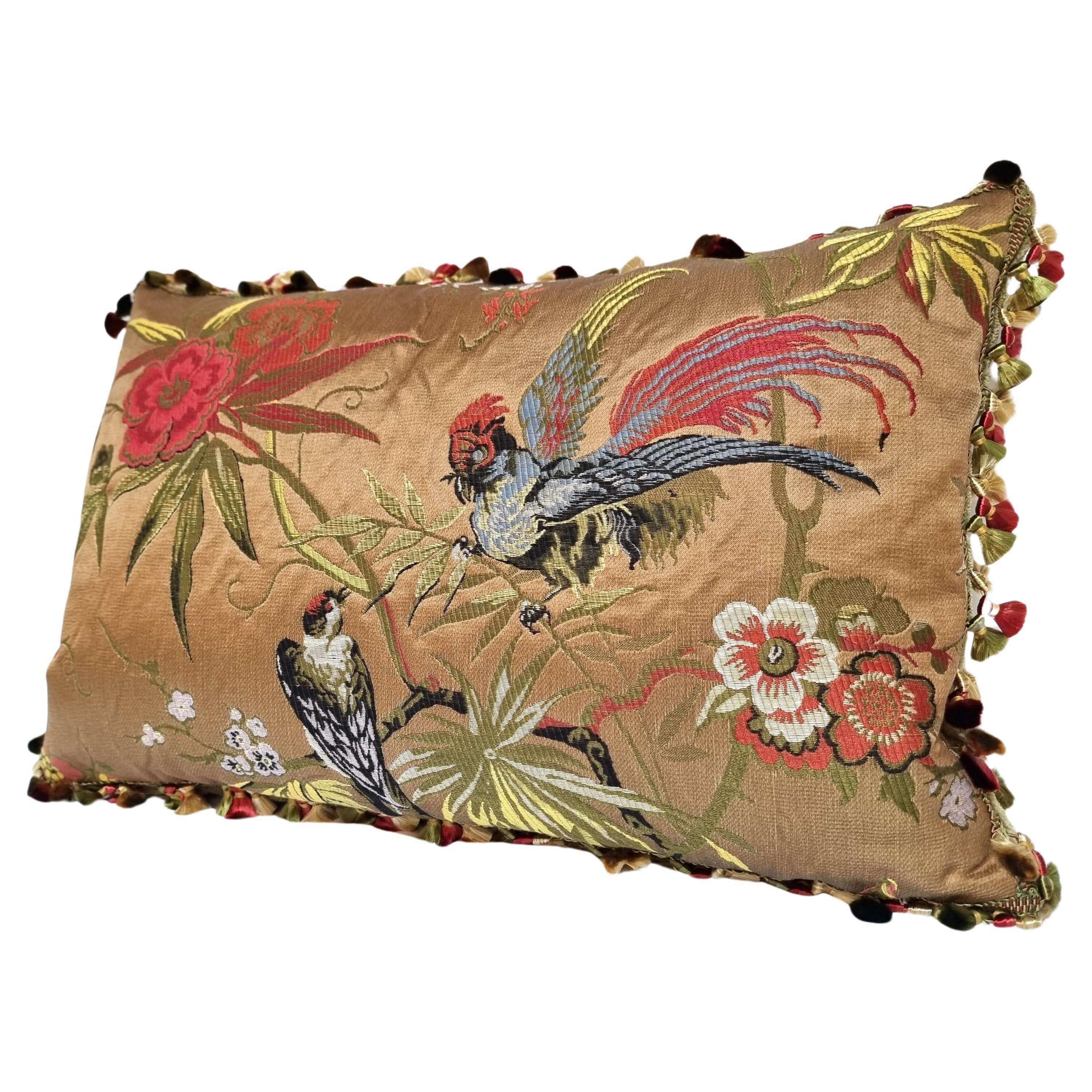 Handmade Decorative Pillow With Tassel Trim Hazelnut Brown Silk Brocade Luigi Bevilacqua Fabric Uccelli Pattern