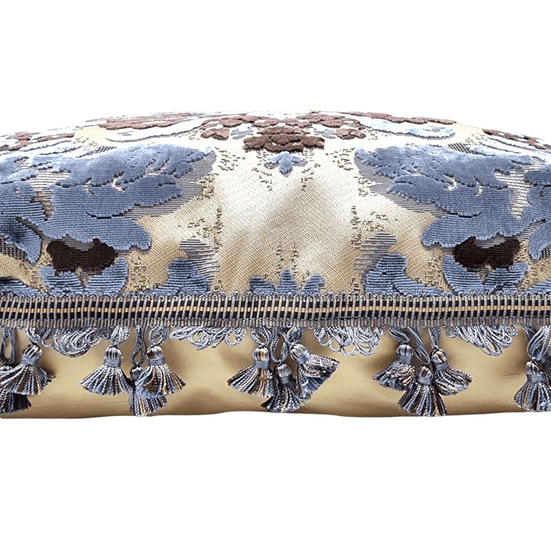 This customizable decorative pillow case is handmade using Luigi Bevilacqua silk velvet - Giardino Antico pattern, 18th-century design - in petrolio multicolour ivory background embellished with tassel fringe, the back of the pillow is made with pale yellow Rubelli silk