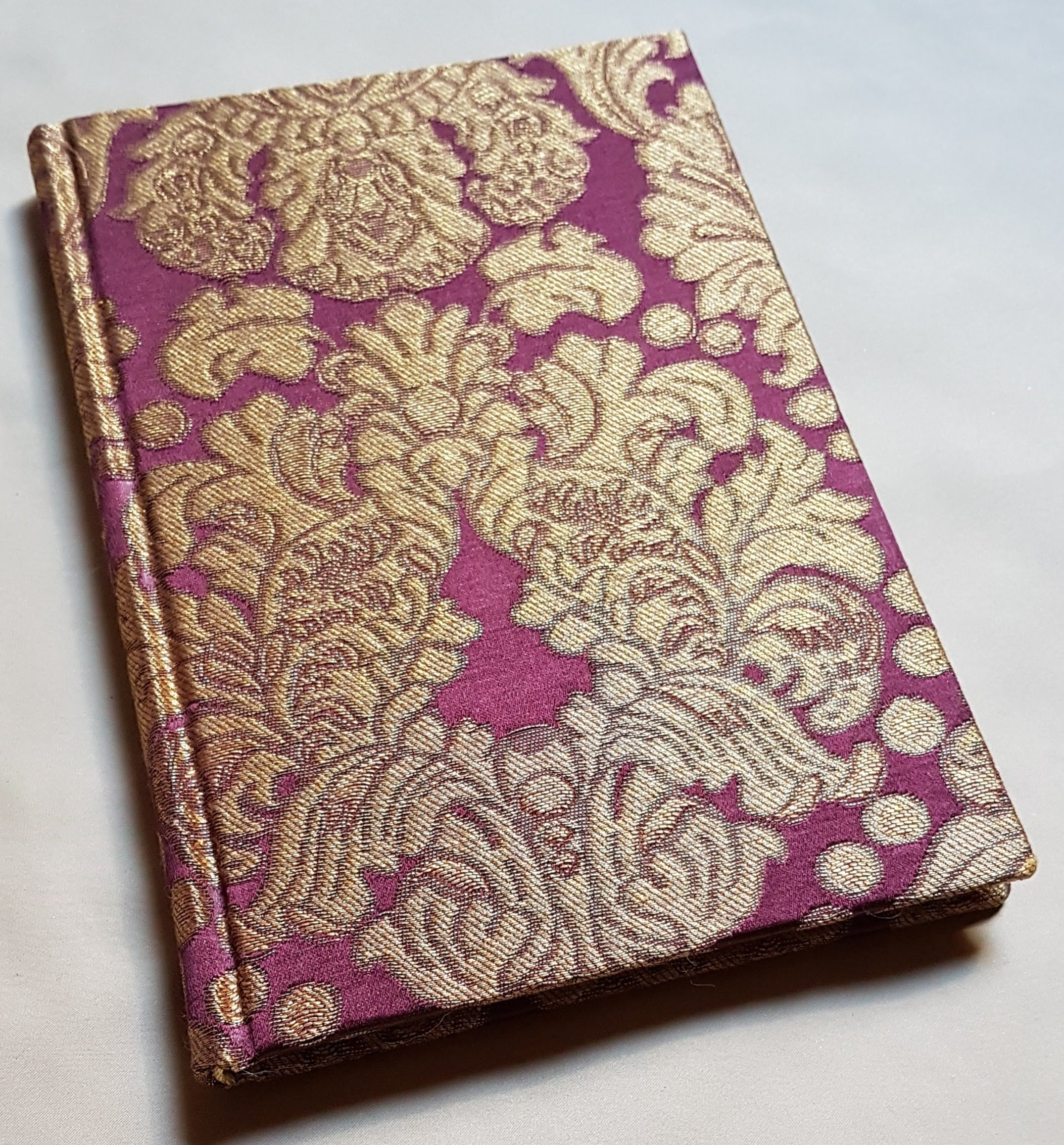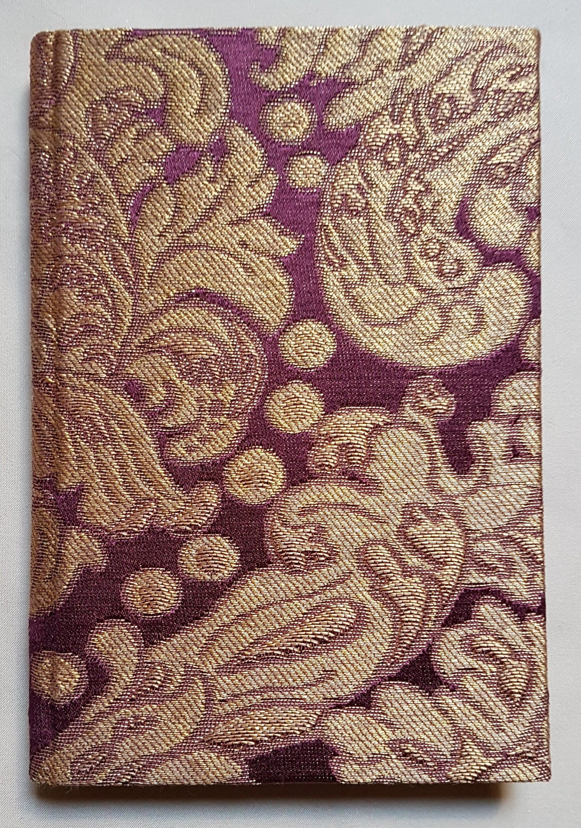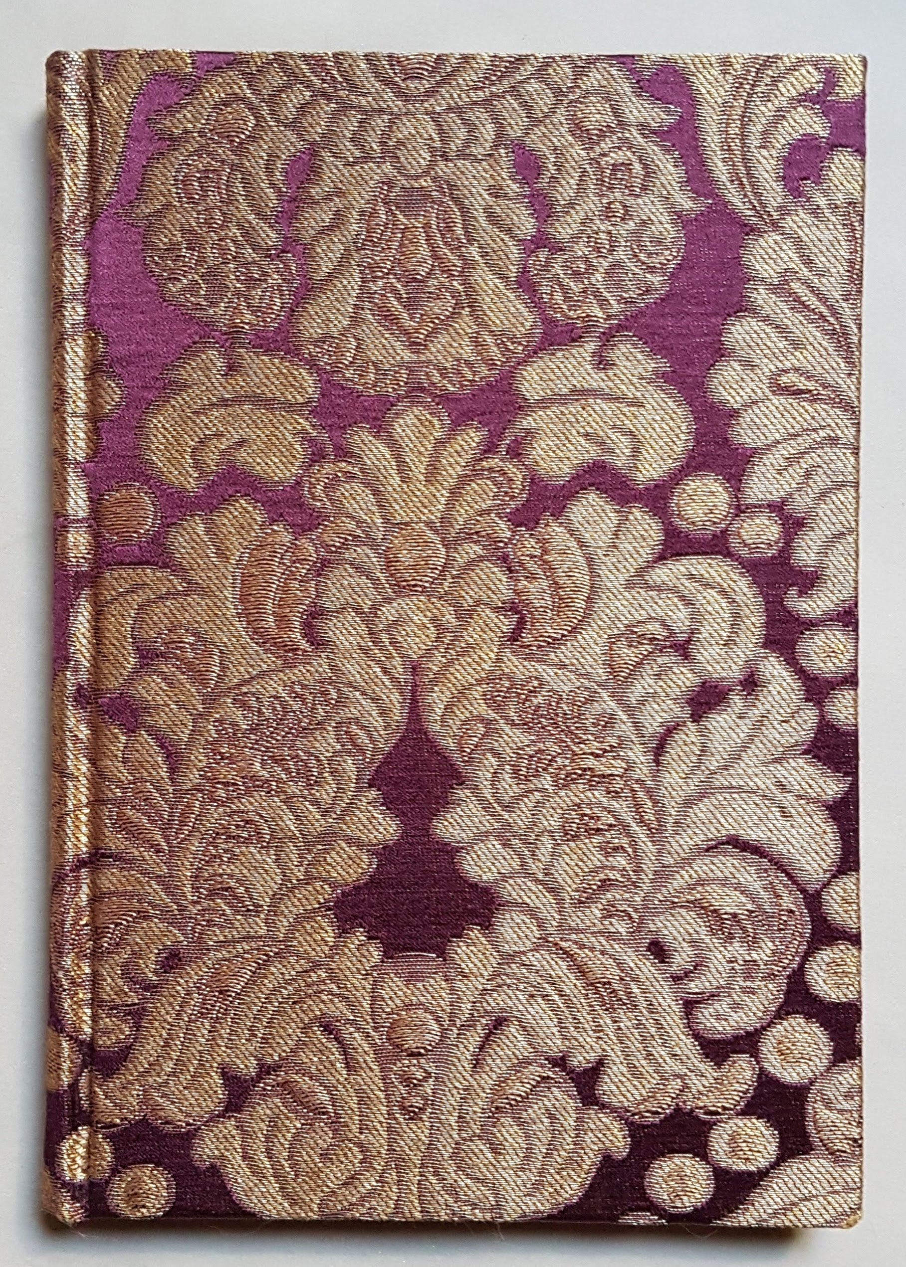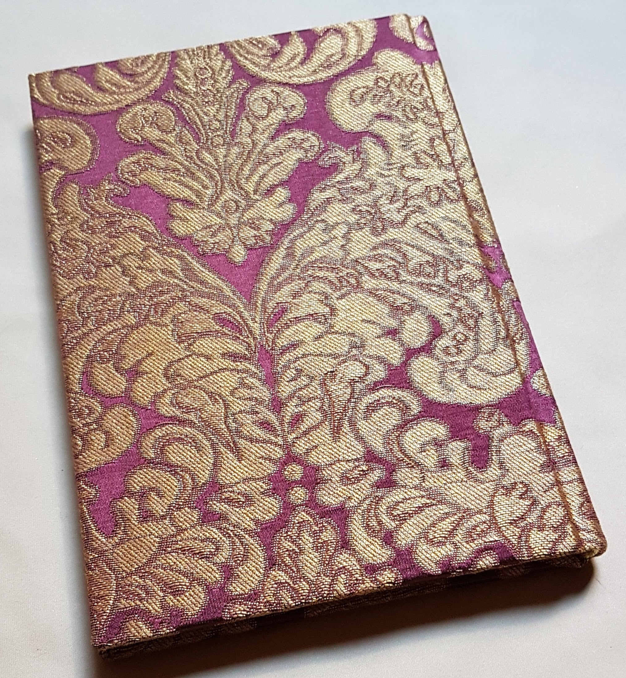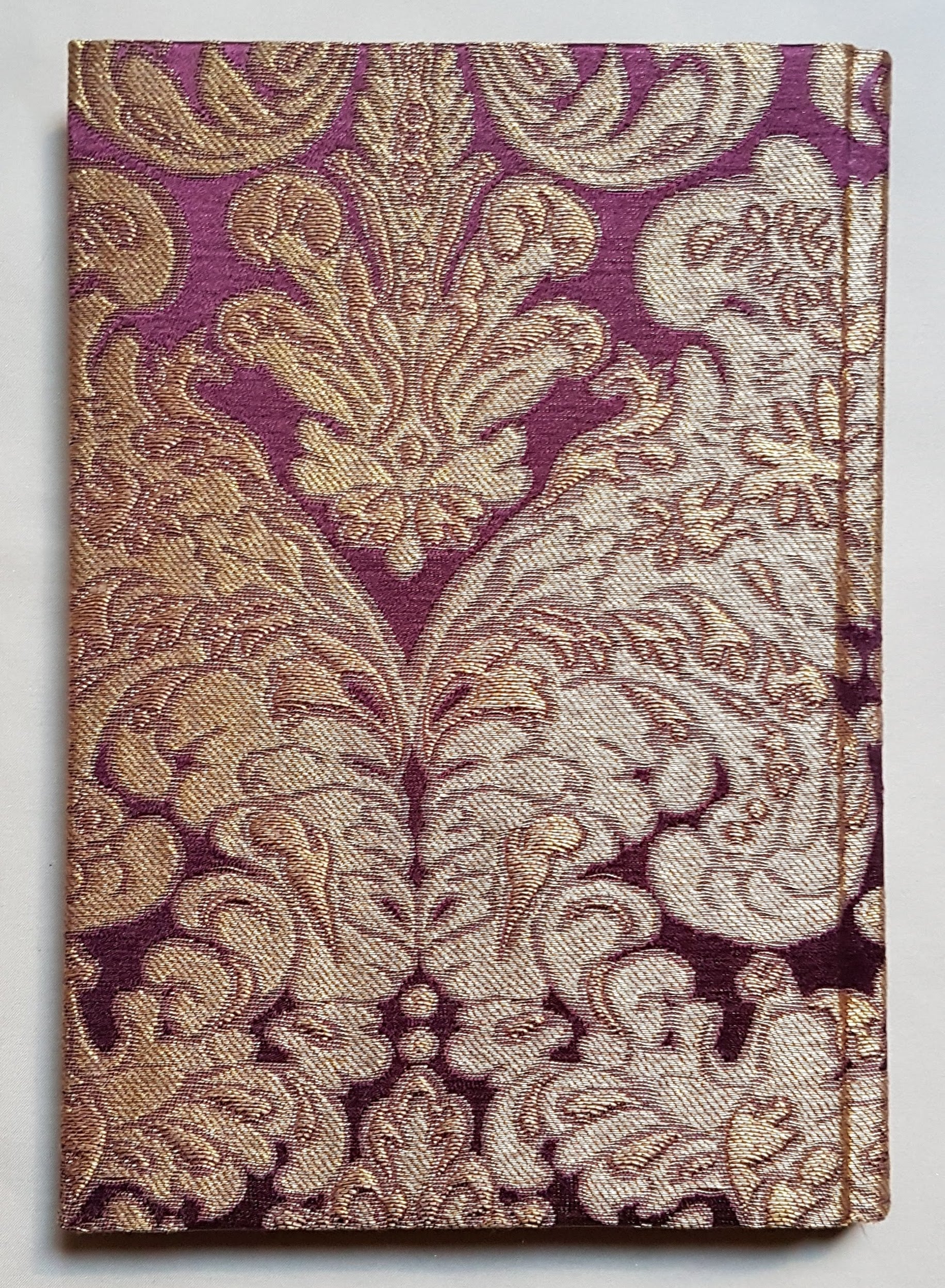 This is a stunning handcrafted hardcover notebook. The cover is made from book board and covered with Rubelli silk brocatelle fabric - Tebaldo pattern - in amethyst & gold color