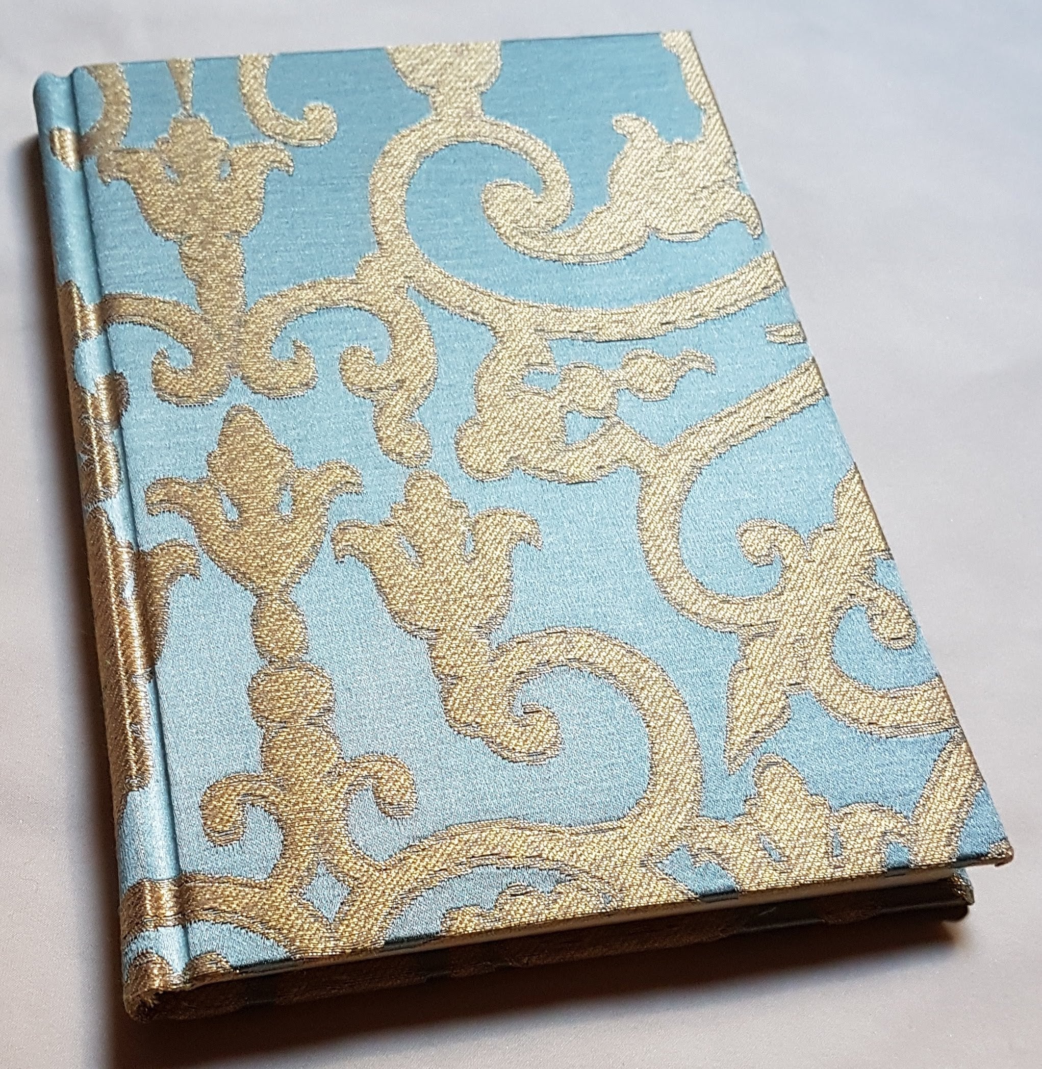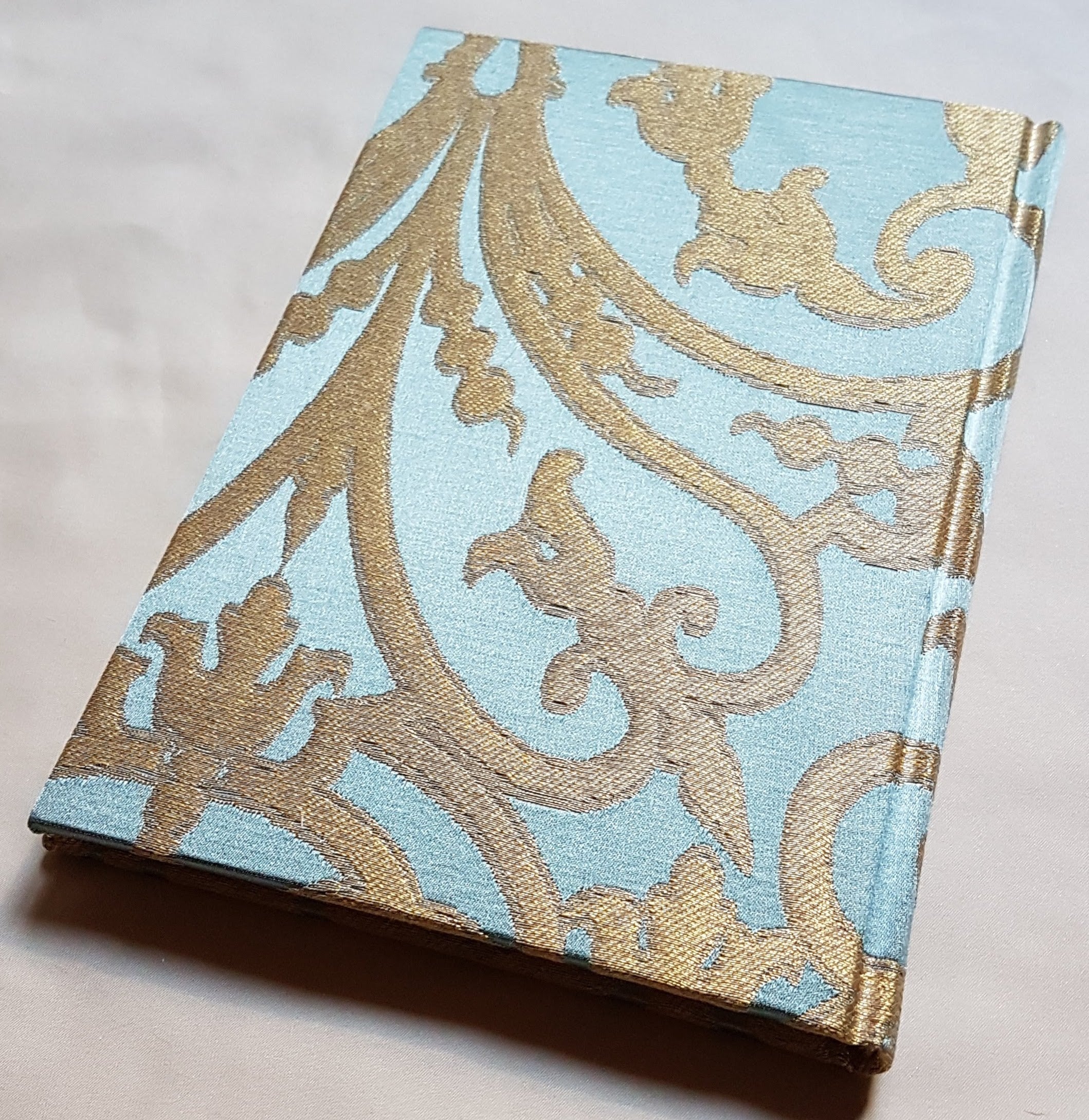 This is a stunning handcrafted hardcover notebook. The cover is made from book board and covered with Rubelli silk jacquard fabric - Serlio pattern - in blue & gold color