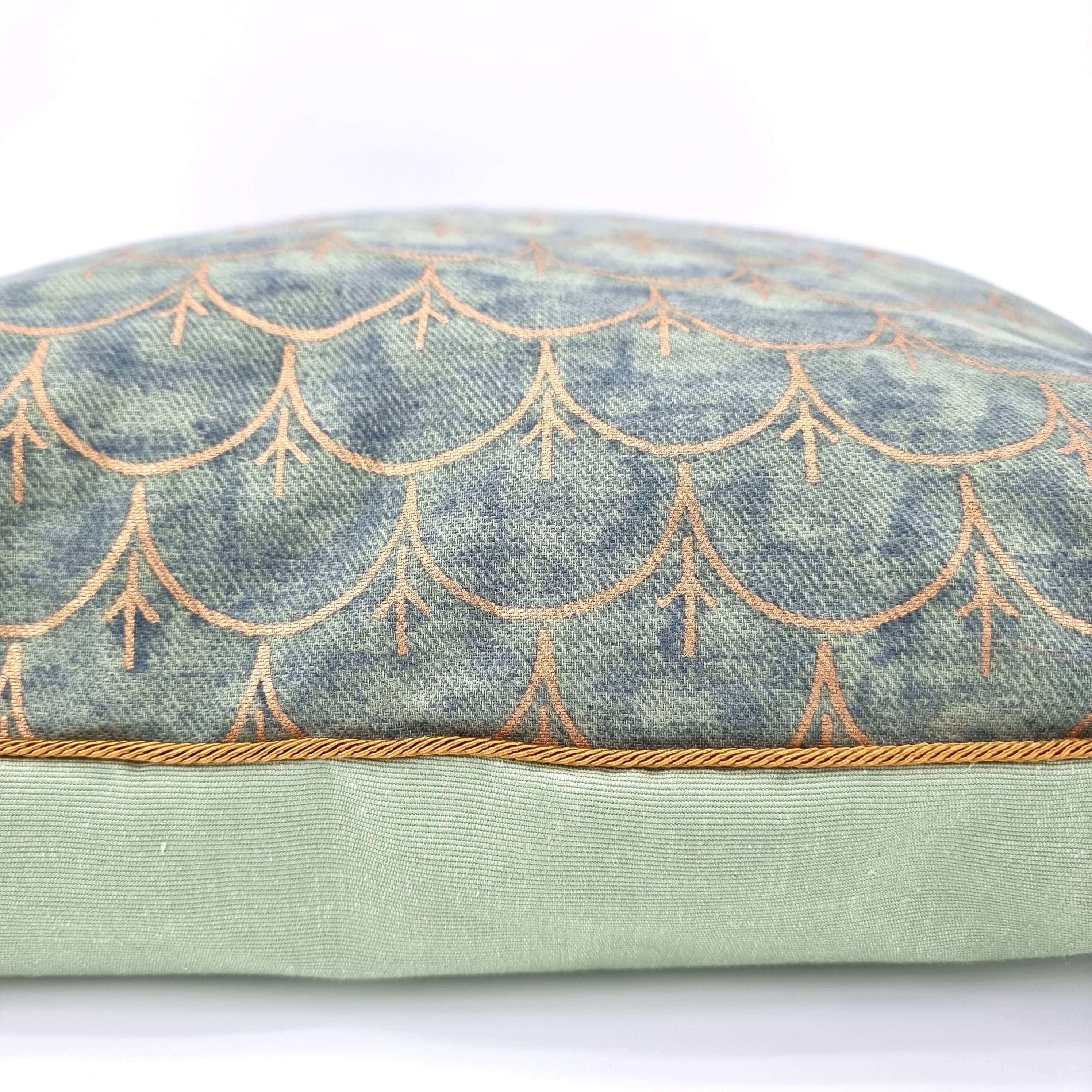 This customizable throw pillow case is handmade using Fortuny fabric Arboreto pattern in pine & gold texture, the back of the pillow is made with Rubelli moiré fabric in green color
