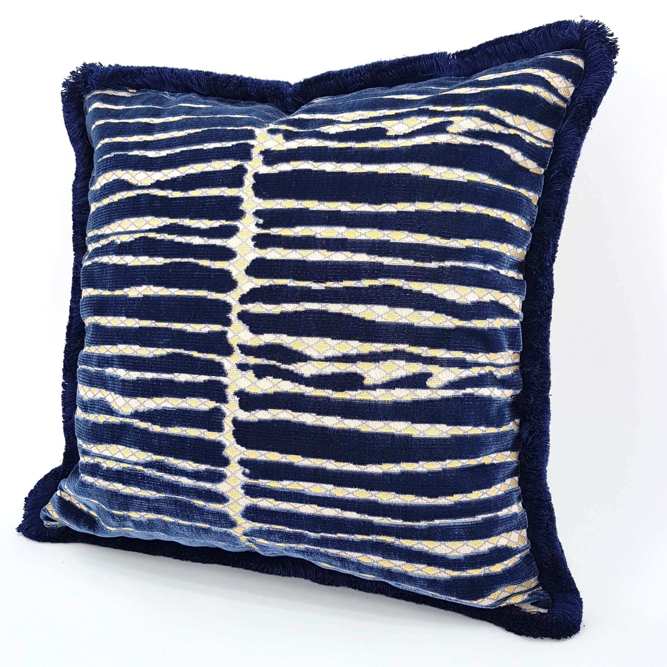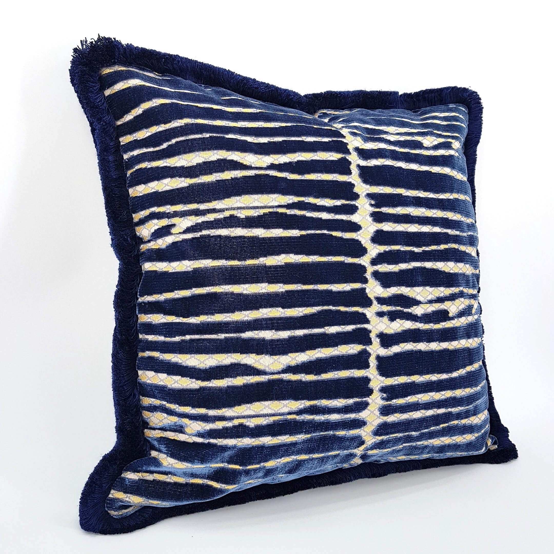 Handmade Decorative Pillow Made With With Brush Fringe Blue Jacquard Velvet Rubelli Fabric Modern Art Pattern