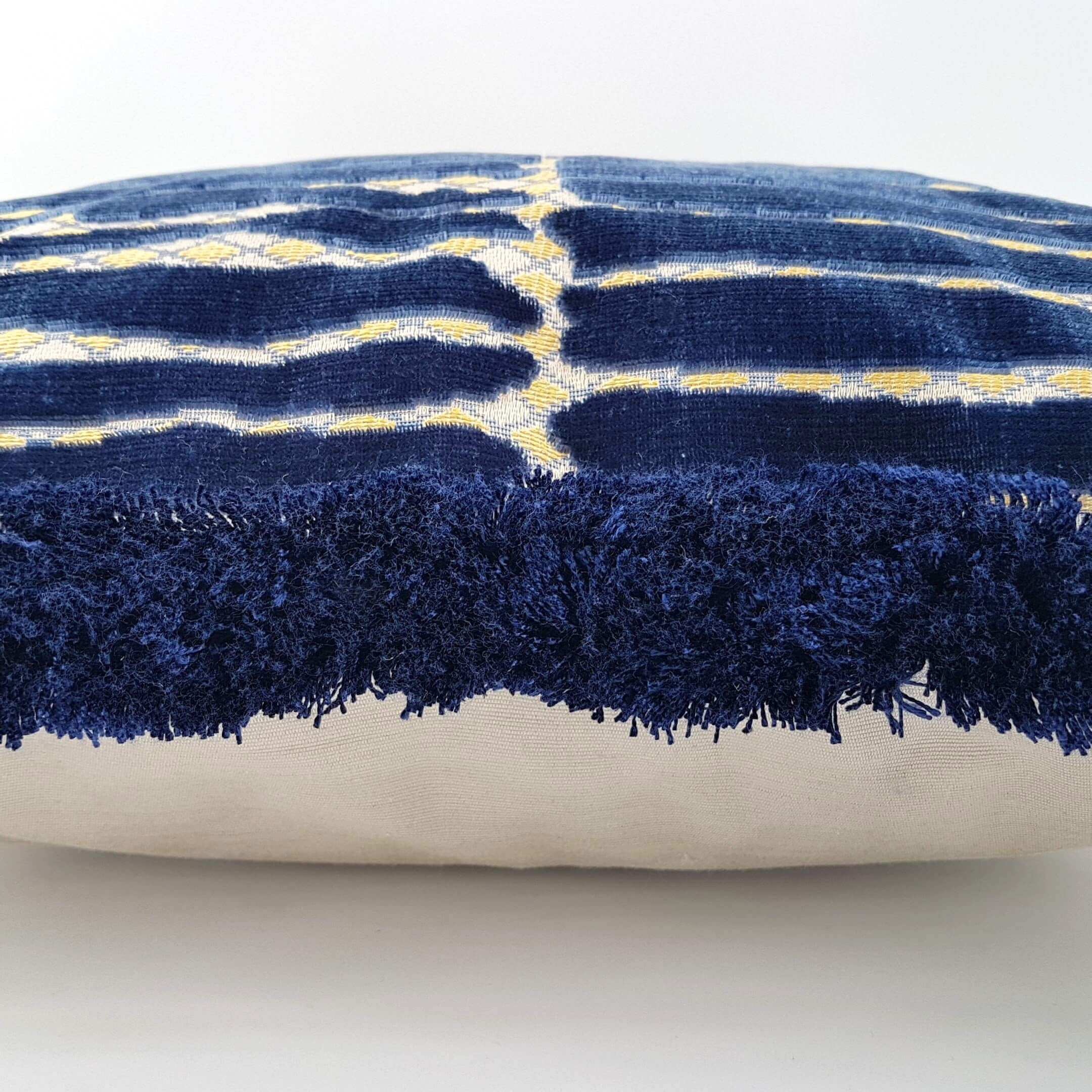 This customizable throw pillow case is handmade using Rubelli jacquard velvet - Modern Art pattern - in blue color embellished with blue brush fringe and the back of the pillow is made with grey Rubelli moiré linen.