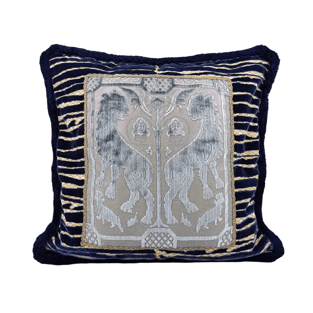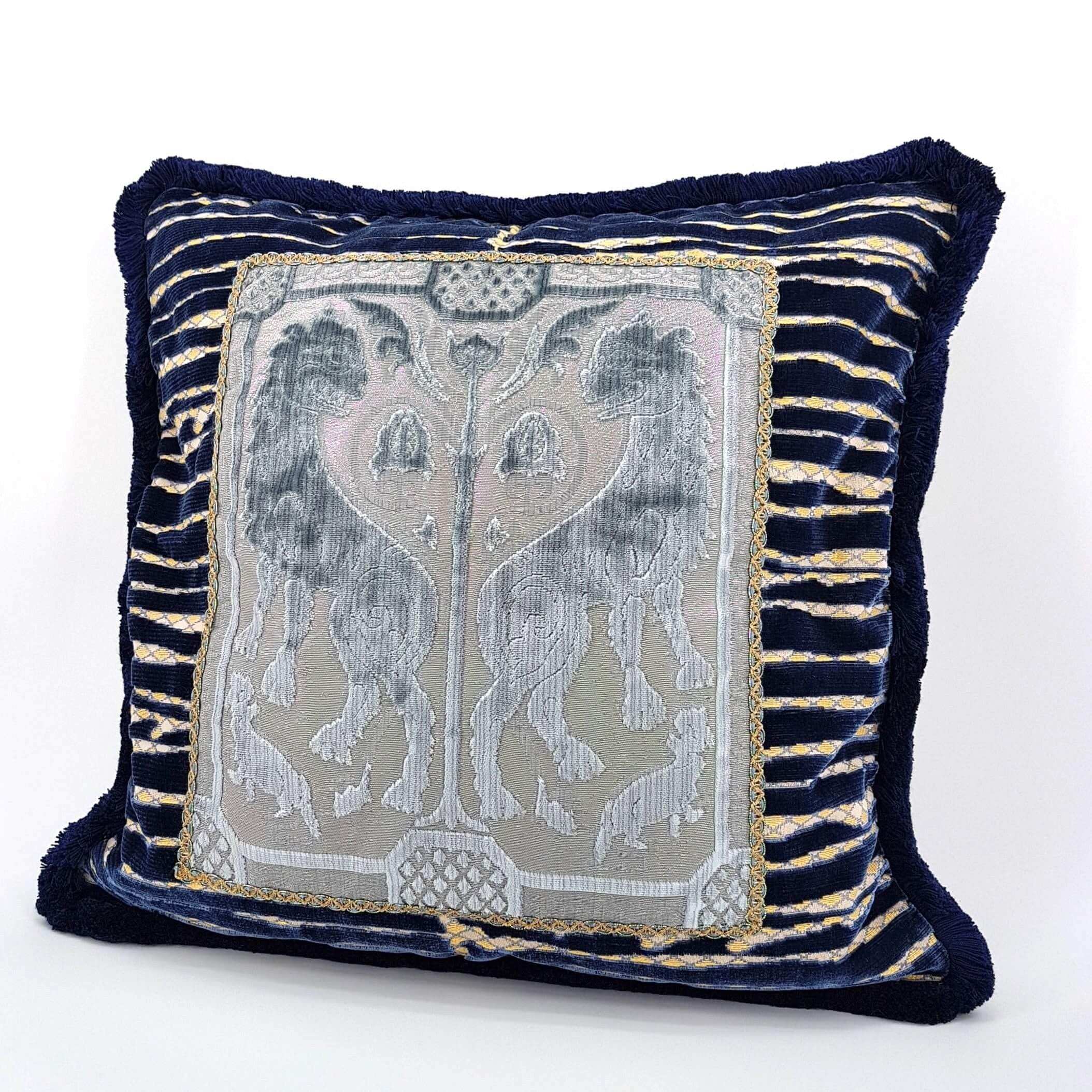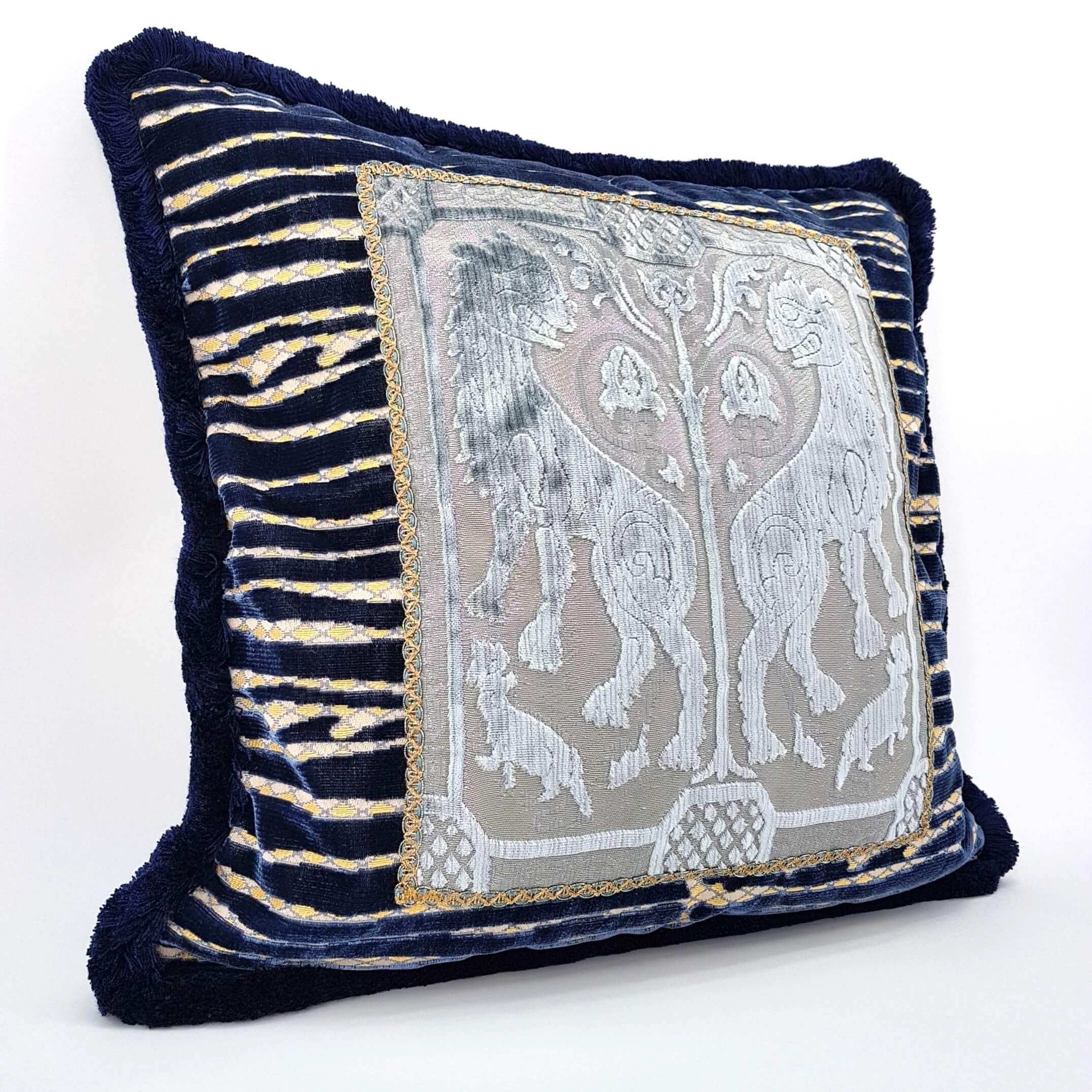 This customizable throw pillow case with blue brush fringe is handmade using Rubelli jacquard velvet - Modern Art pattern - in blue color embellished with front positioned panel in Luigi Bevilacqua sky blue silk heddle velvet "Leoni Bizantini" motif framed with flat silver blue and gold trim. The back of the pillow is made with grey Rubelli moiré linen.