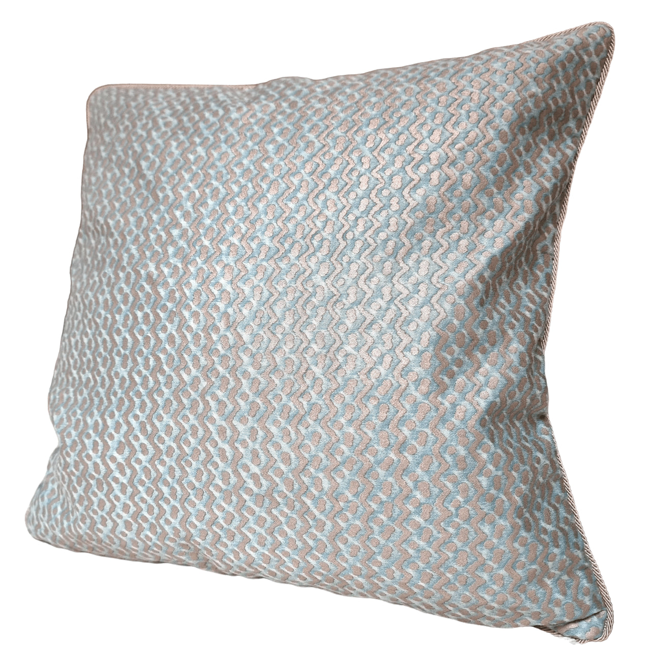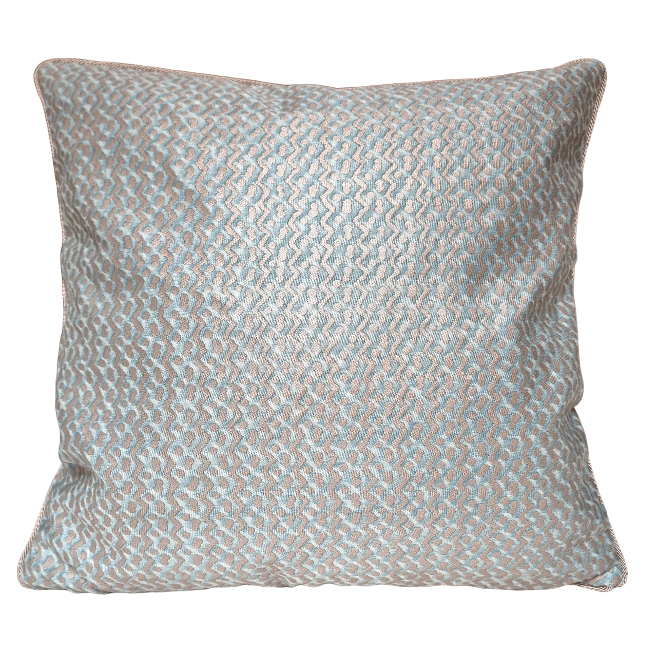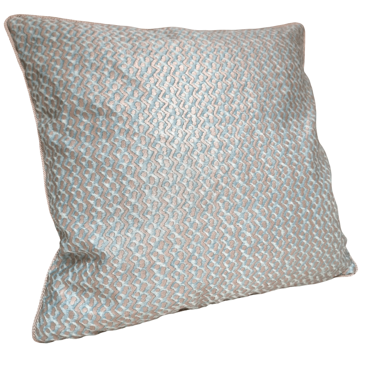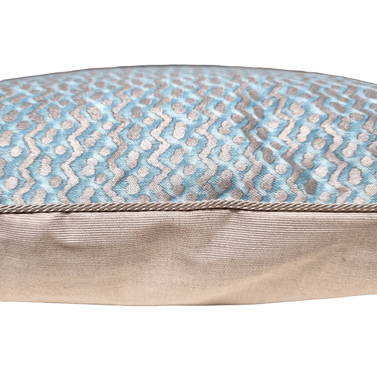 Handmade Decorative Pillow Made With Fortuny Fabric – Aquamarine & Silvery Gold Tapa Pattern