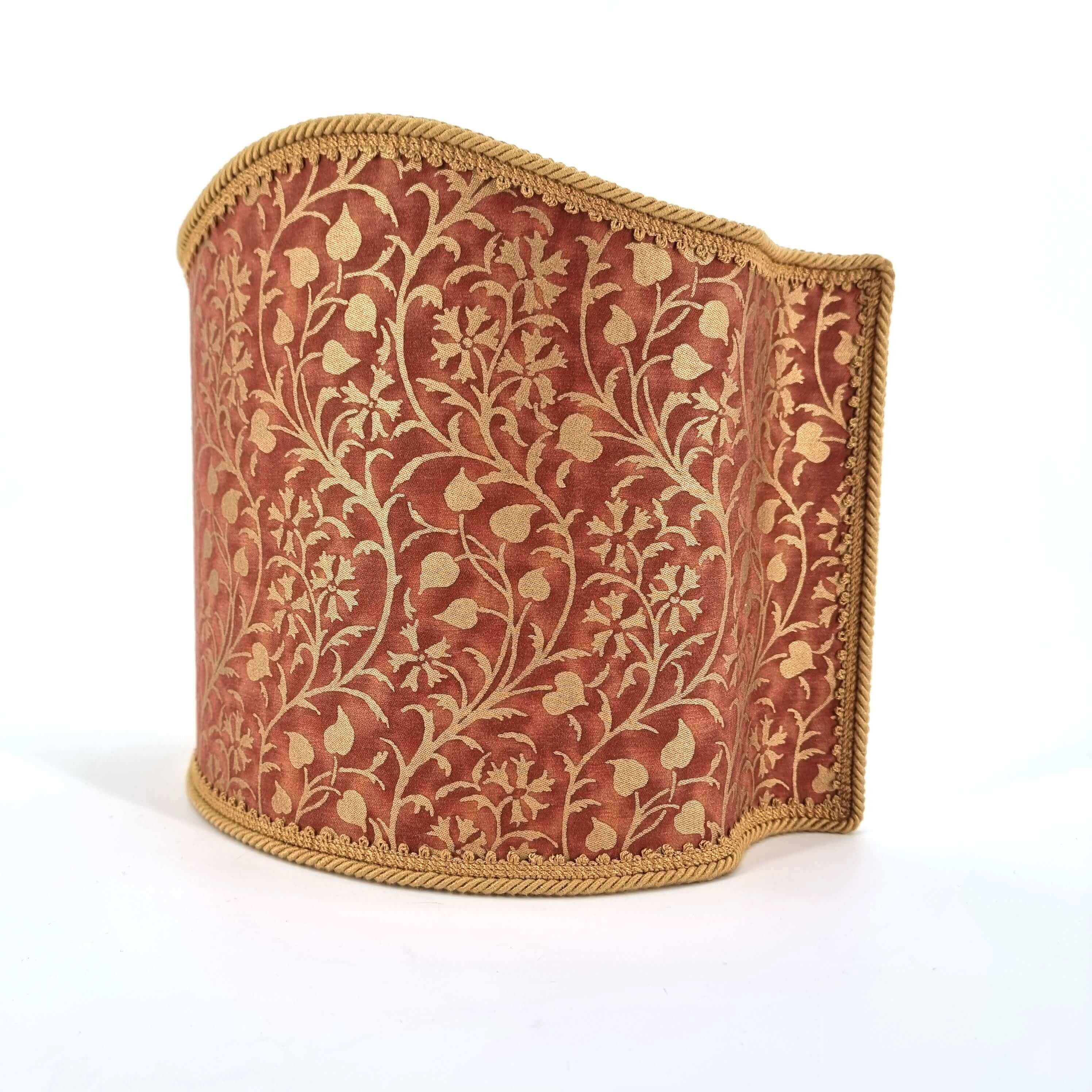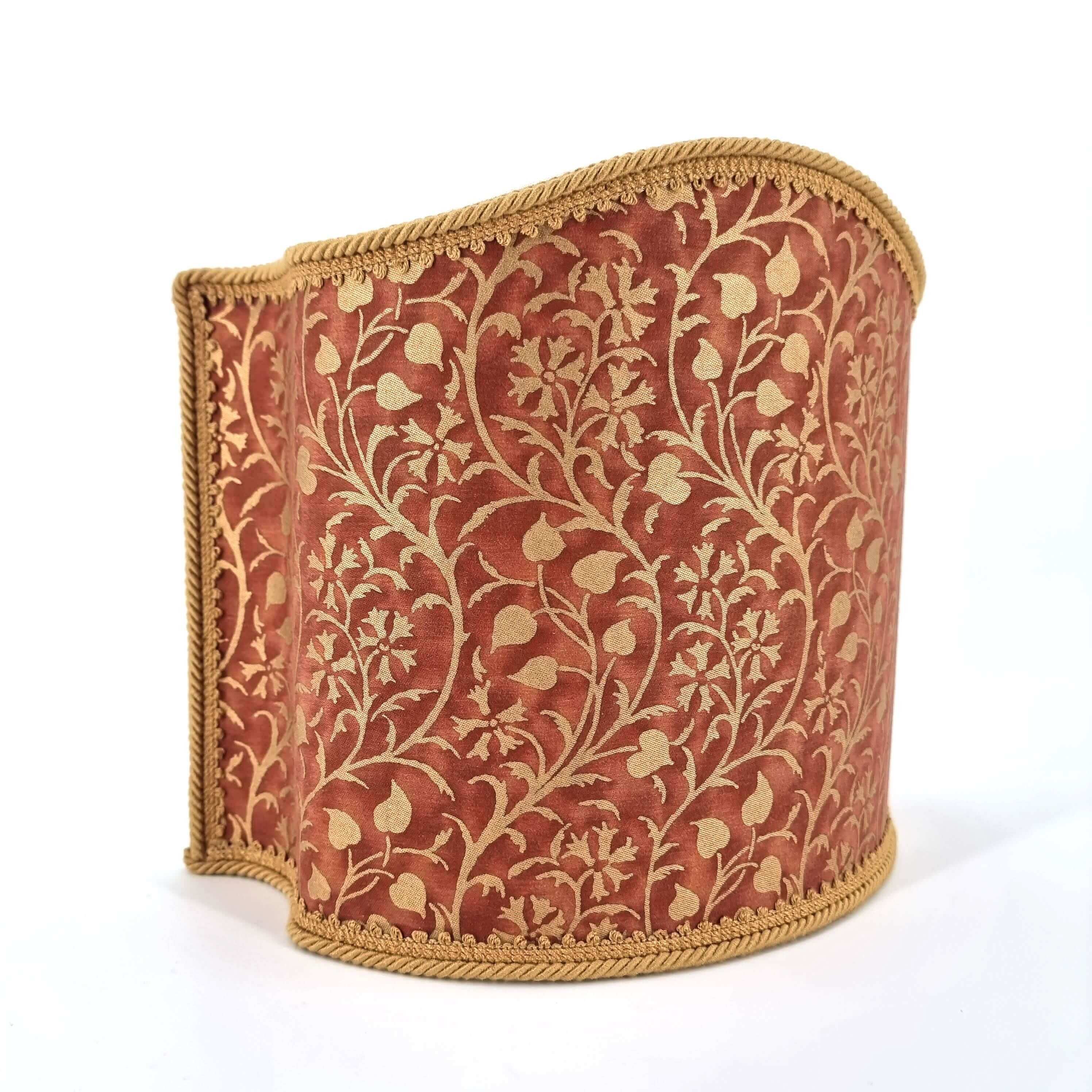 This customizable venetian Venetian lampshade is handmade using Mariano Fortuny handprinted fabric - Granada pattern - in burgundy & gold color, finished with gold trim