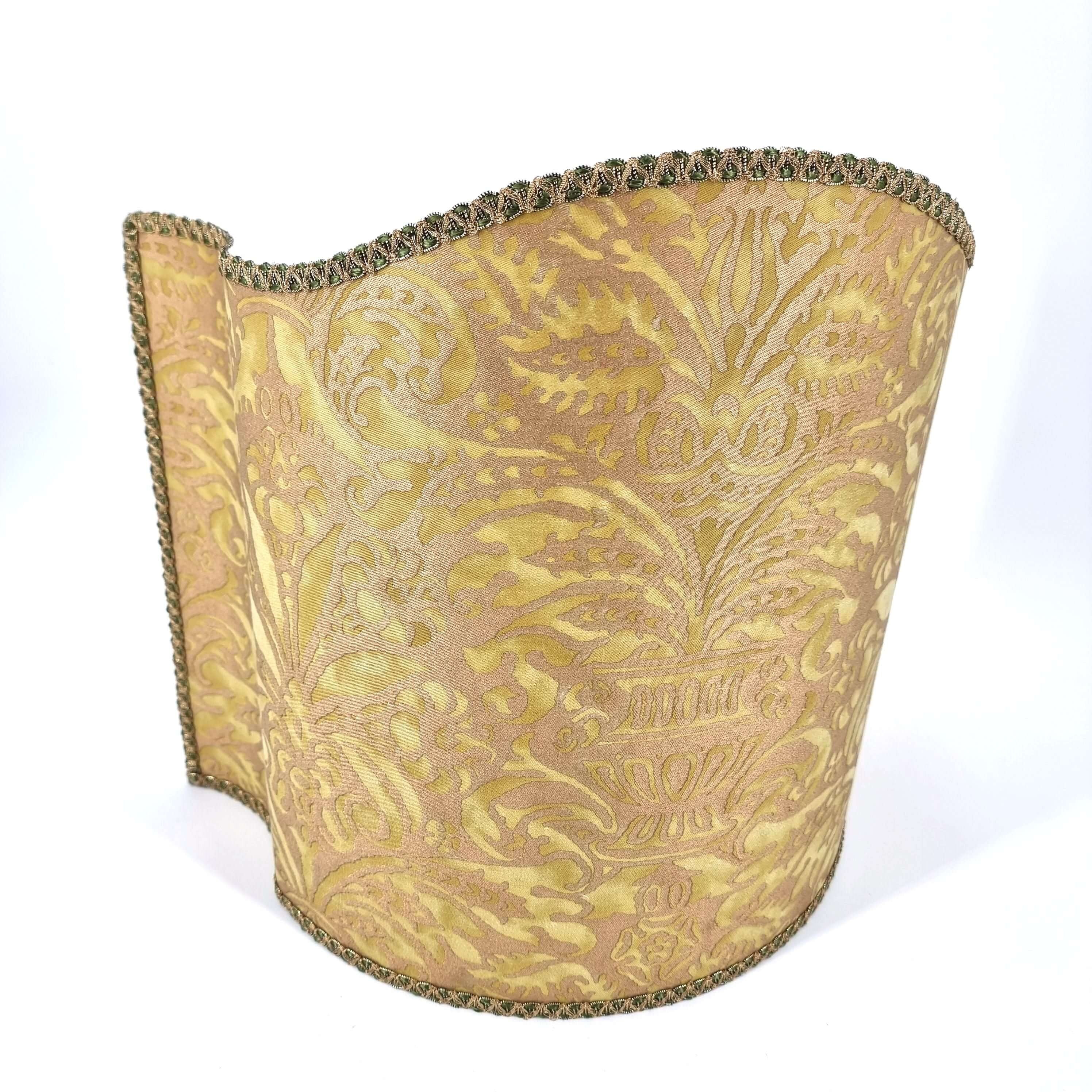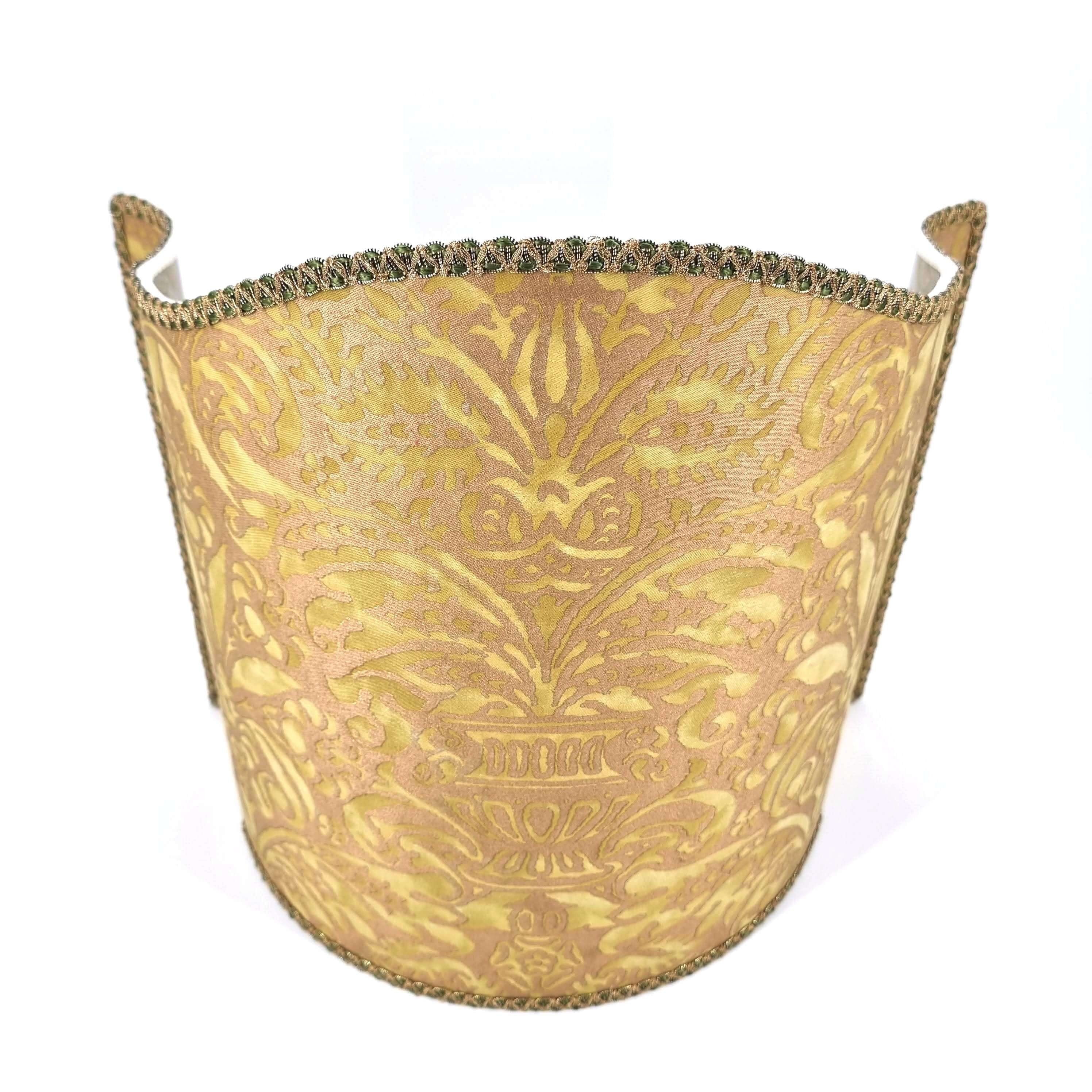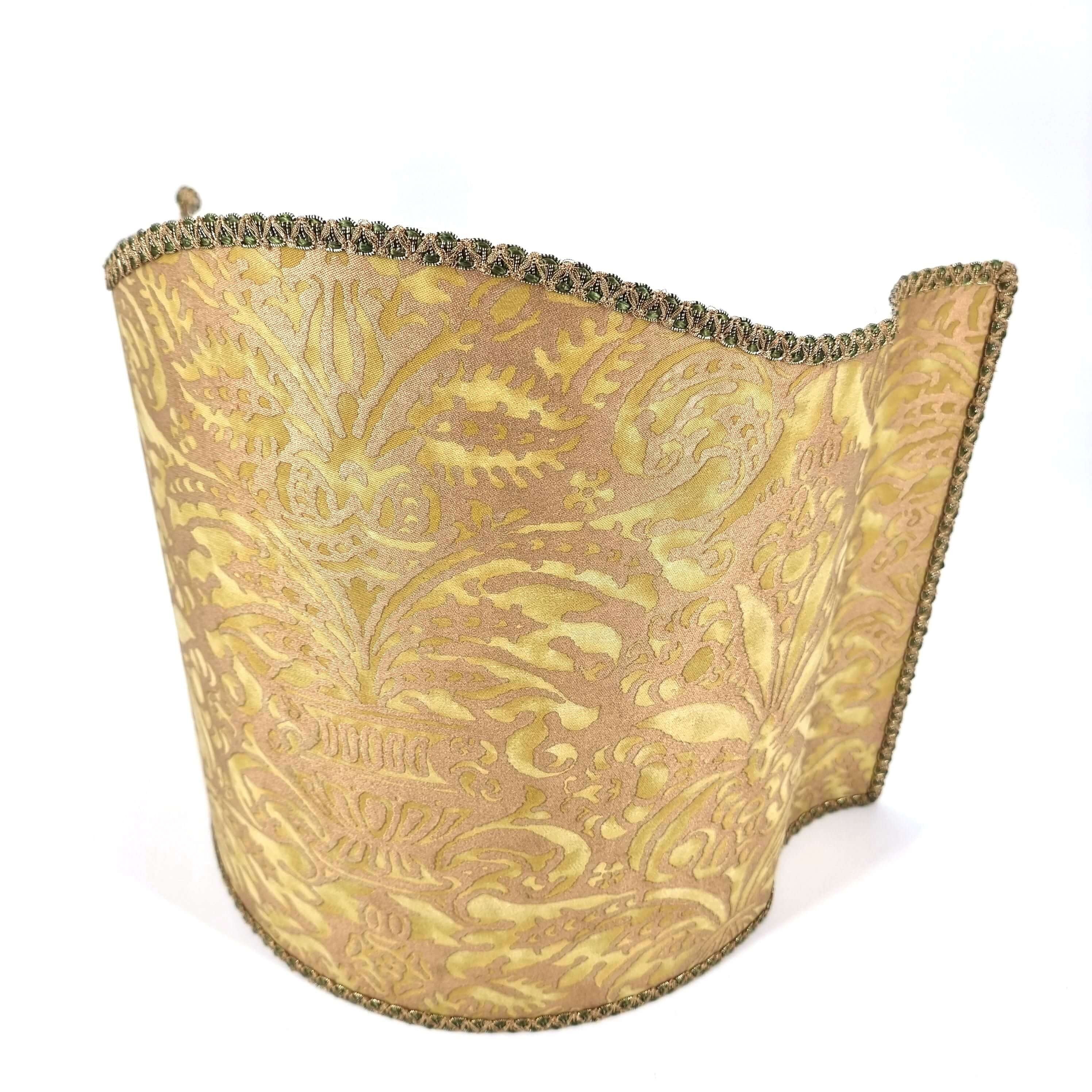 This customizable venetian lamp shade is handmade using Fortuny fabric - Campanelle pattern - in seafoam green and silvery gold color, finished with green and gold trim