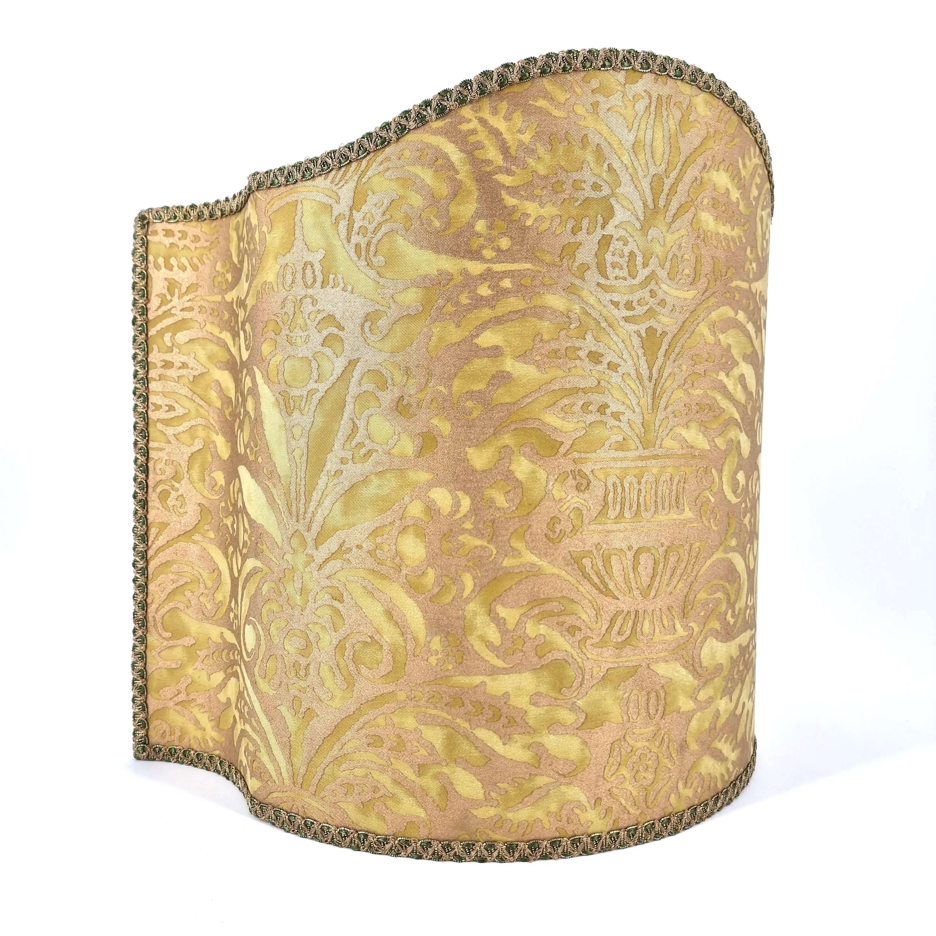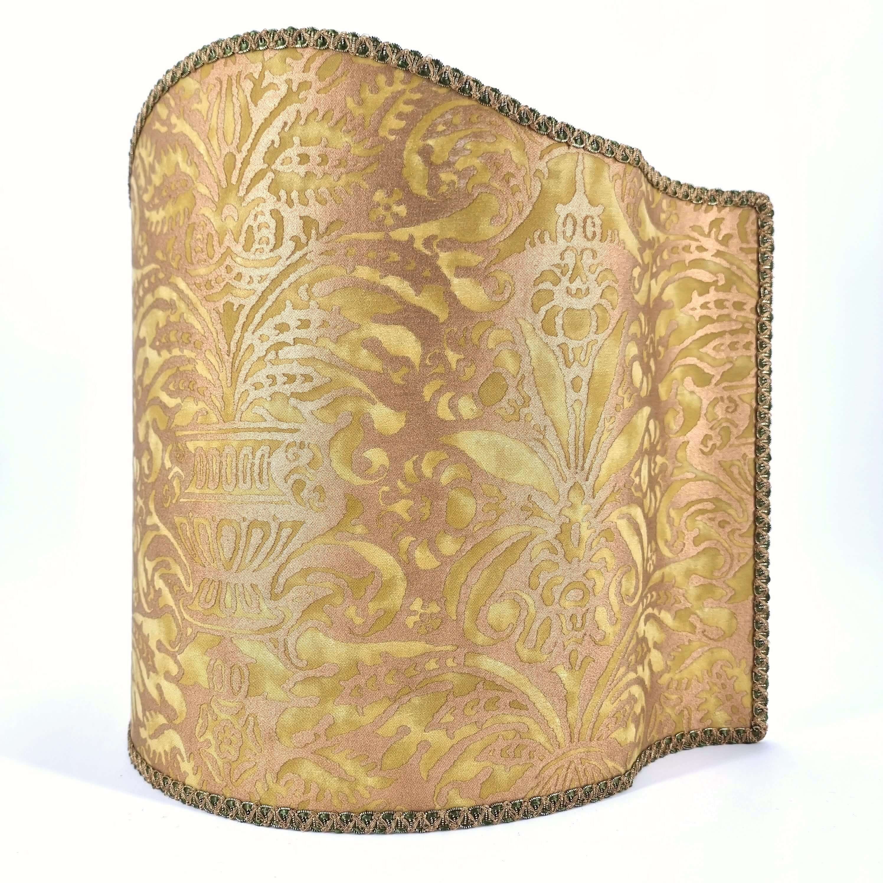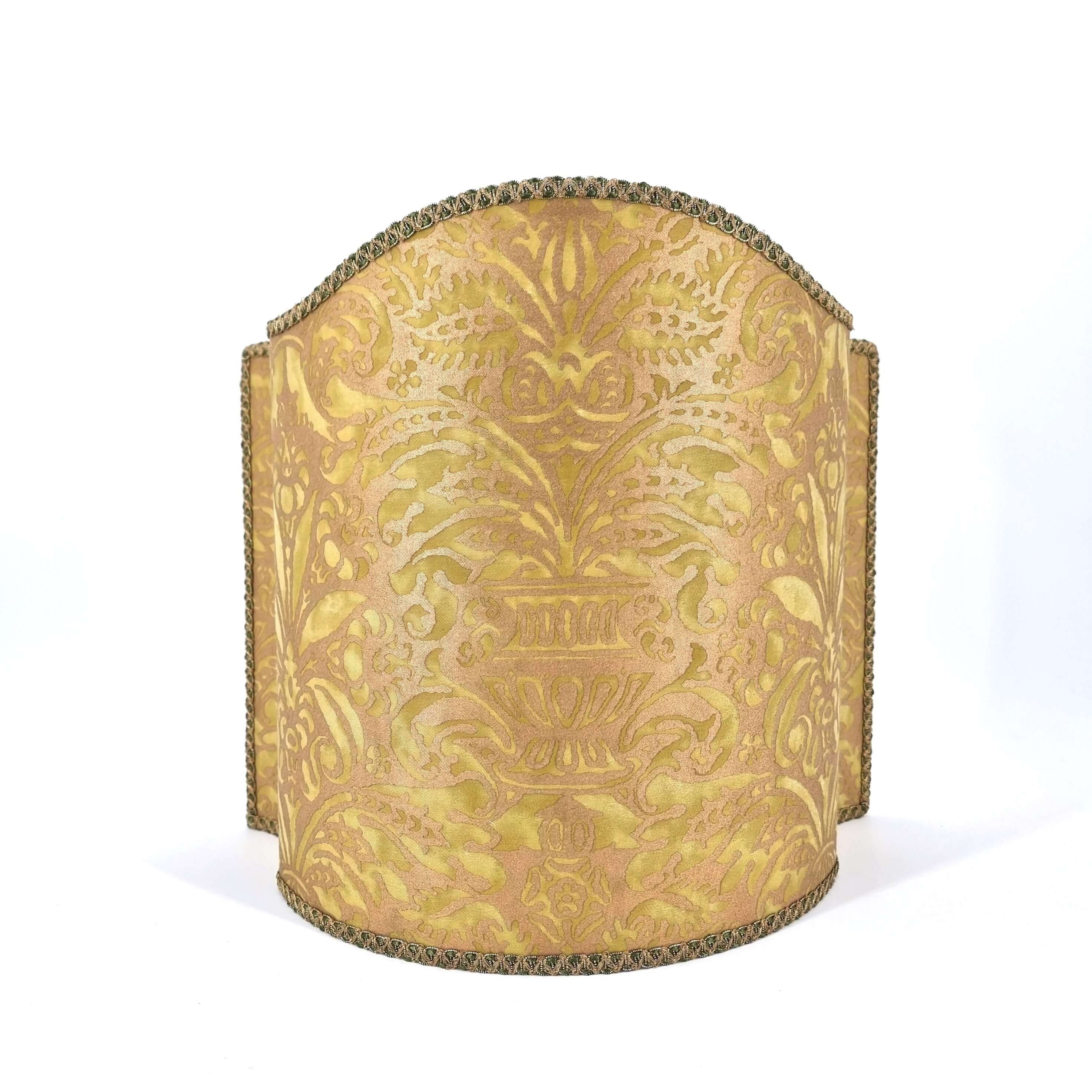 This customizable venetian lamp shade is handmade using Fortuny fabric - Campanelle pattern - in seafoam green and silvery gold color, finished with green and gold trim